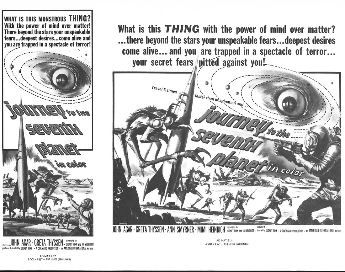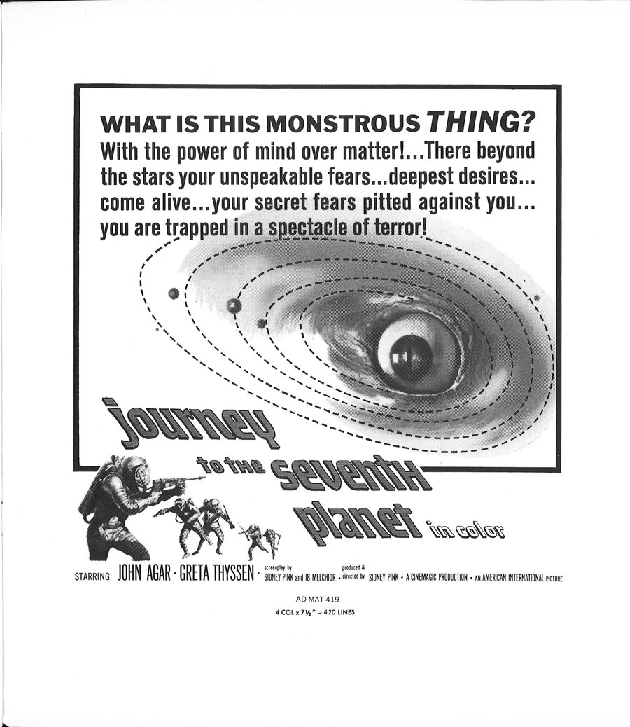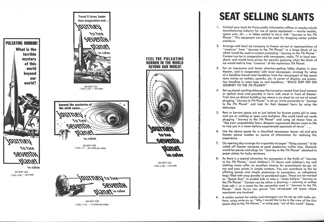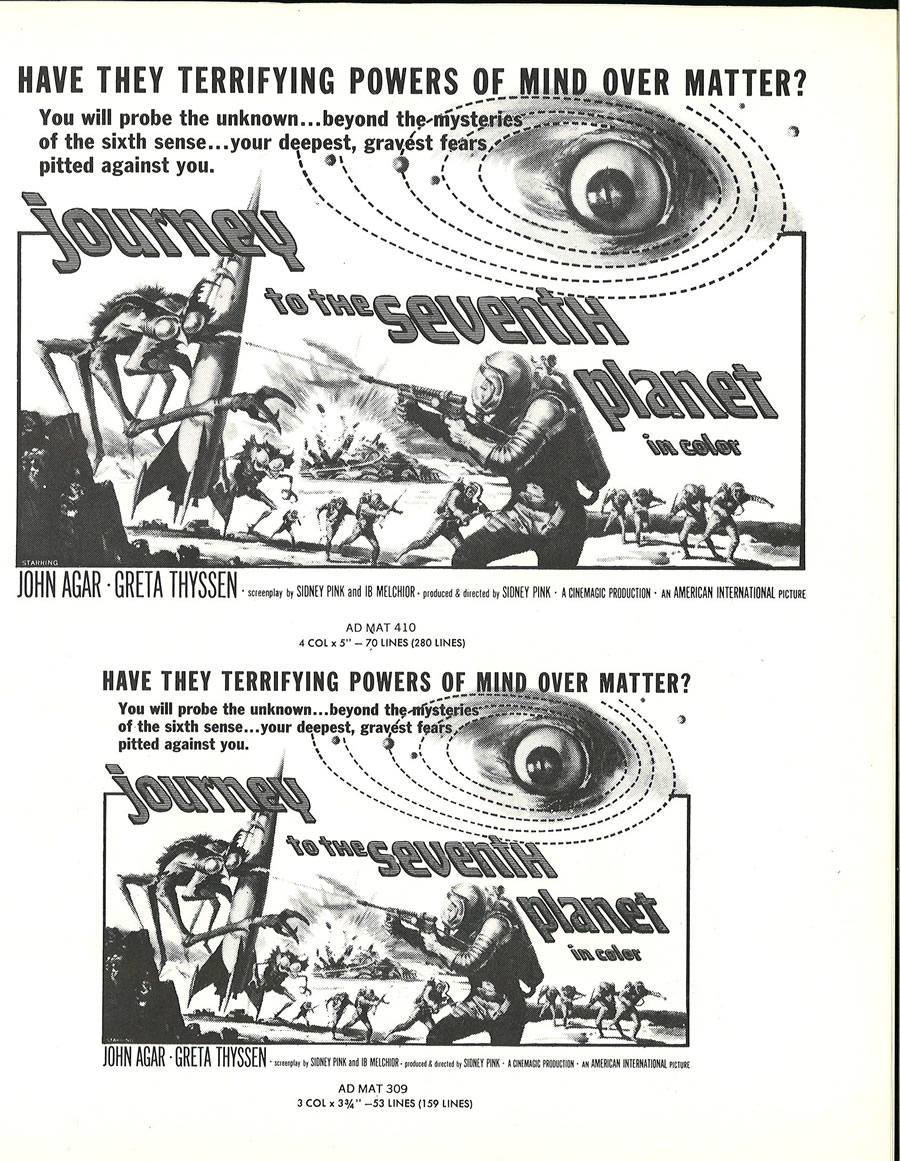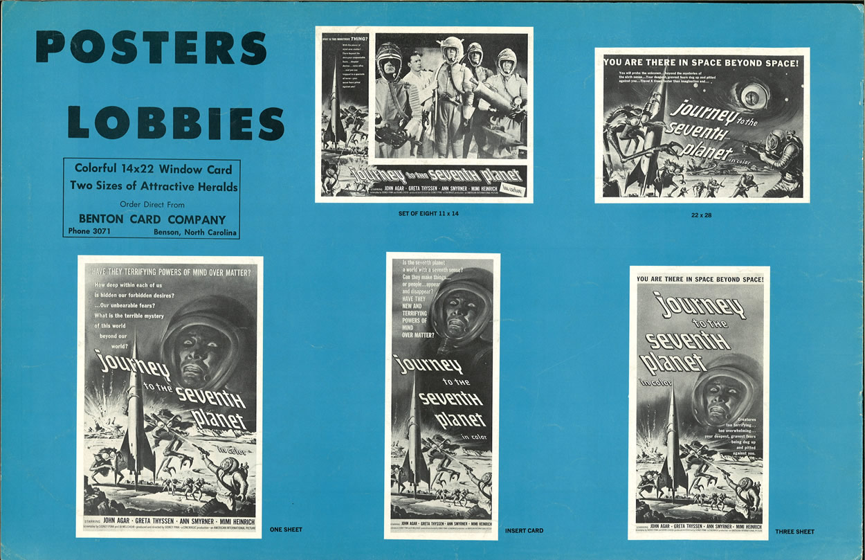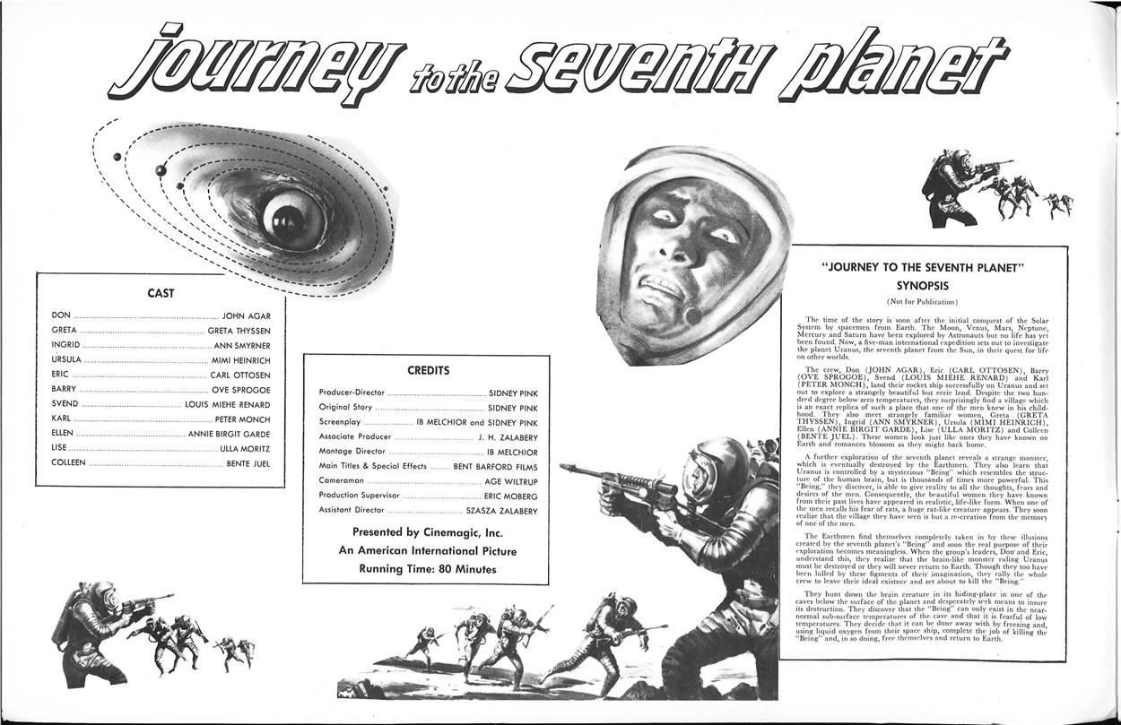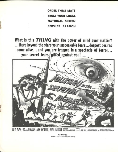 I had to split a few single pages into two scans, in order to make them readable, so this 11 x 17 inches pressbook, printed in landscape orientation, shows more pages than it actually contains. The poster art is to die for. Journey to the Seventh Planet is one of my guilty favorites as a youngster. I never failed to watch it when it was on network television. One interesting tidbit: Roger Corman's Galaxy of Terror uses the same plot device: space men encountering their worst fears on a distant planet.
