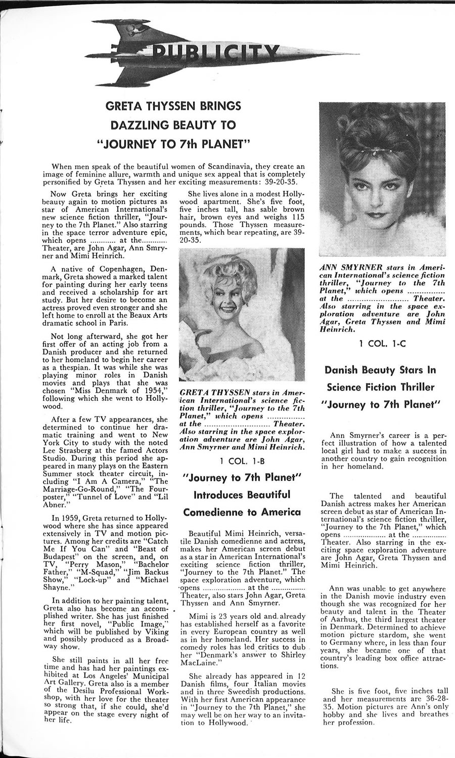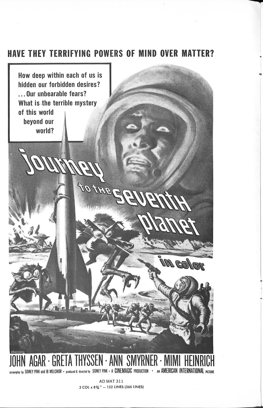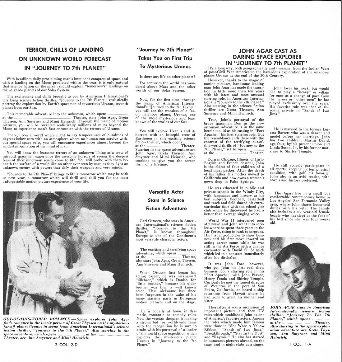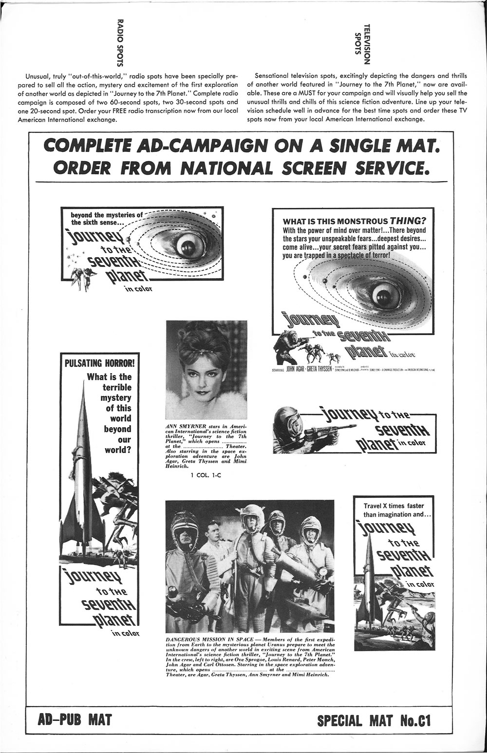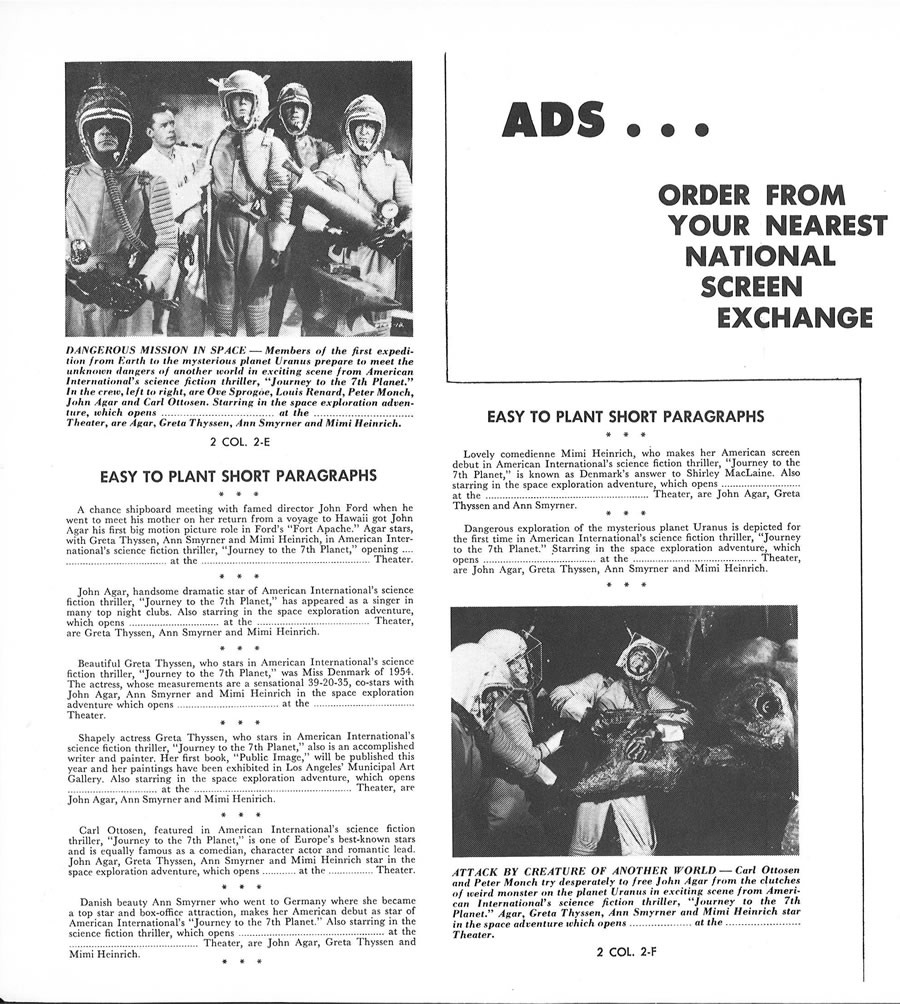 I had to split a few single pages into two scans, in order to make them readable, so this 11 x 17 inches pressbook, printed in landscape orientation, shows more pages than it actually contains. The poster art is to die for. Journey to the Seventh Planet is one of my guilty favorites as a youngster. I never failed to watch it when it was on network television. One interesting tidbit: Roger Corman's Galaxy of Terror uses the same plot device: space men encountering their worst fears on a distant planet.