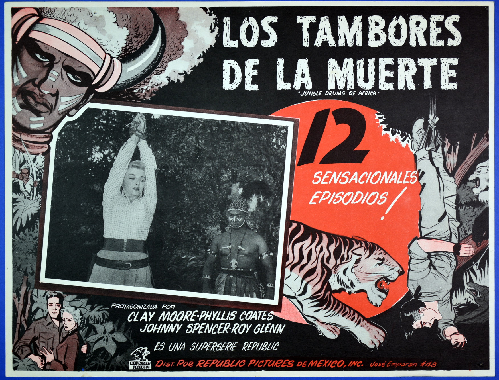 A menacing inset scene and carefully arranged border illustration, along with an intriguing use of coloration, make this Mexican lobby card for Jungle Drums of Africa a perfect example of how movies depicted the Dark Continent in the 1950s: full of mystery and menace. Quick, what's the single theme every jungle movie from the 1940s to 1950s always seemed to peg its script on? My answer: outsiders pissing off the locals enough to cause much harm and mayhem. From comedies to jungle dramas, hapless visitors and belligerent natives were the usual payoffs. Not surprisingly, many horror movies follow this same theme.