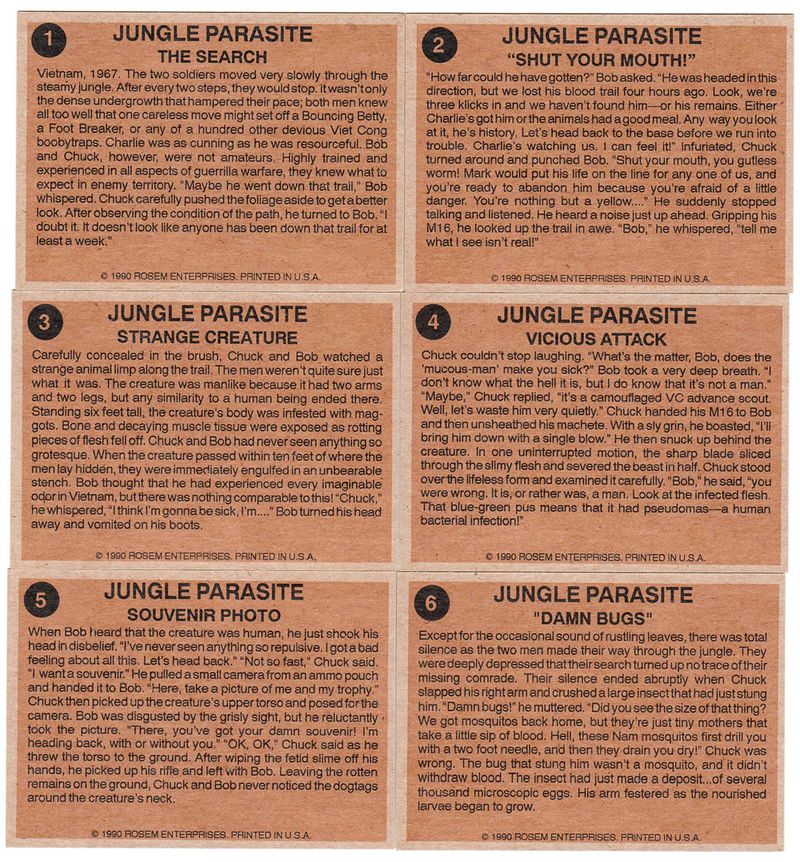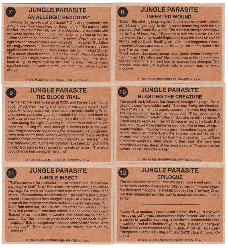 Trading Cards: Midnight Madness, Jungle Parasite Leave a Comment / Trading Cards / By JM Cozzoli Here is the twelve card set for Jungle Parasite from Rosem’s Midnight Madness Card Set. Story is by Steve Kiviat, and illustrations by Alfredo Osorio. (Copyright 1990 by Rosem Enterprises.) Like this:Like Loading... Share this post Facebook Twitter Pinterest Linkedin