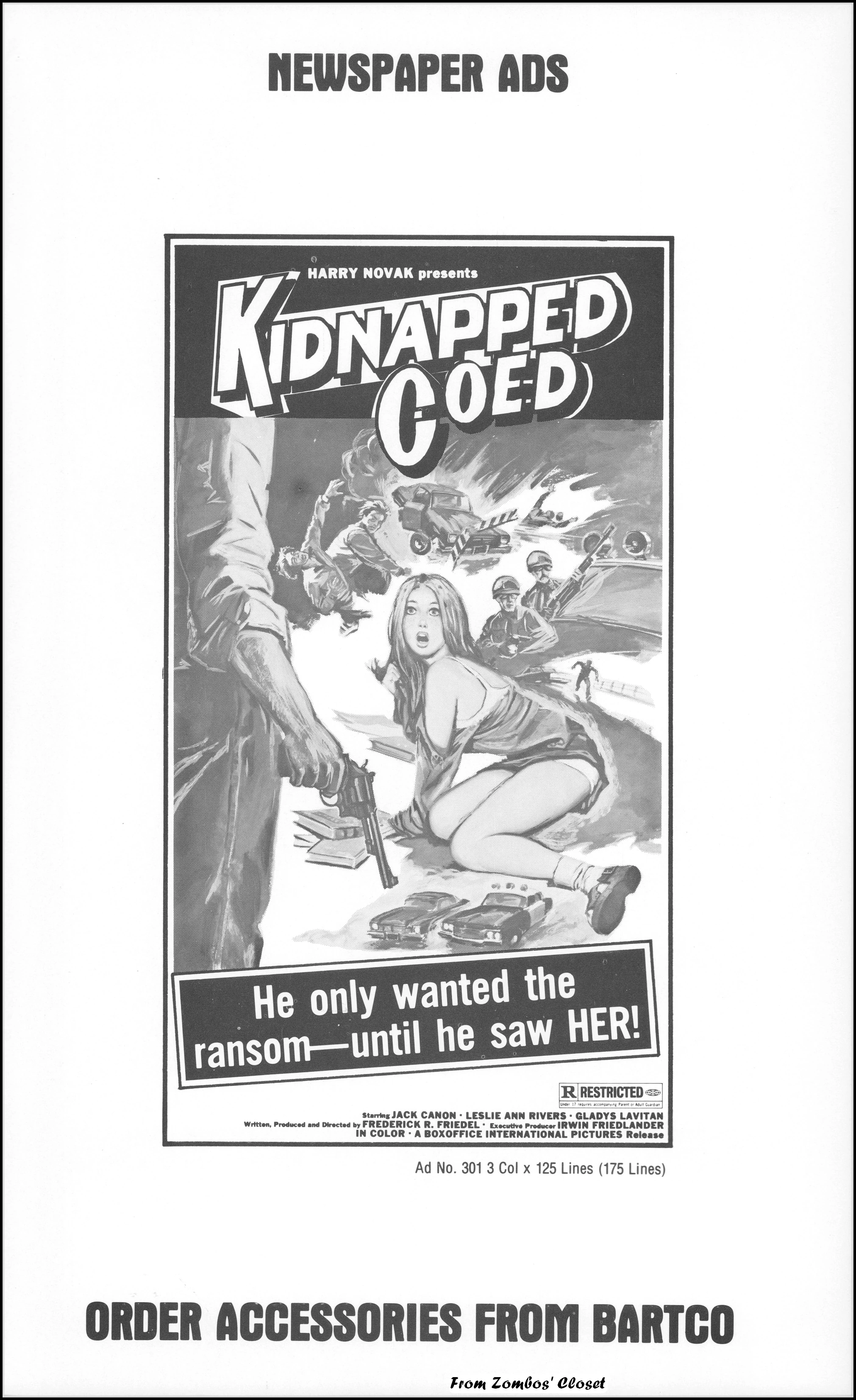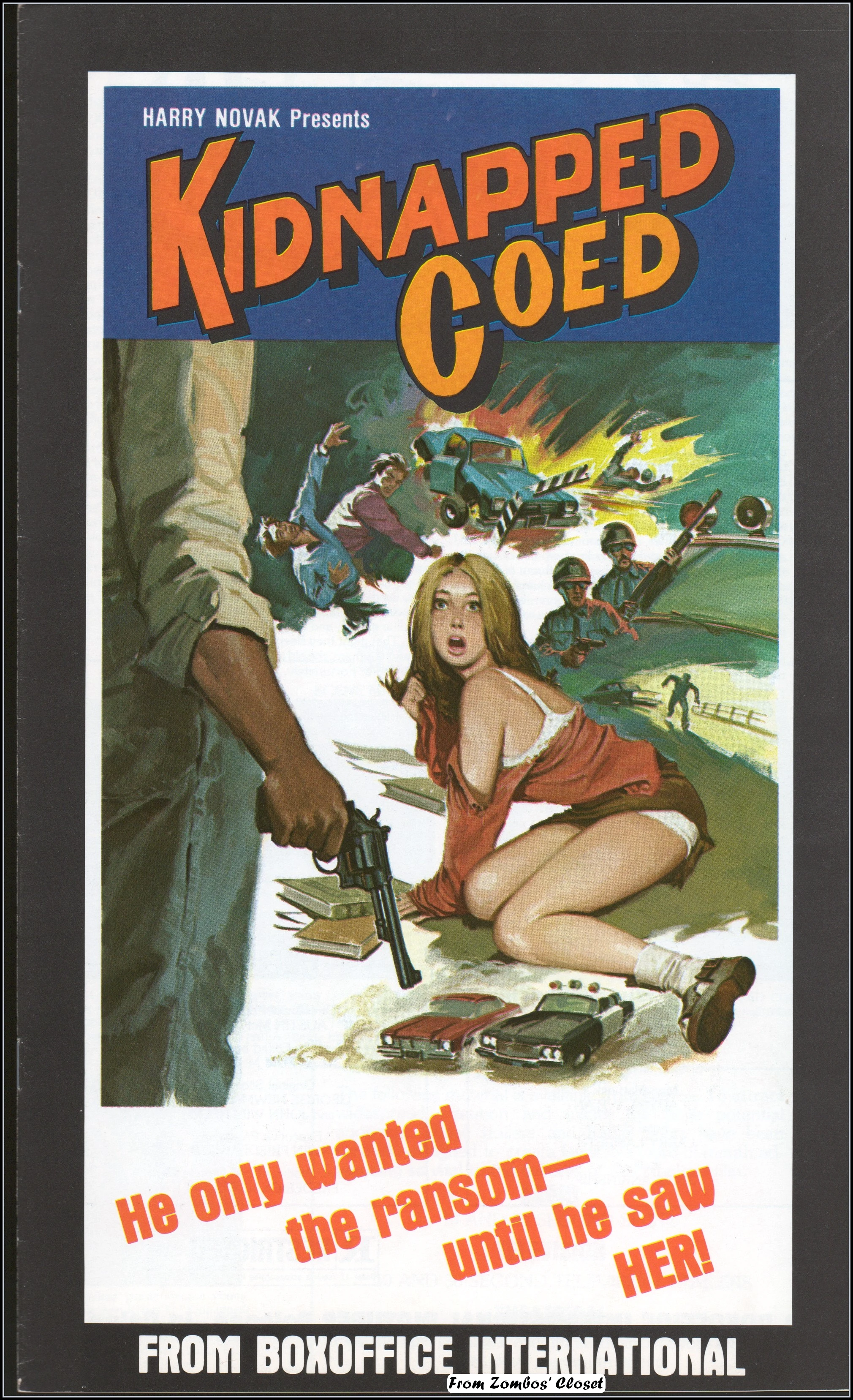 Kidnapped Coed, also known as Date with a Kidnapper, is a grindhouse (low budget, gritty, quickly shot) movie that was paired with Axe, which made the video nasties list in the 1980s over in the UK, and Hitch Hike to Hell (1977) on double bills. Both were directed by Frederick R. Friedel. I’ve not watched either, yet, but Kidnapped is either ignored as a boring, not so action-packed, grindhouse effort or praised as a pensive meditation with some artsy flair and carefully planned tracking shots. Either way, I found the pressbook’s cover interesting enough to share it with you. It sells the exploitation and the leering quality that grindhouse should be edged with, art or not. I love that tagline too.