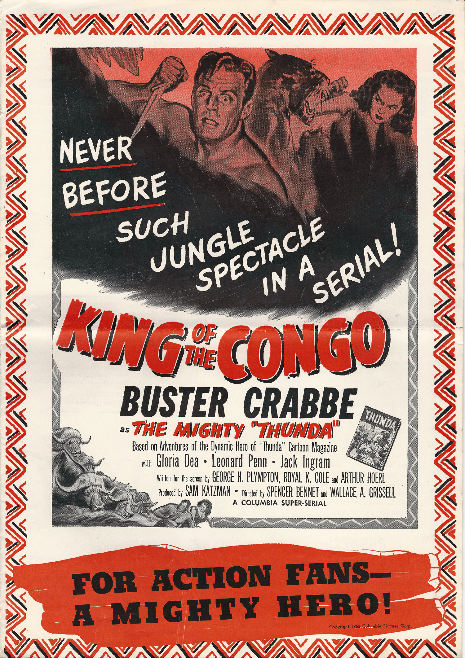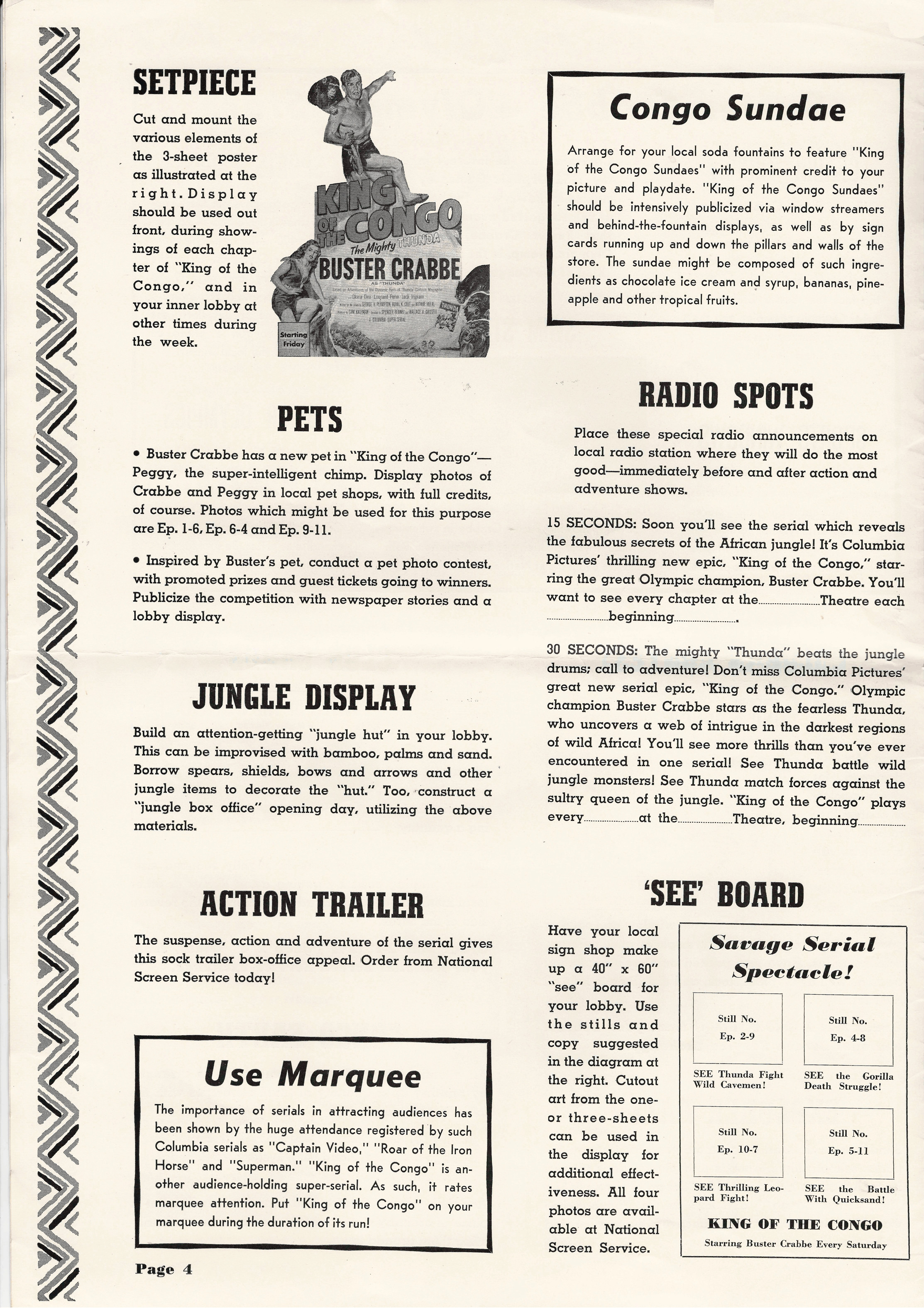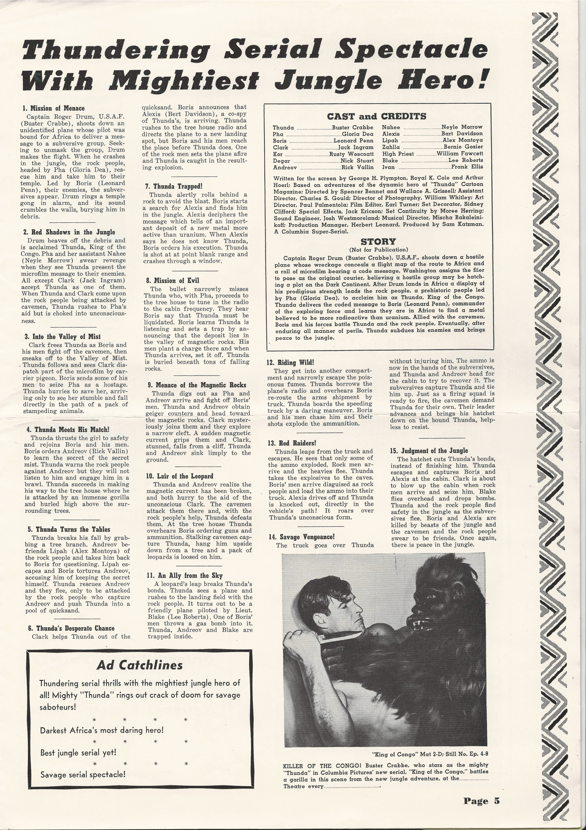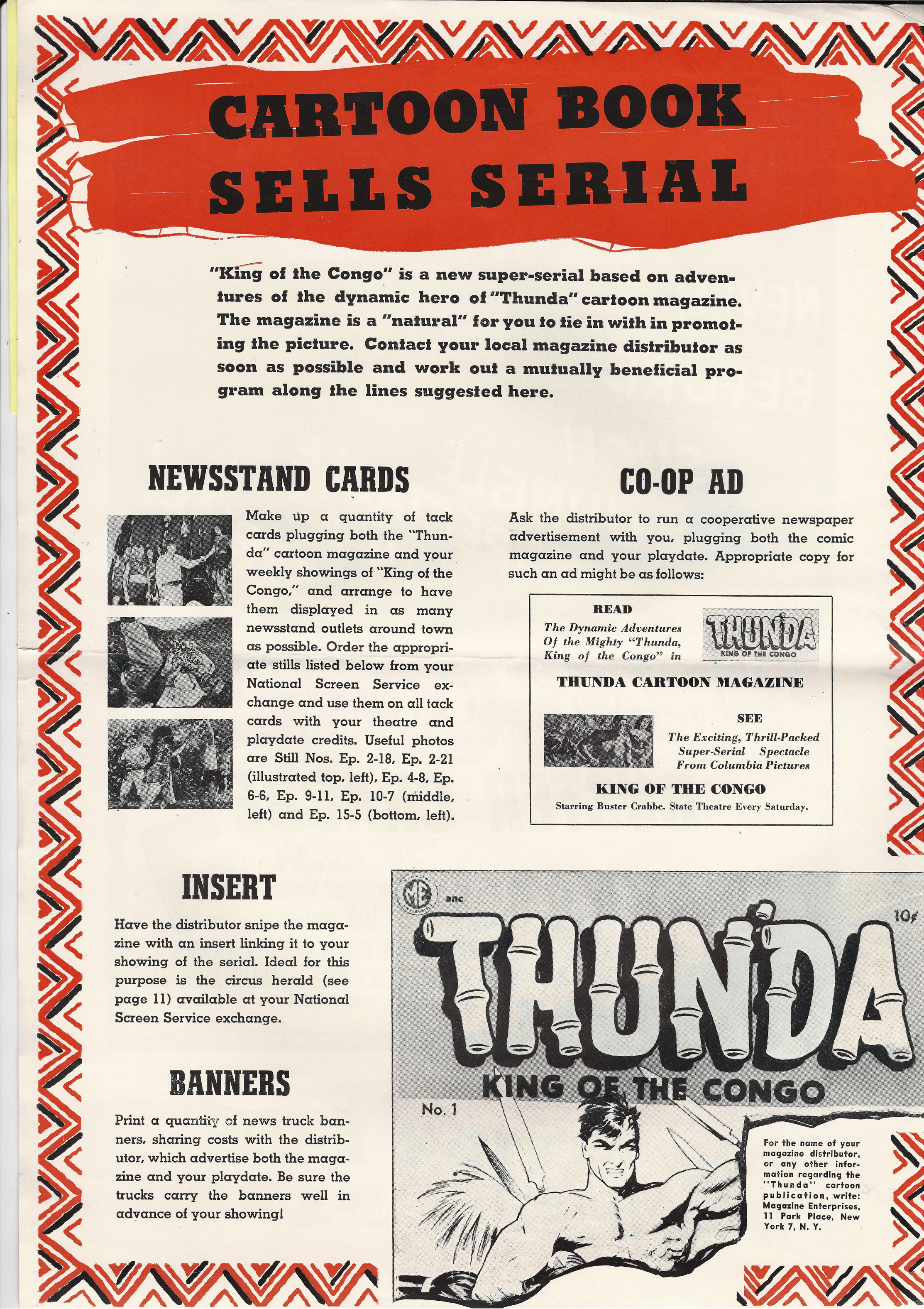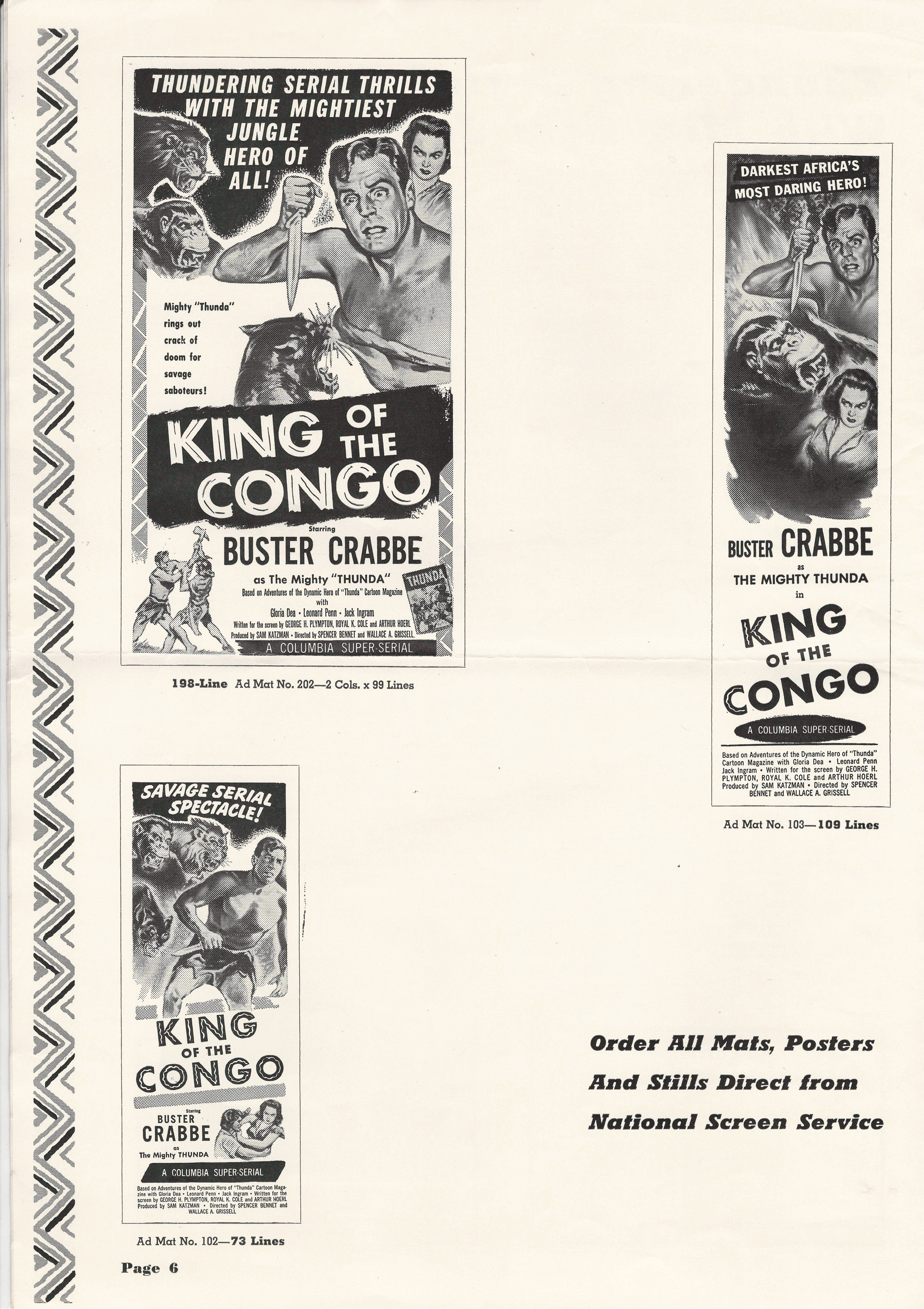 More jungle spectacle courtesy of Tony Rivers. He spotted these scans made by comic book fiend Bill Meugniot. This time, Buster Crabbe (Buck Rogers, Flash Gordon), takes a stab at it. Hold on to your loin cloth as the "Mighty Thunda" swings through the trees. Exciting poster art and lots of promotion can be found in the 12 pages of this pressbook, including a coloring page!