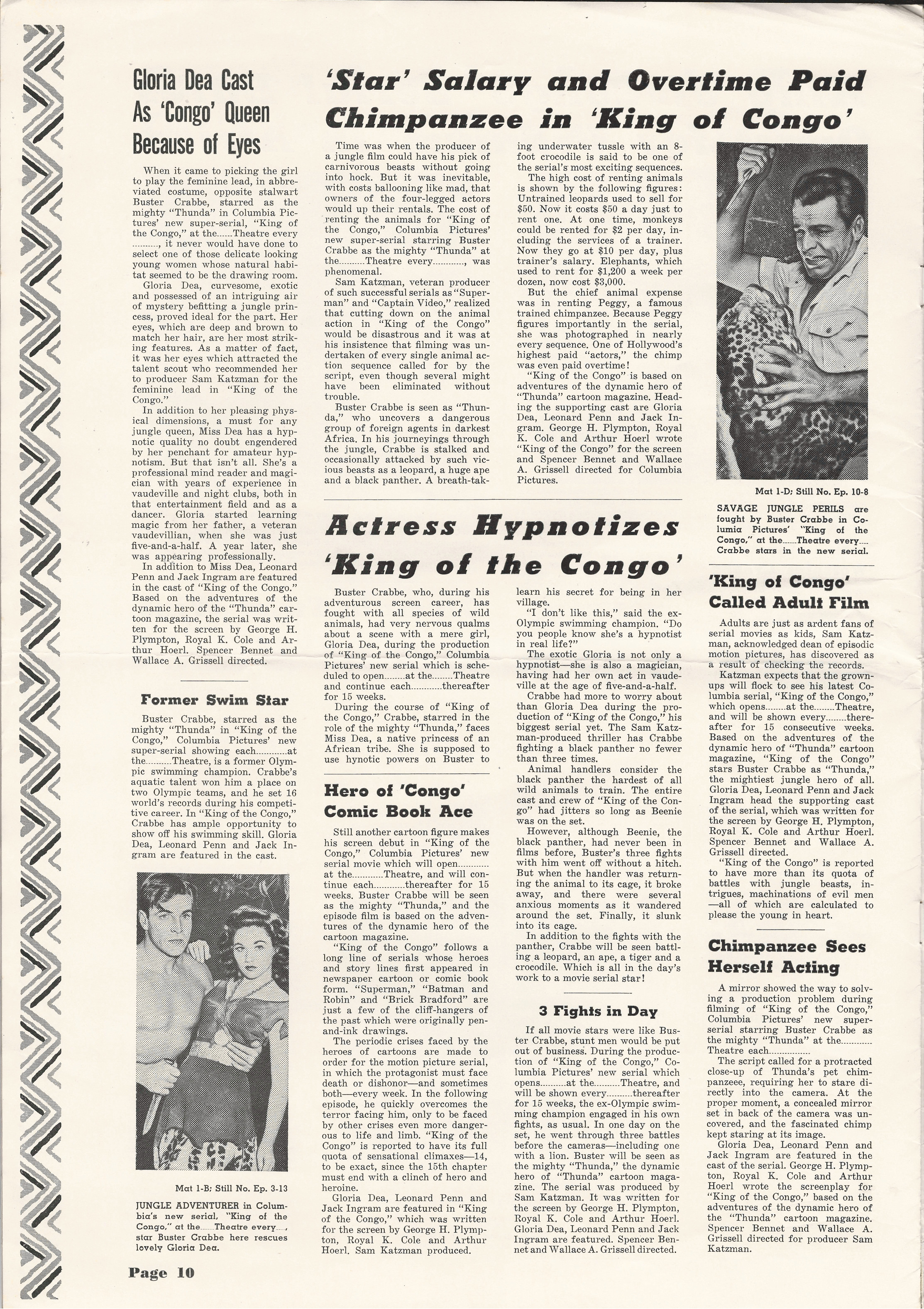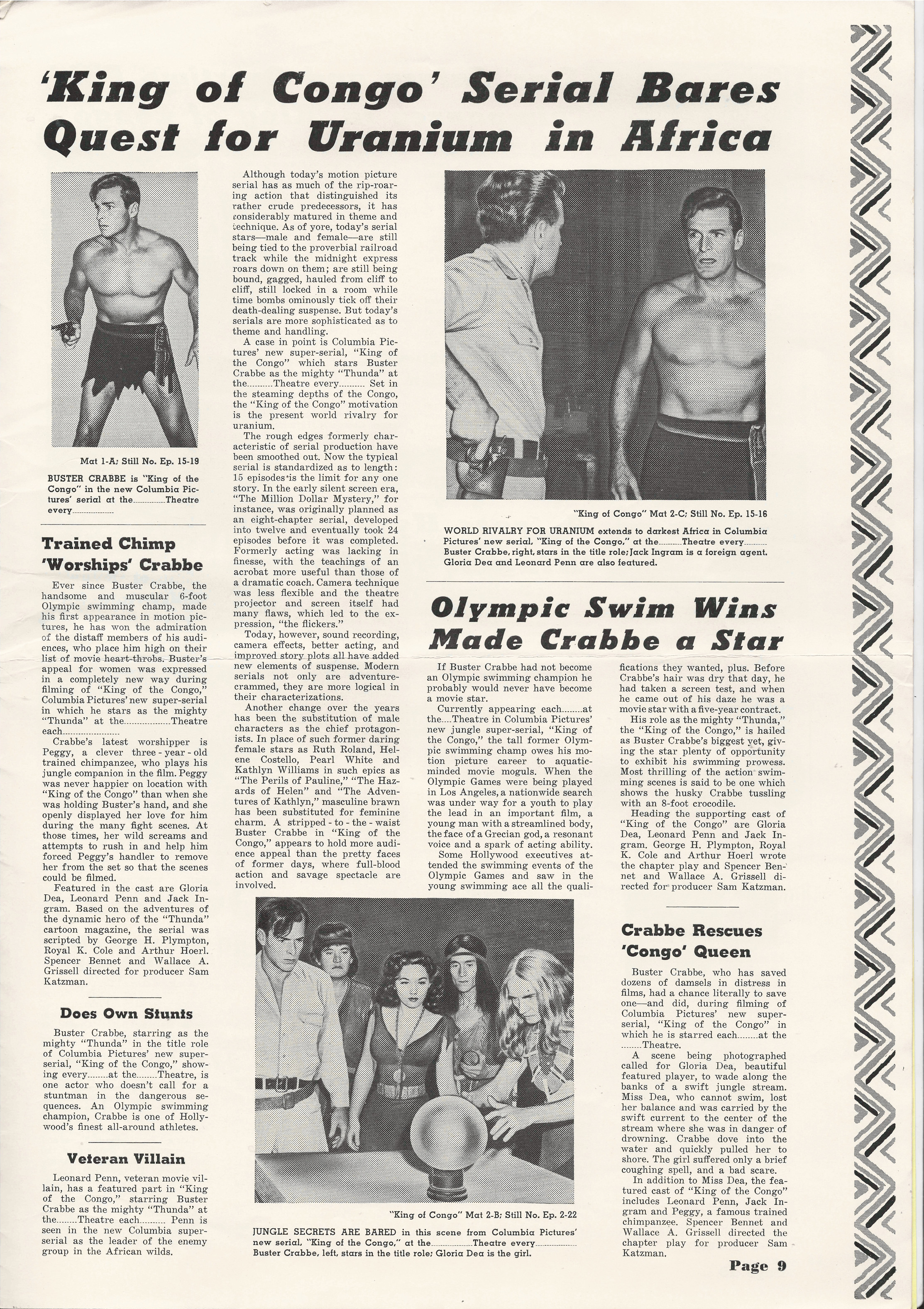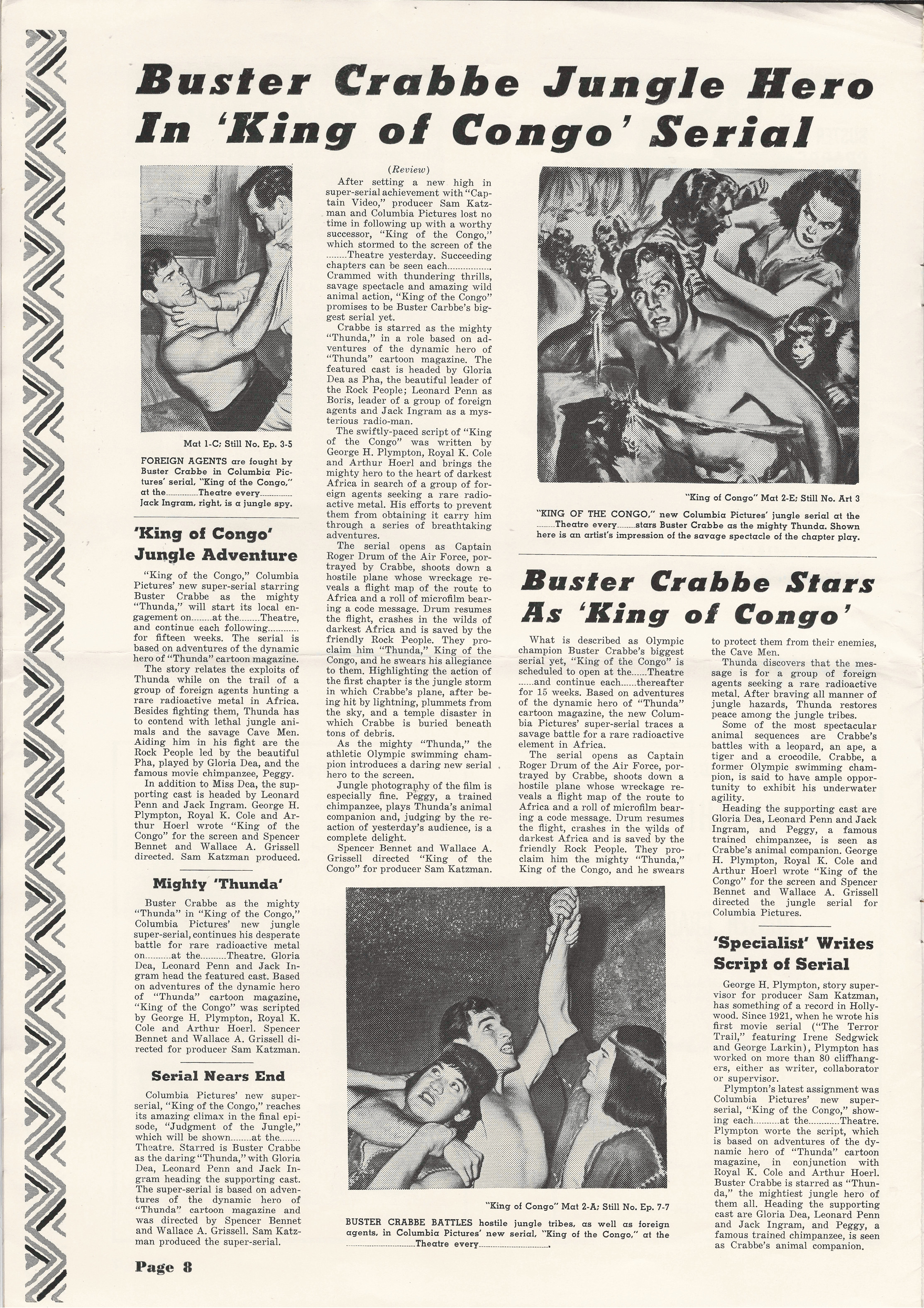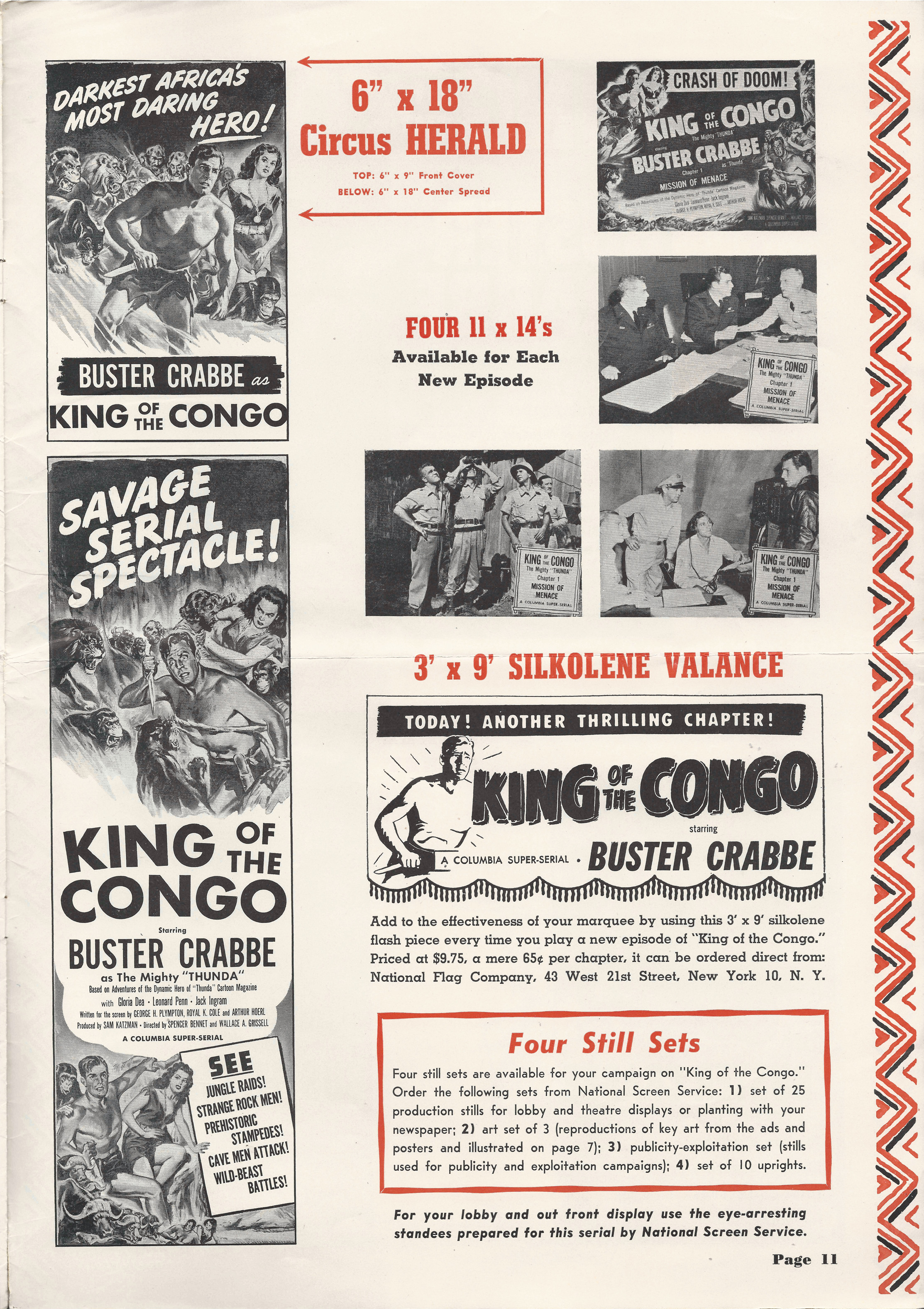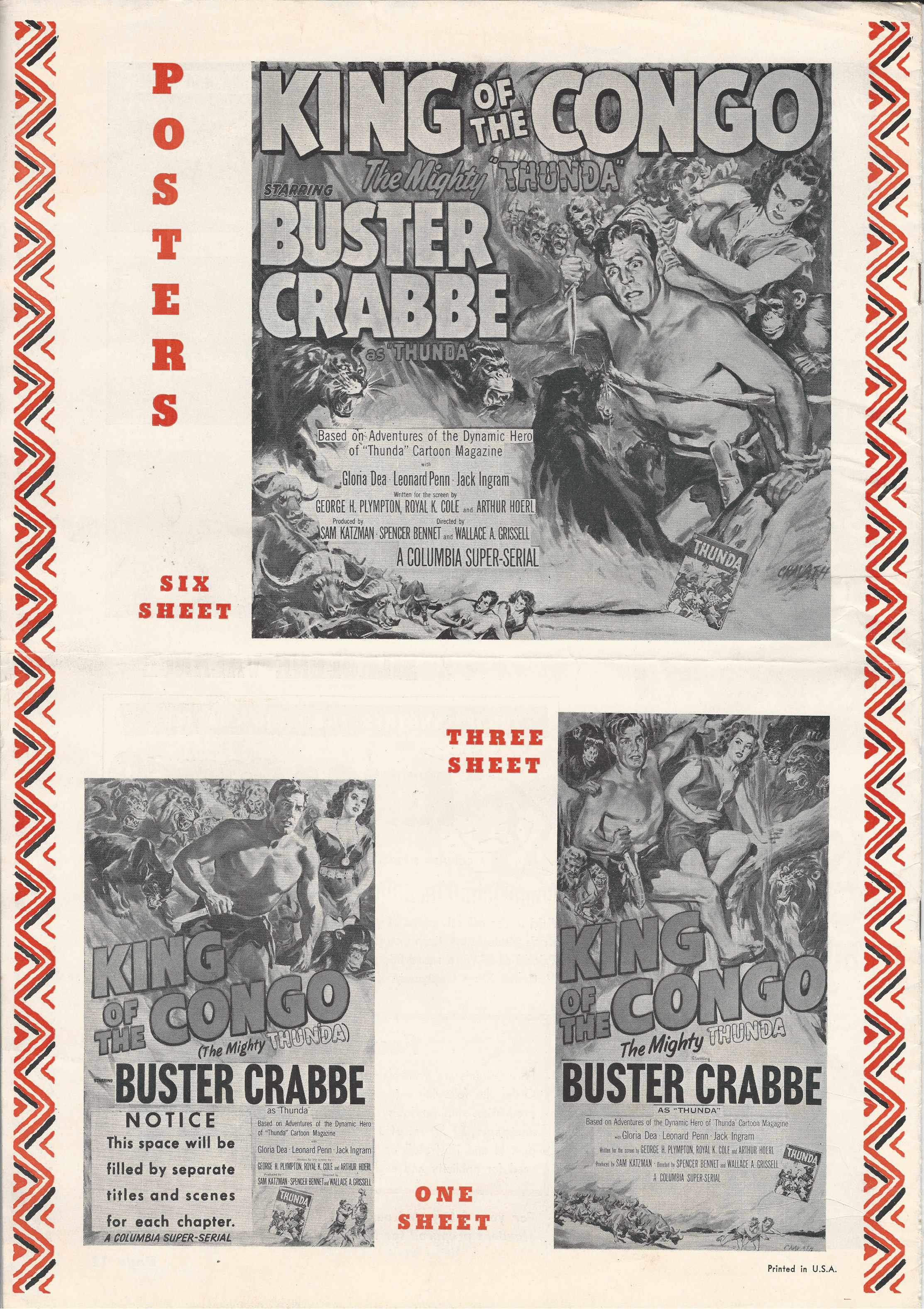 More jungle spectacle courtesy of Tony Rivers. He spotted these scans made by comic book fiend Bill Meugniot. This time, Buster Crabbe (Buck Rogers, Flash Gordon), takes a stab at it. Hold on to your loin cloth as the "Mighty Thunda" swings through the trees. Exciting poster art and lots of promotion can be found in the 12 pages of this pressbook, including a coloring page!