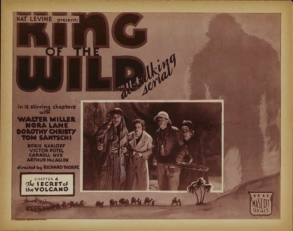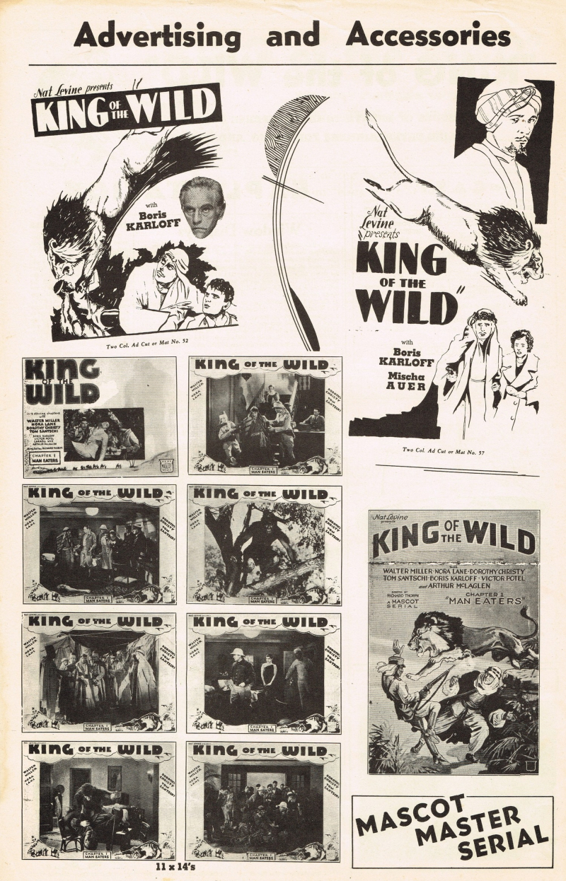 Here’s a pressbook for the pre-code serial, King of the Wild (for a re-release in 1945) with Boris Karloff. I added some lobby cards too.