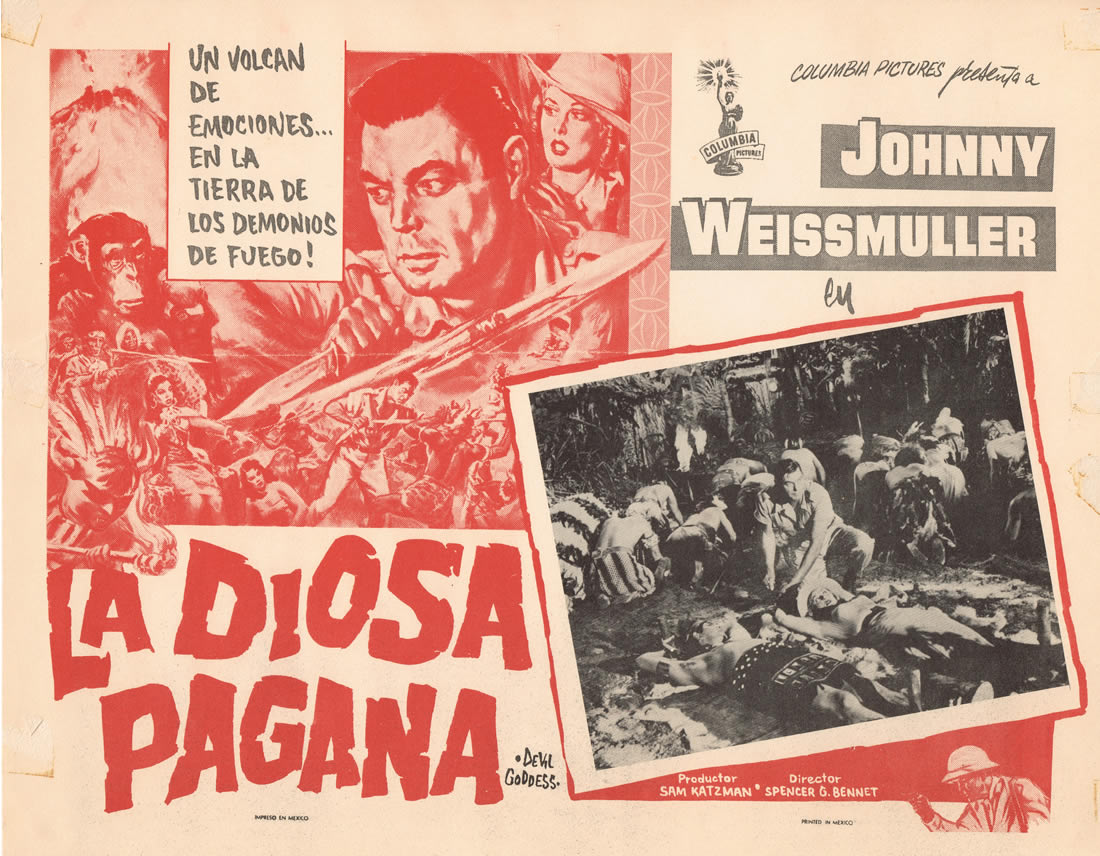 A vibrant use of red against white background (sure, it’s aged a bit), highlights this Mexican lobby card for Johnny Weismuller’s Devil Goddess (1955). I have a soft spot for jungle movies of the 1950s, so you will see many lobby cards from my collection for that genre. I make no apologies.