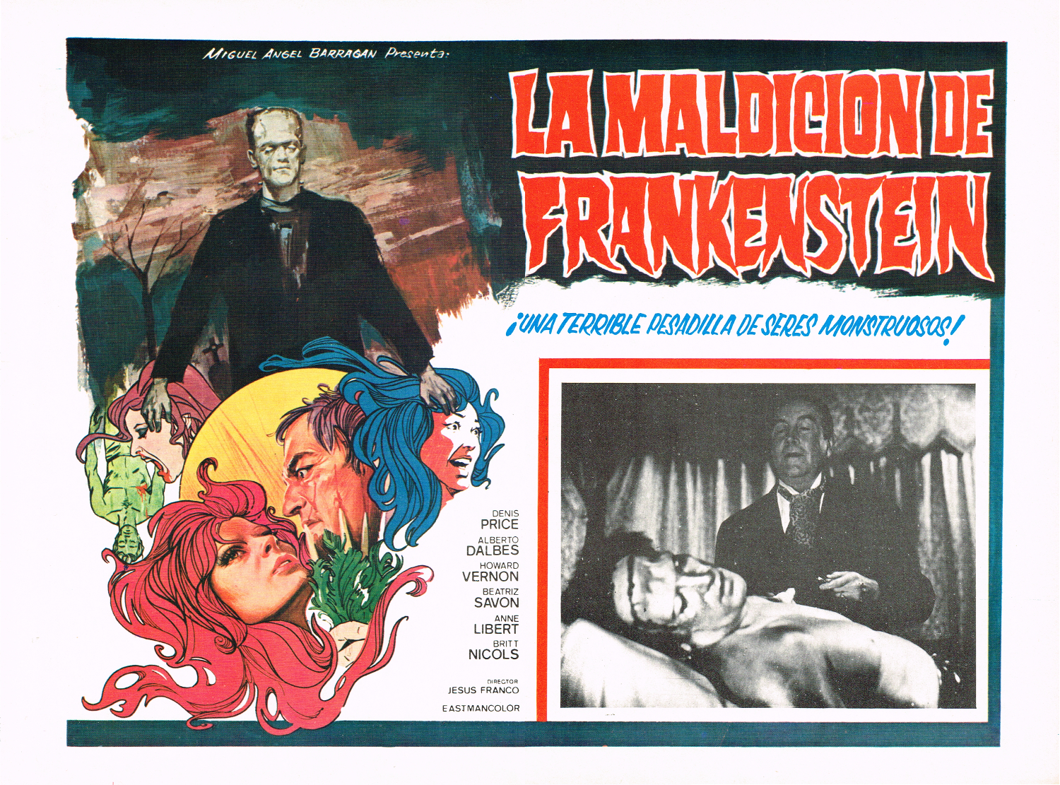 Jesus Franco strikes again. With a sketch-like composition of elements, this Frankenstein Monster illustration appears on other Mexican lobby cards, but I’m not sure yet if it is the work of a Spanish artist. It is quite striking in color and composition.