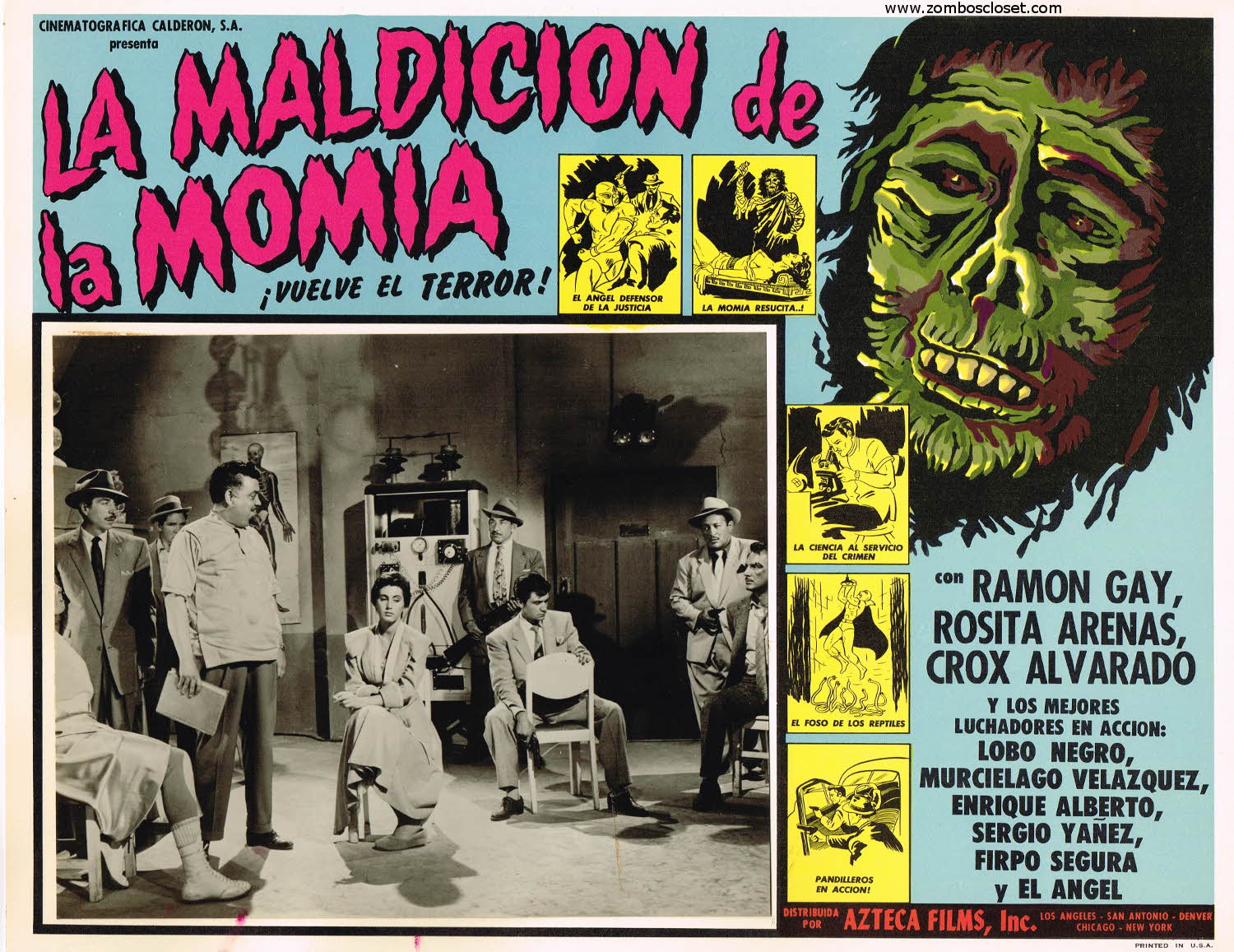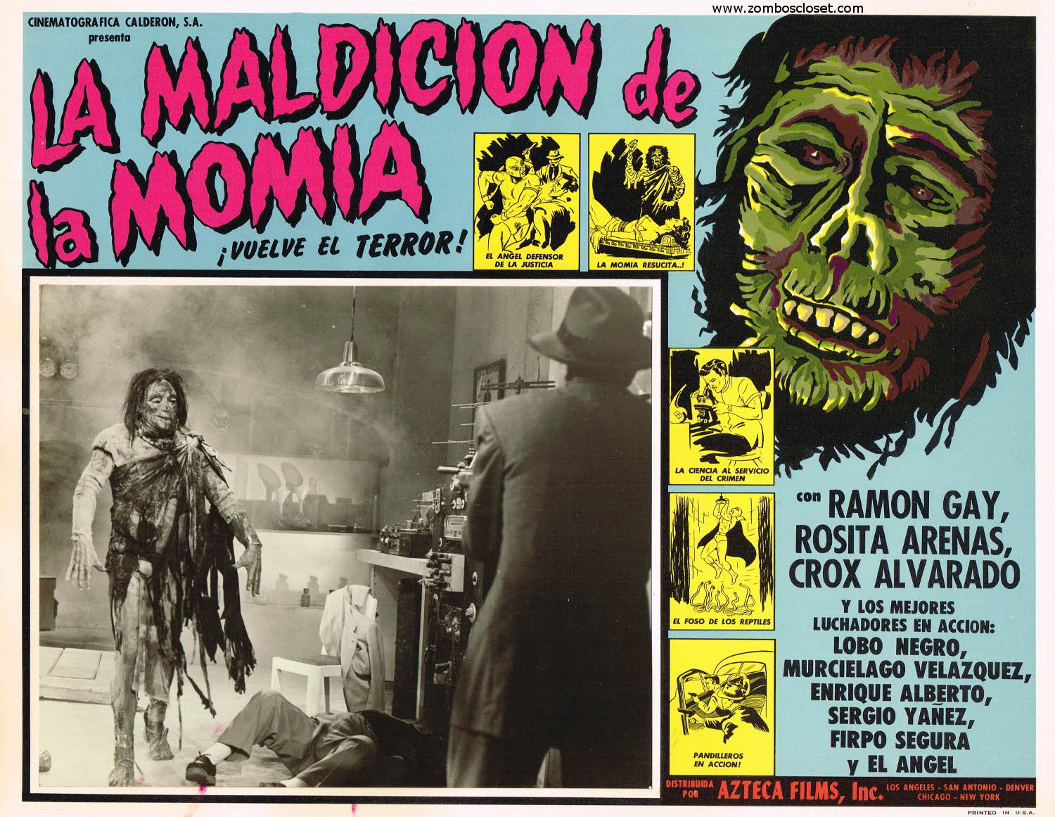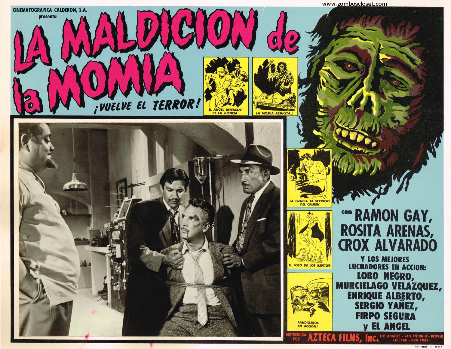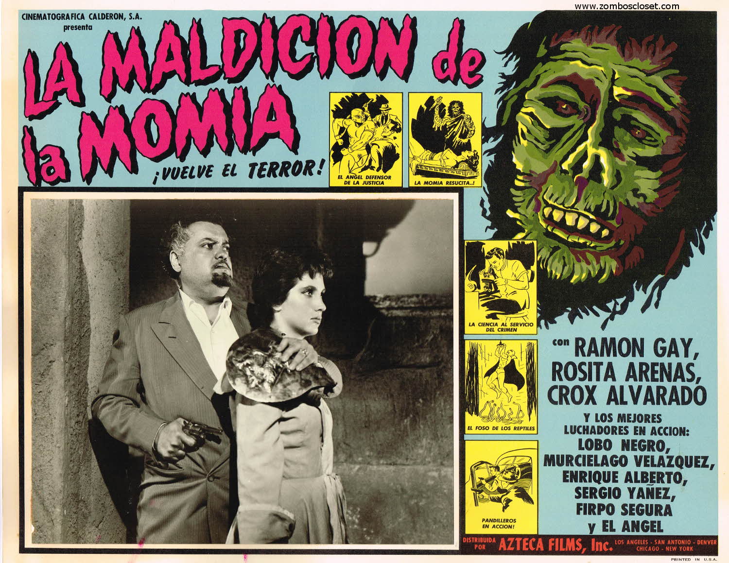 Here's the 8 card Azteca Mexican lobby card set to La Maldcion de la Momia. On the Azteca lobby cards (which were printed for Spanish-speaking American movie theaters), each inset scene is an actual photograph. The cards are also smaller than the regular Mexican lobby cards. Evil Dr. Krupp squares off against Popoca, a masked wrestler, and other annoyances to his mad master plan. Very enjoyable, even if a bit slower moving than today's movies.