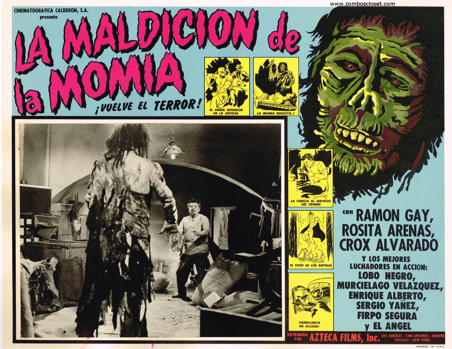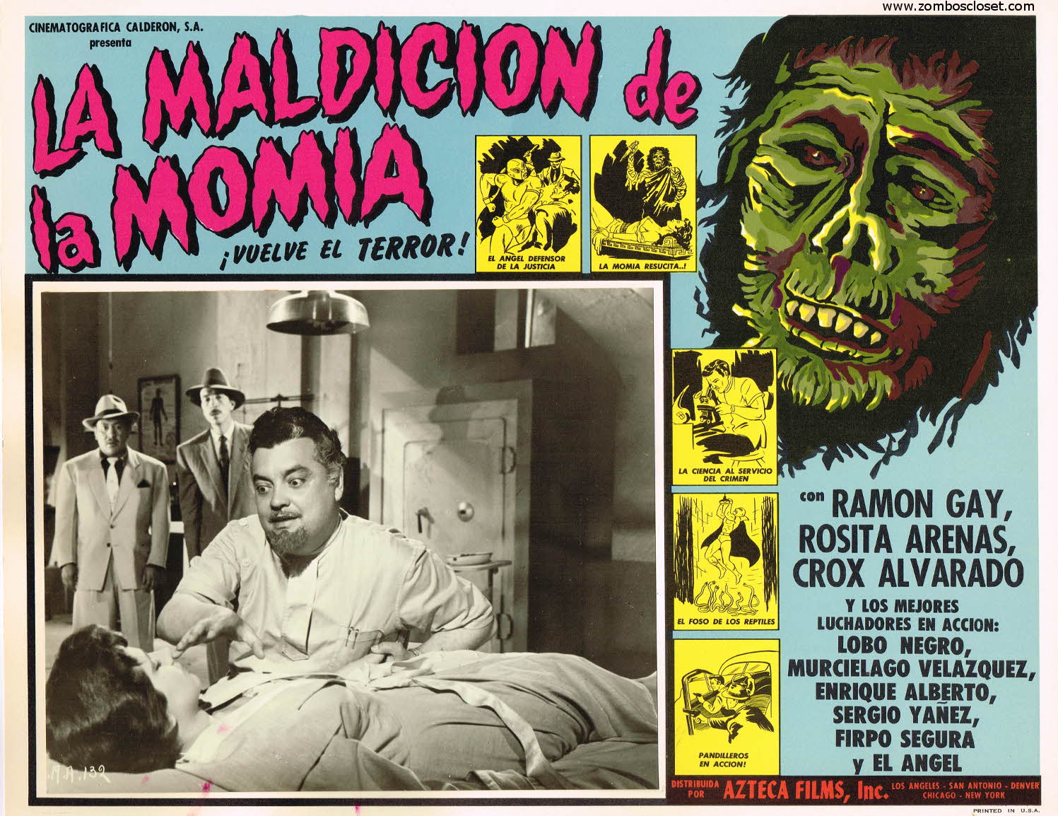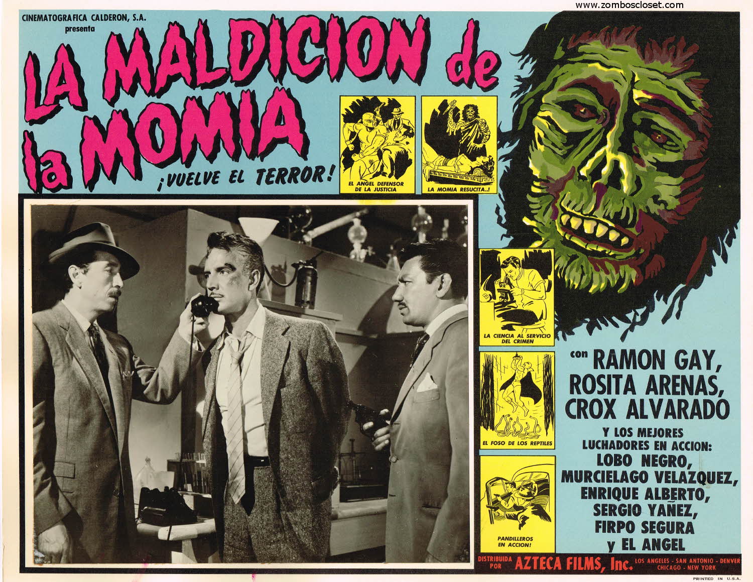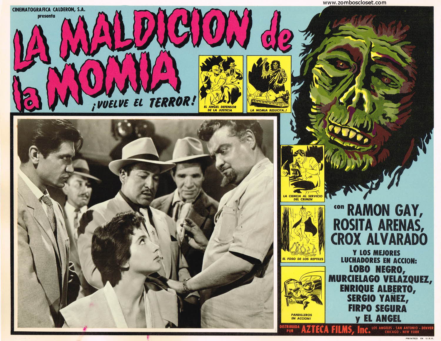 Here's the 8 card Azteca Mexican lobby card set to La Maldcion de la Momia. On the Azteca lobby cards (which were printed for Spanish-speaking American movie theaters), each inset scene is an actual photograph. The cards are also smaller than the regular Mexican lobby cards. Evil Dr. Krupp squares off against Popoca, a masked wrestler, and other annoyances to his mad master plan. Very enjoyable, even if a bit slower moving than today's movies.