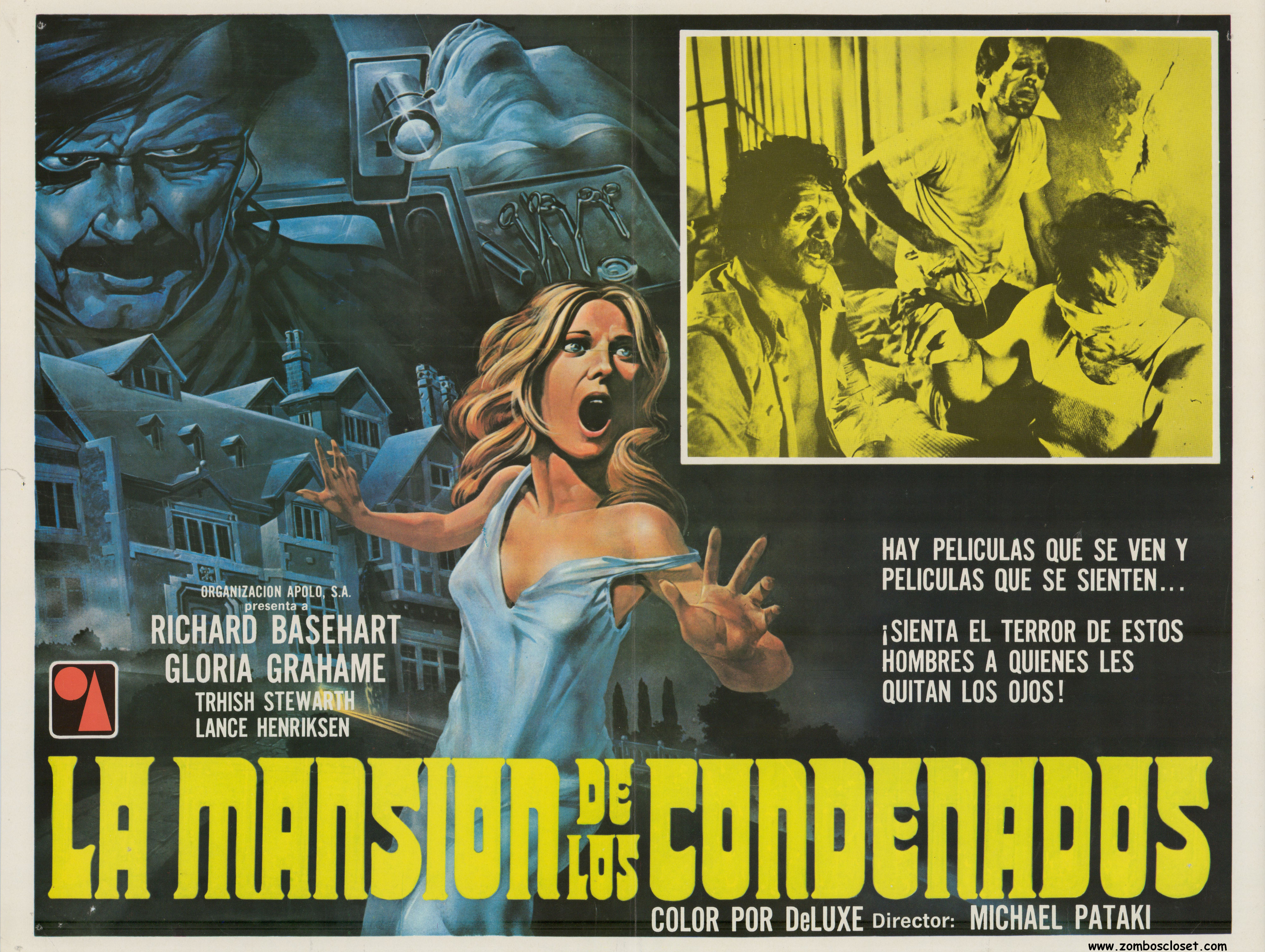 One of the video nasties, when the UK fretted over such things, a doctor keeps taking eyes without asking. His daughter can't see what all the fuss is about. Richard Basehart plays the crazed doctor and Lance Henriksen lends a scalpel. The artwork on this very larger Mexican lobby card, printed on thin slick paper, is sophisticated in both style and fear factor and is from the US poster art.