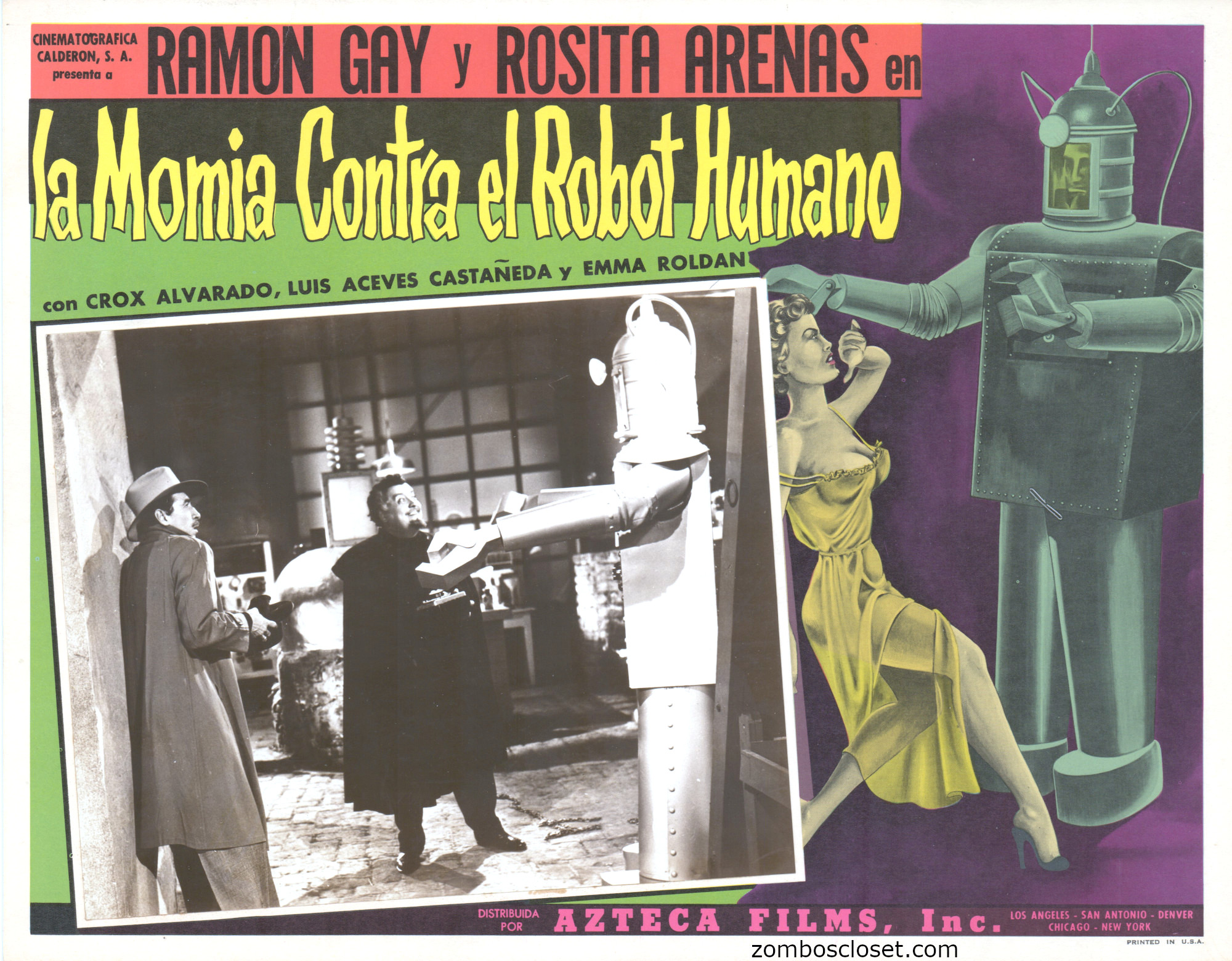 Evil scientist. Weird-looking robot. Annoyed mummy. I'm all in. the Azteca lobby cards are simply beautiful, with vivid colors (though usually by accident, I think), an actual photo pasted to the card, and a nifty awkward balance between illustration, font, and scene to sell the movie to theater audiences. These smaller (11 inches by 14 inches) cards were distributed by Azteca Film Inc. for Spanish-language theaters in the United States. Typical Mexican lobby cards varied in sizes, with 12.5 inches by 16 inches a common one. See more cards at this Dangerous Minds article, and at Collectors Weekly.