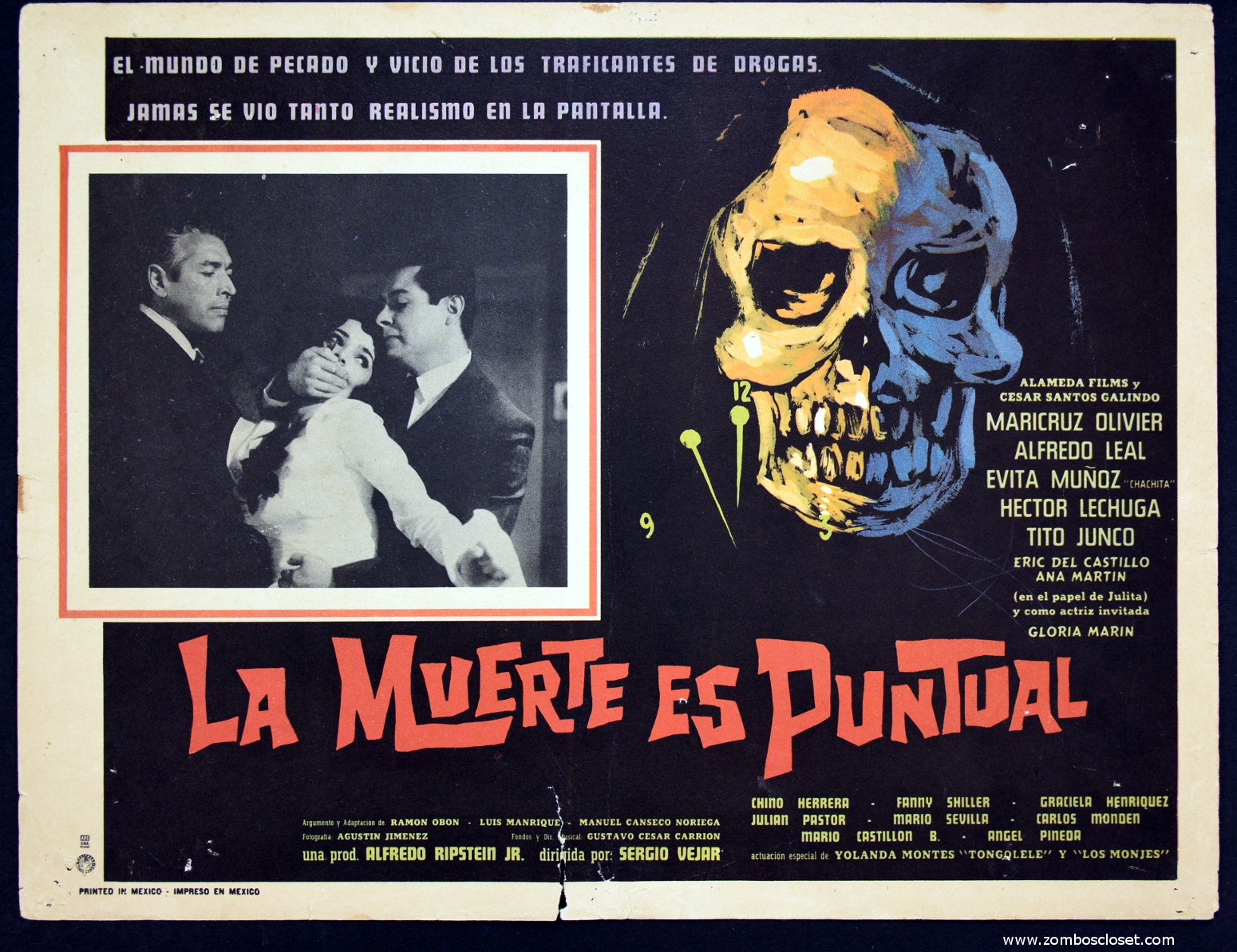 La Muerte Es Puntual (1967) Mexican Lobby Card Leave a Comment / Azteca/Mexican Lobby Cards / By JM Cozzoli Simple layout yet still a great Mexican lobby card for La Muerte es Puntual (Death is Punctual). Neat placement of all essential elements such as the illustration, the text, and the inset scene keep it clean and direct.Like this:Like Loading... Share this post Facebook Twitter Pinterest Linkedin