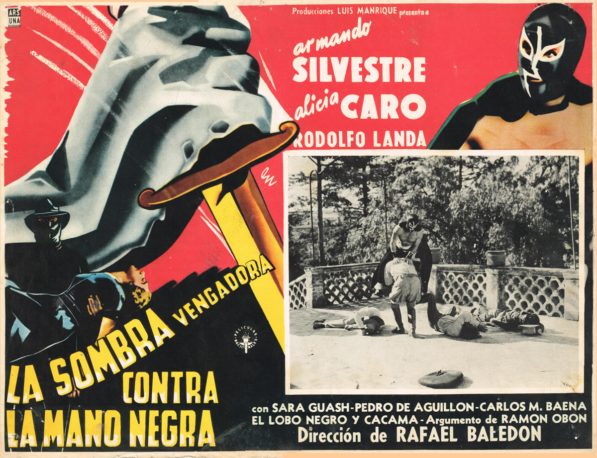 Another dynamic Mexican lobby card, this one for La Sombra Vengadora Contra La Mano Negra (1956). The plunging knife, the determined look on the masked wrestler, and the shadowy man dressed in black holding the unconscious female victim promise thrills and chills; which is backed up by the movie scene.