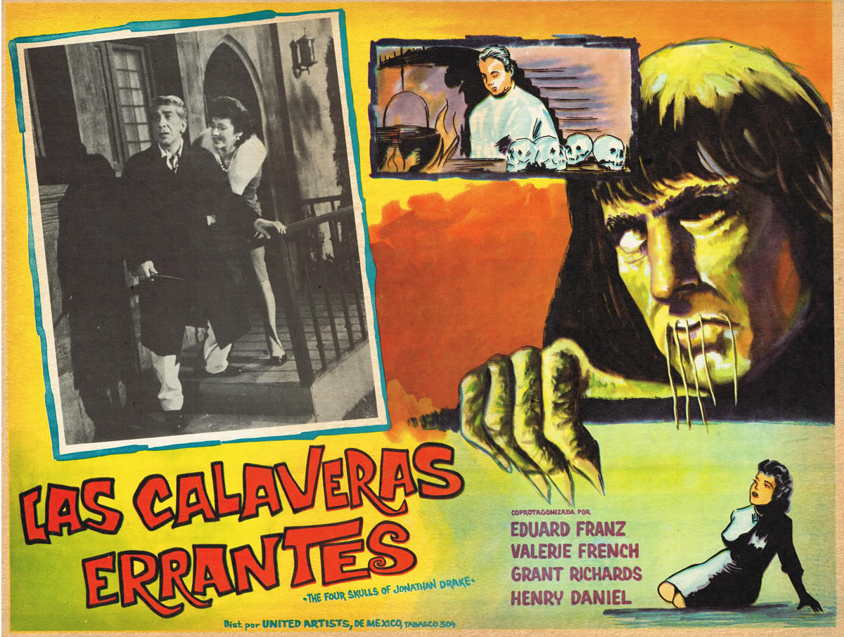 Mexican Lobby Card: The Four Skulls of Jonathan Drake Leave a Comment / Azteca/Mexican Lobby Cards / By JM Cozzoli The Four Skulls of Jonathan Drake Mexican lobby card combines creepy illustration with a hint of female in danger and a touch of witchcraft. Great greenish, yellowish colors and strong font lettering complete the "sell."Like this:Like Loading... Share this post Facebook Twitter Pinterest Linkedin