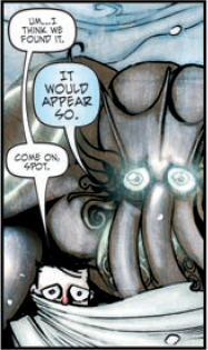 Howard meets a Deep One who wants to eat him at first, thinking he is a Jinn, but winds up joining him instead on his quest to learn more about the place he's found himself wandering in. Howard names his new aquatic acquaintance Spot since he cannot pronounce the creature's real name, which starts with Thu Thu.