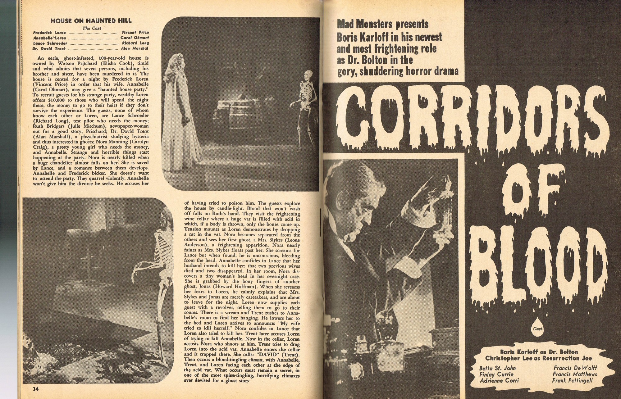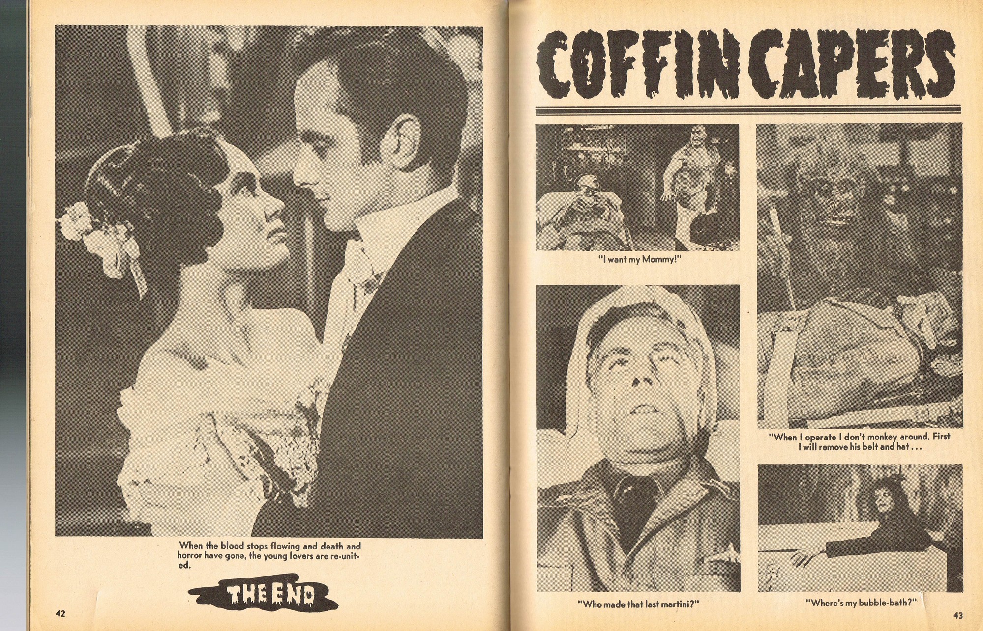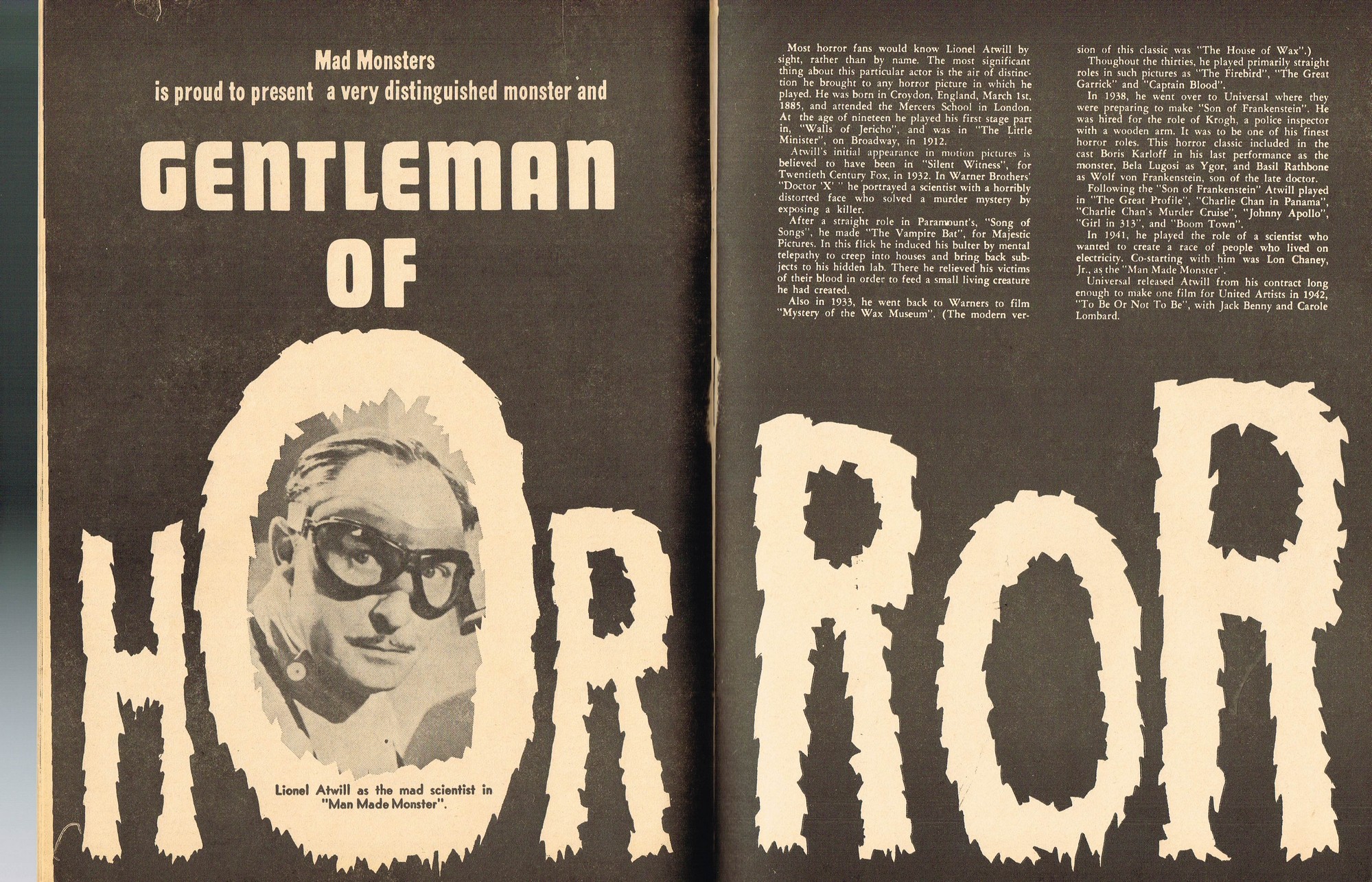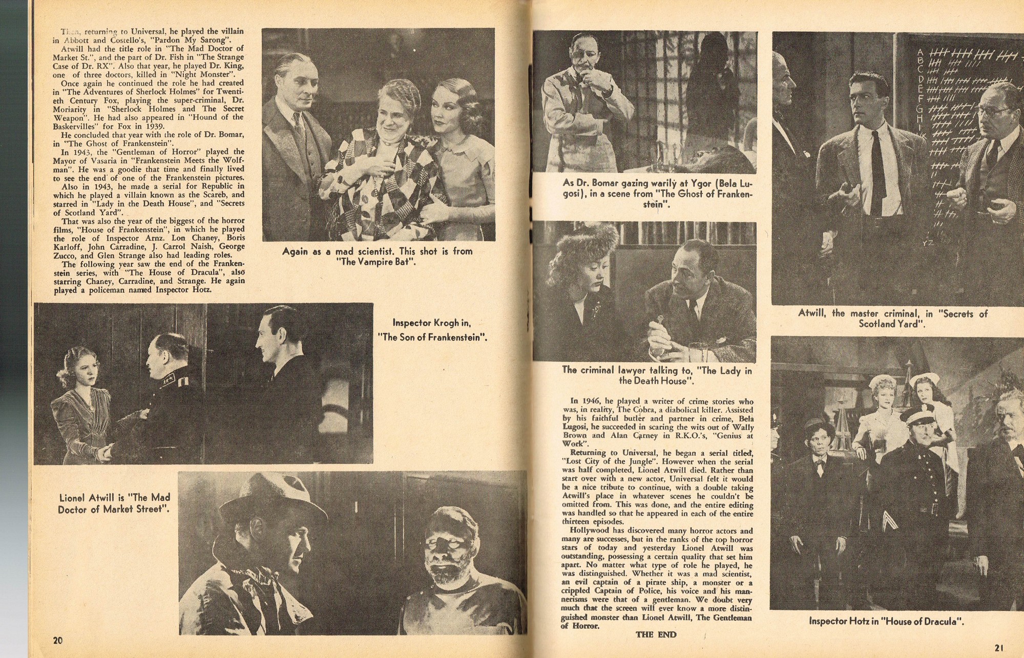 This issue of Mad Monsters, No. 7, has lots of pics, not too much text, and good coverage, from The Preying Mantis and Corridors of Blood, to I Married a Monster From Outer Space and an article on Lionel Atwill. Not too shabby for 35 cents. Charlton did cut corners by printing the magazine as cheaply as possible, so the photos aren't crisp. But their covers were eye-catching.