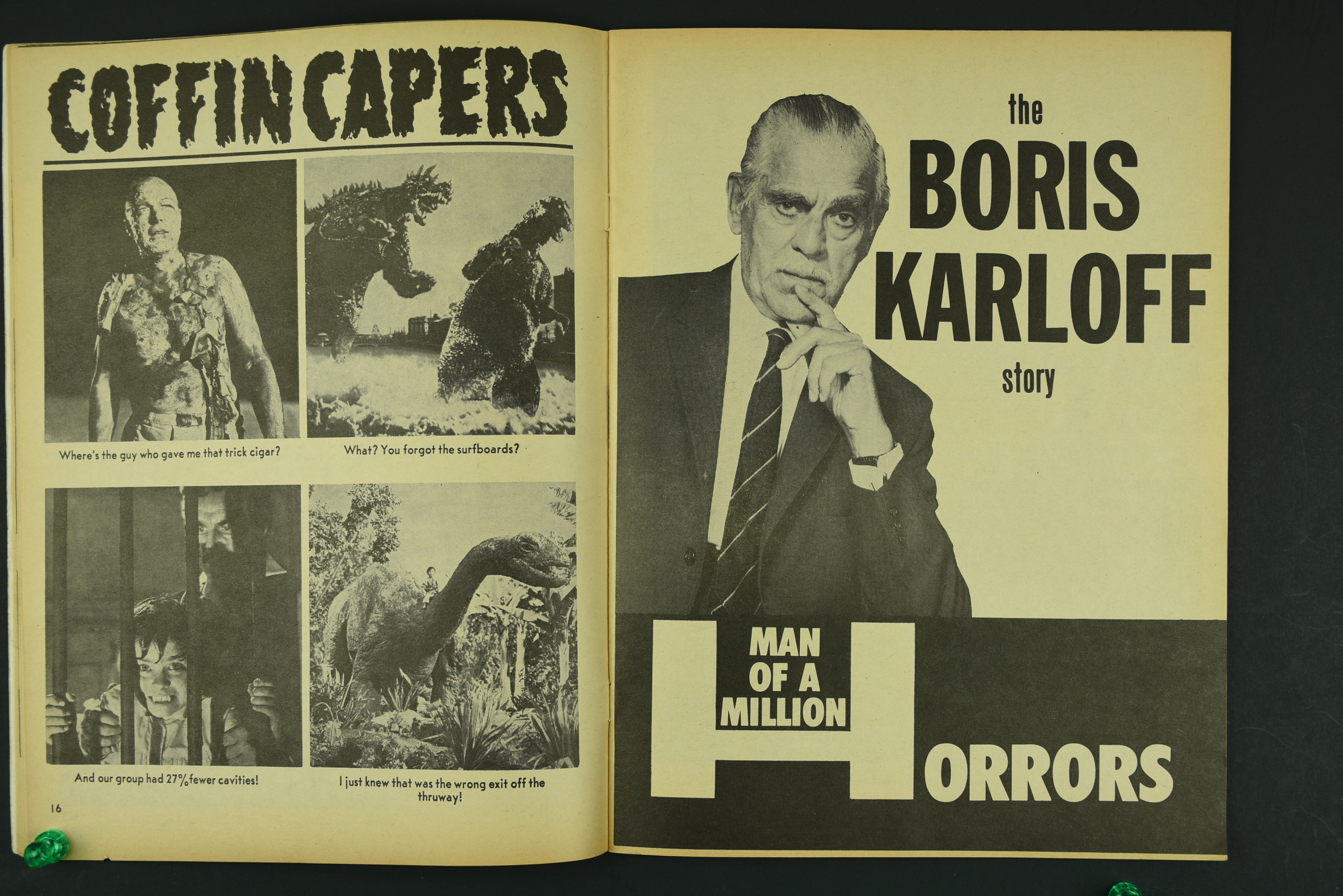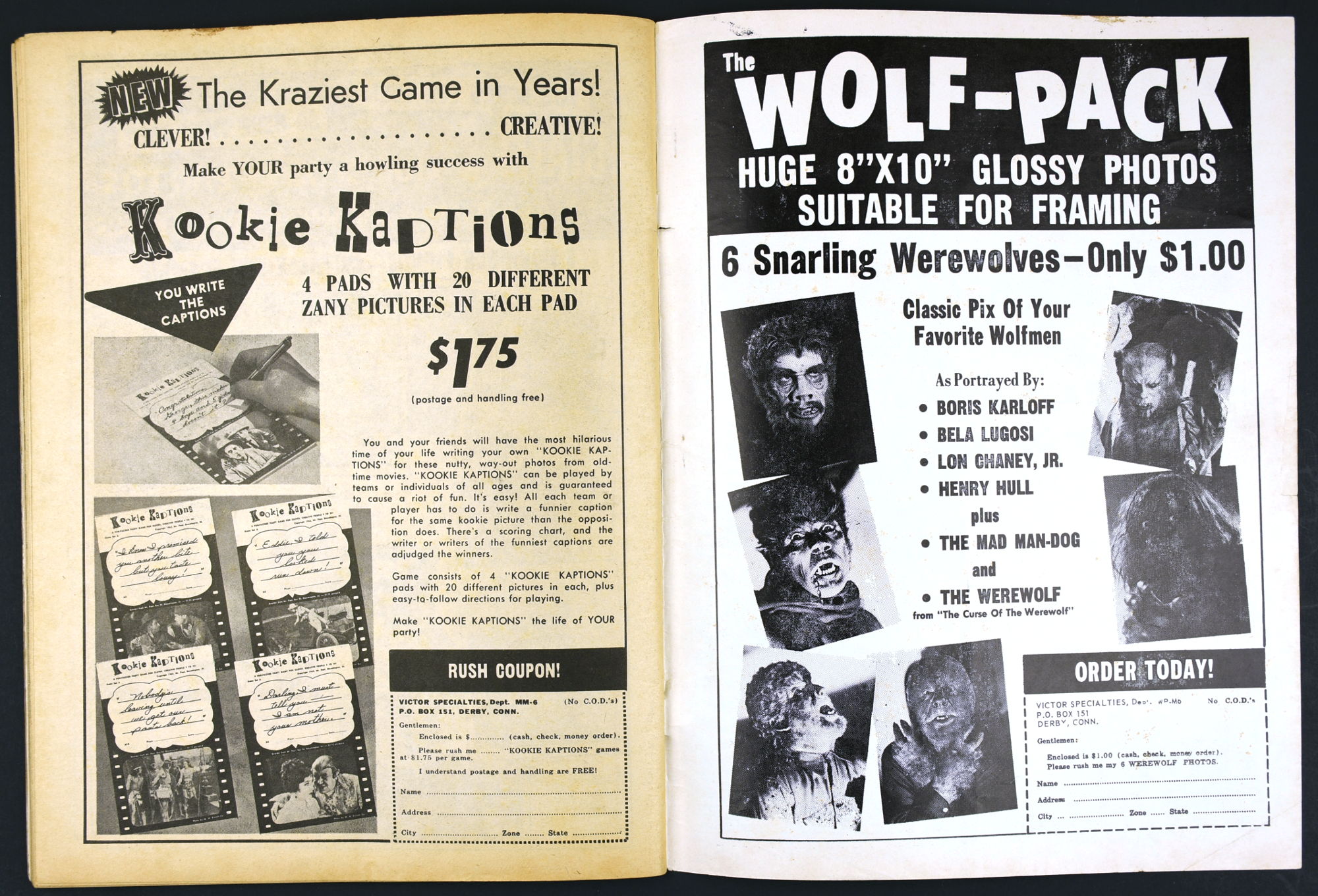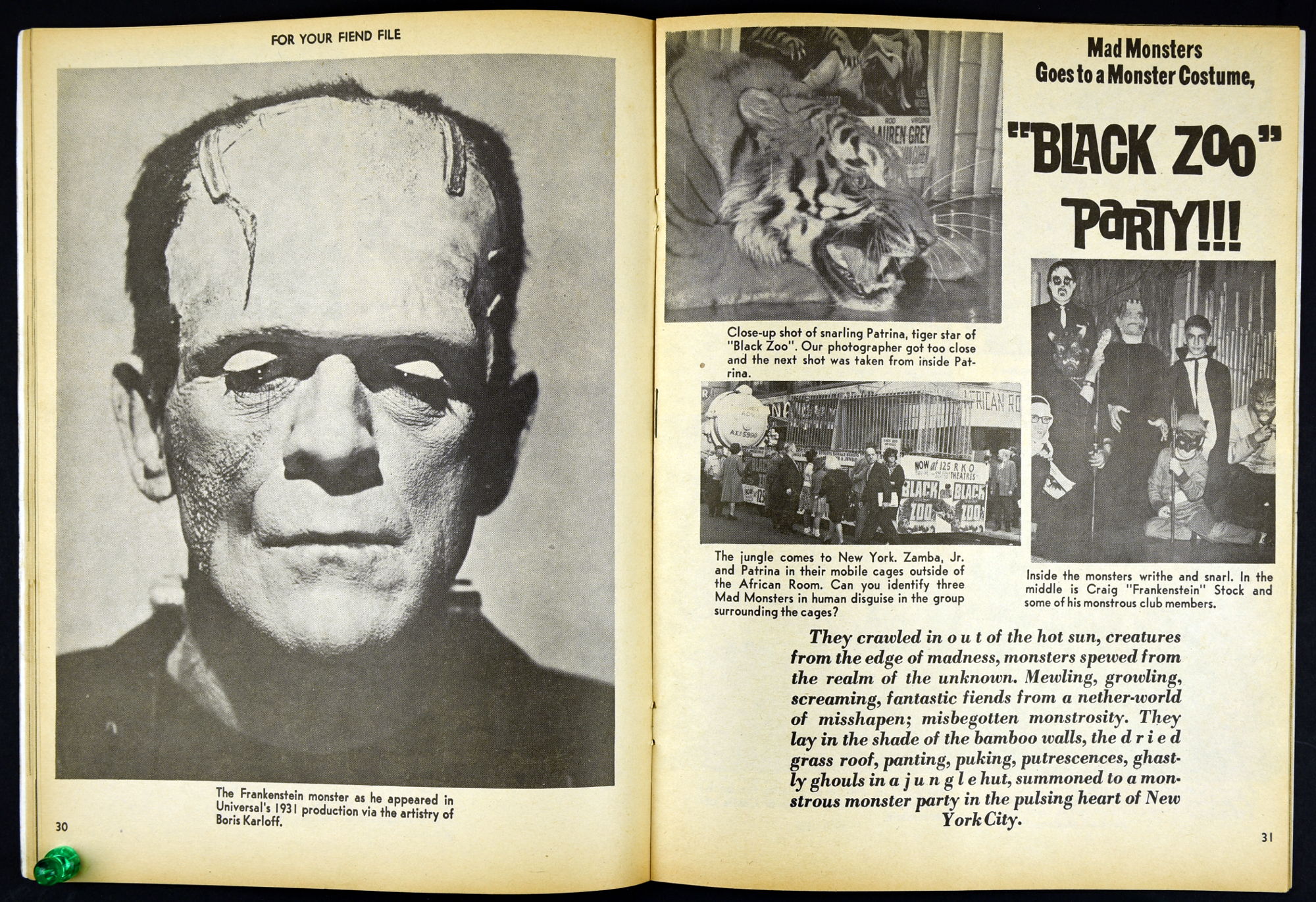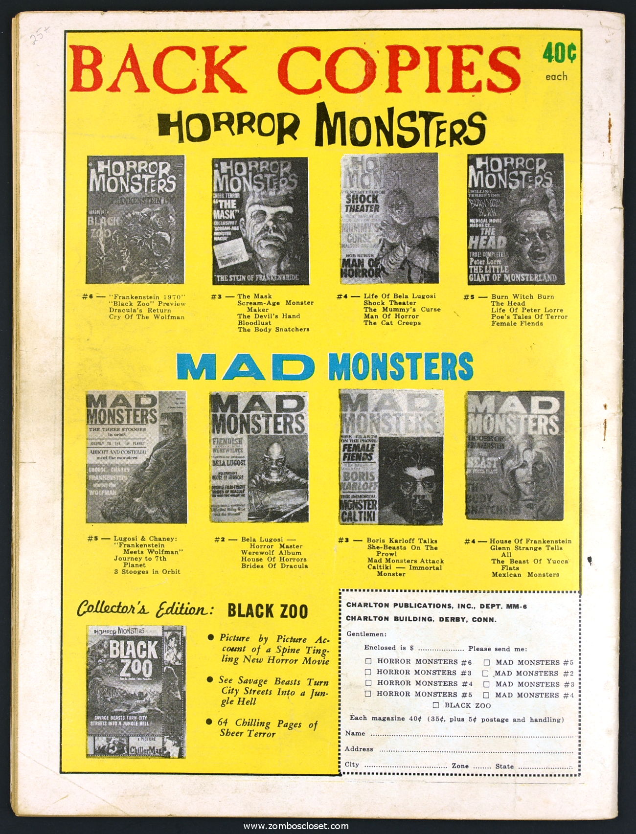 Charlton Publications joined in the monster magazine mash with Mad Monsters, providing lots of pictures, a little text, and fun monsterkid merchandise to covet. So much to be ordered! So little allowance money to stretch and stretch and stretch. In this issue Queen of Outer Space still looks awful, Boris Karloff is the Man of a Million Horrors, Coffin Capers provides a tidbit of humor, and a Black Zoo Party provides an historical glimpse at movie promotion back in the day.