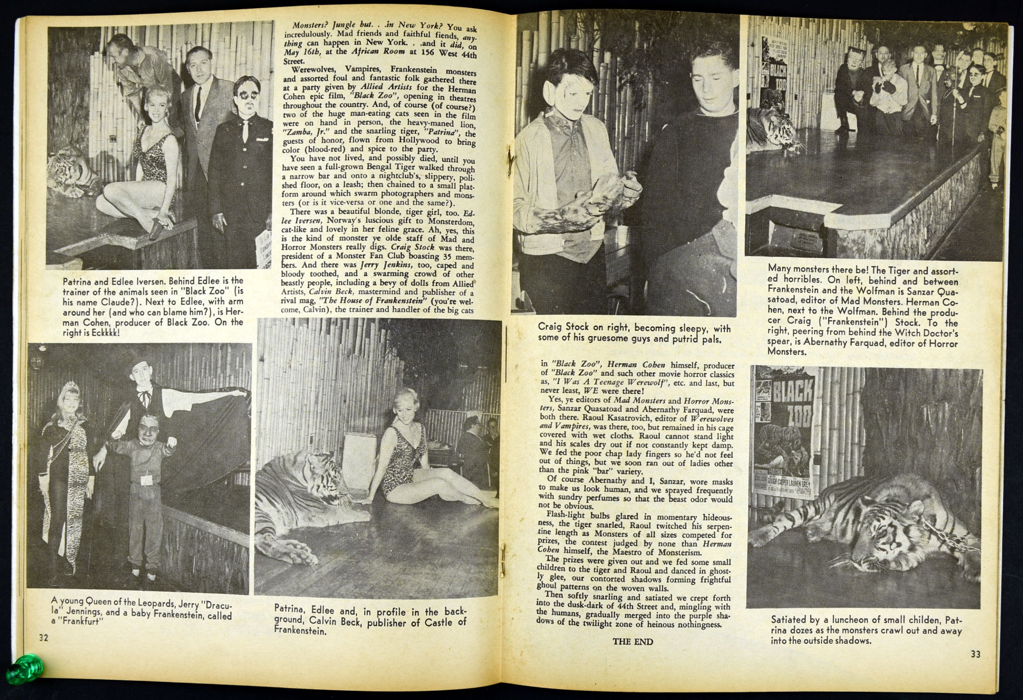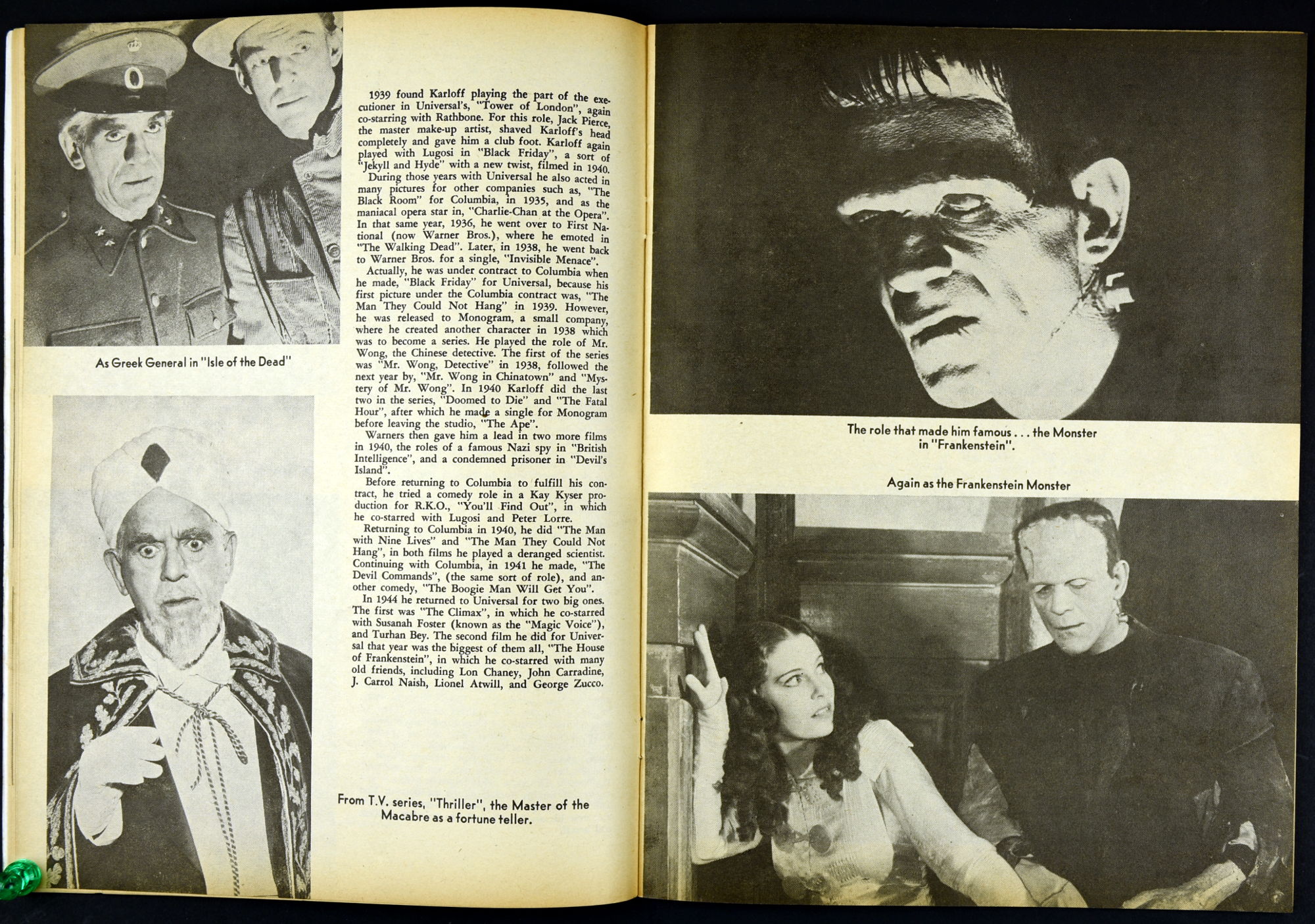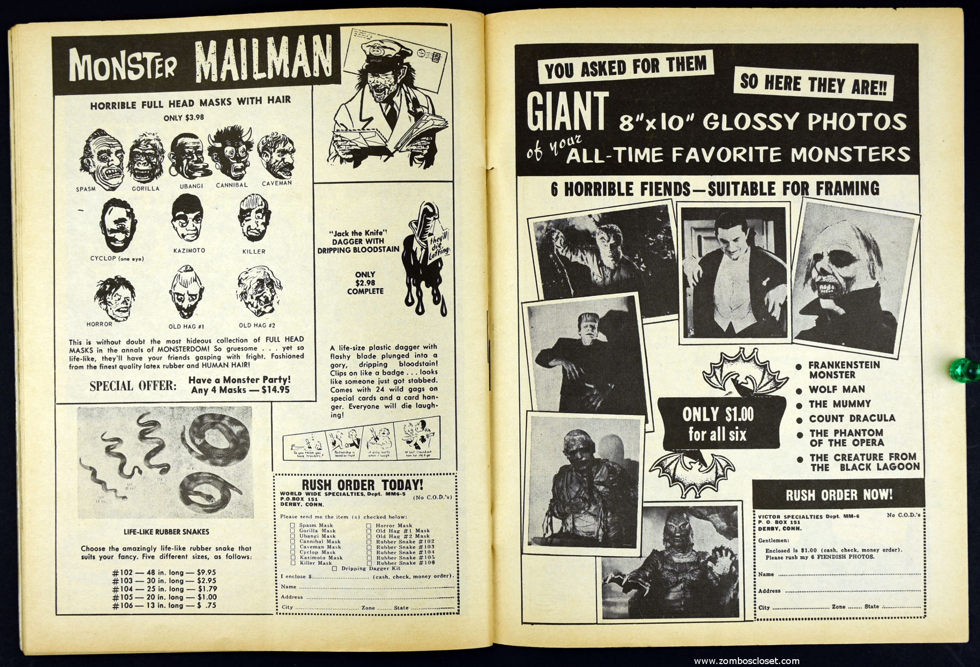Charlton Publications joined in the monster magazine mash with Mad Monsters, providing lots of pictures, a little text, and fun monsterkid merchandise to covet. So much to be ordered! So little allowance money to stretch and stretch and stretch. In this issue Queen of Outer Space still looks awful, Boris Karloff is the Man of a Million Horrors, Coffin Capers provides a tidbit of humor, and a Black Zoo Party provides an historical glimpse at movie promotion back in the day.