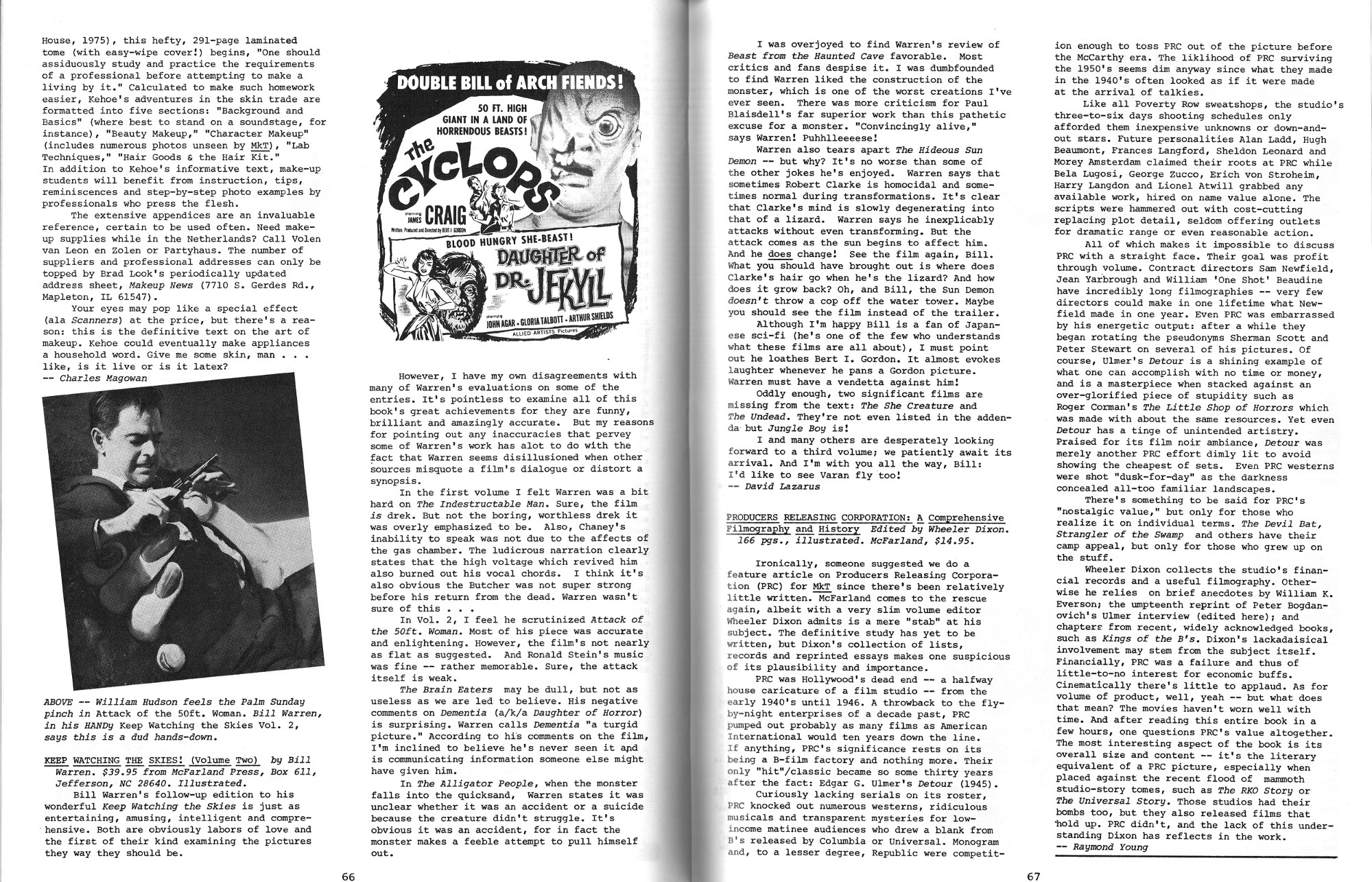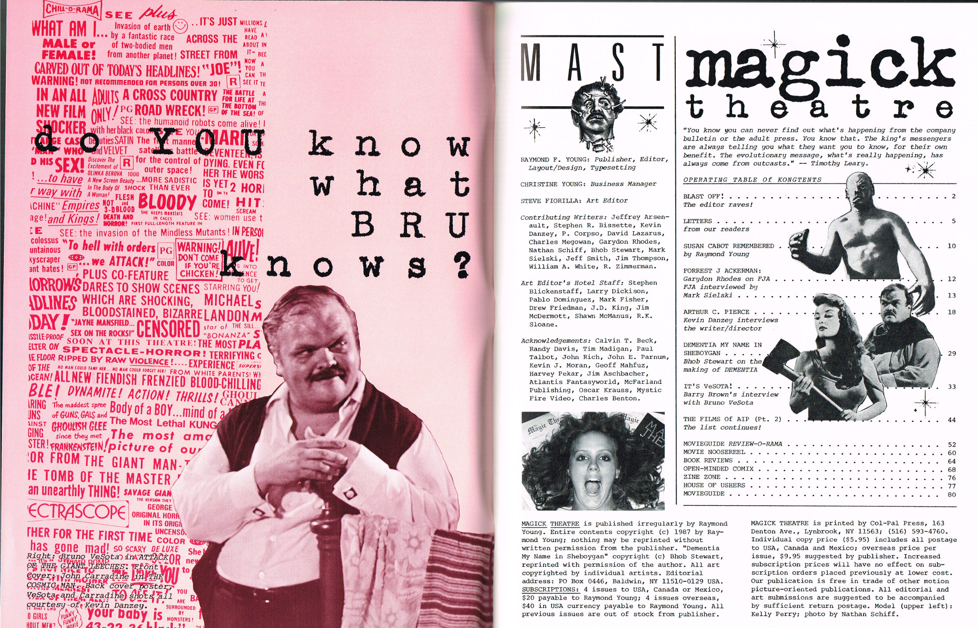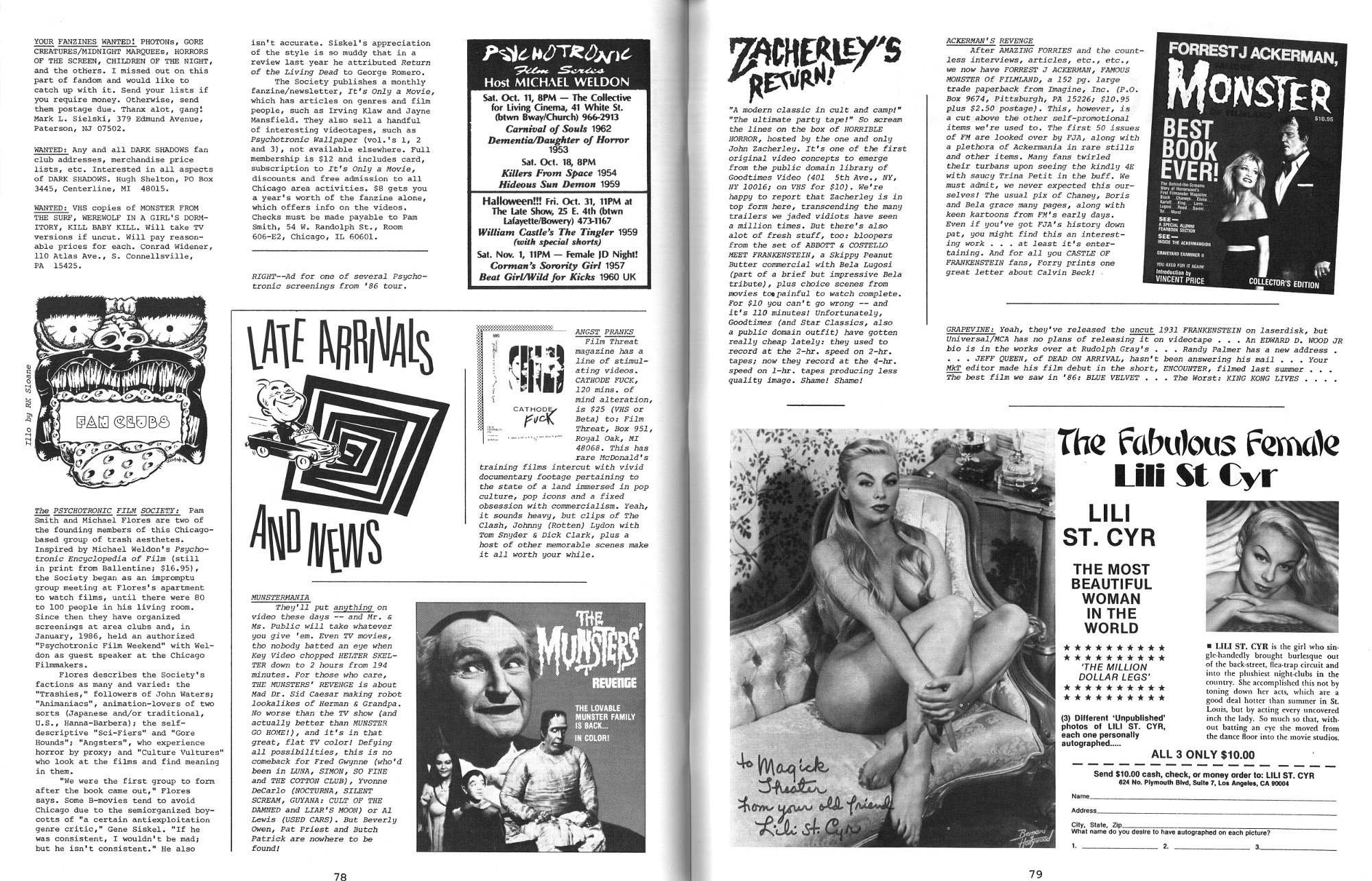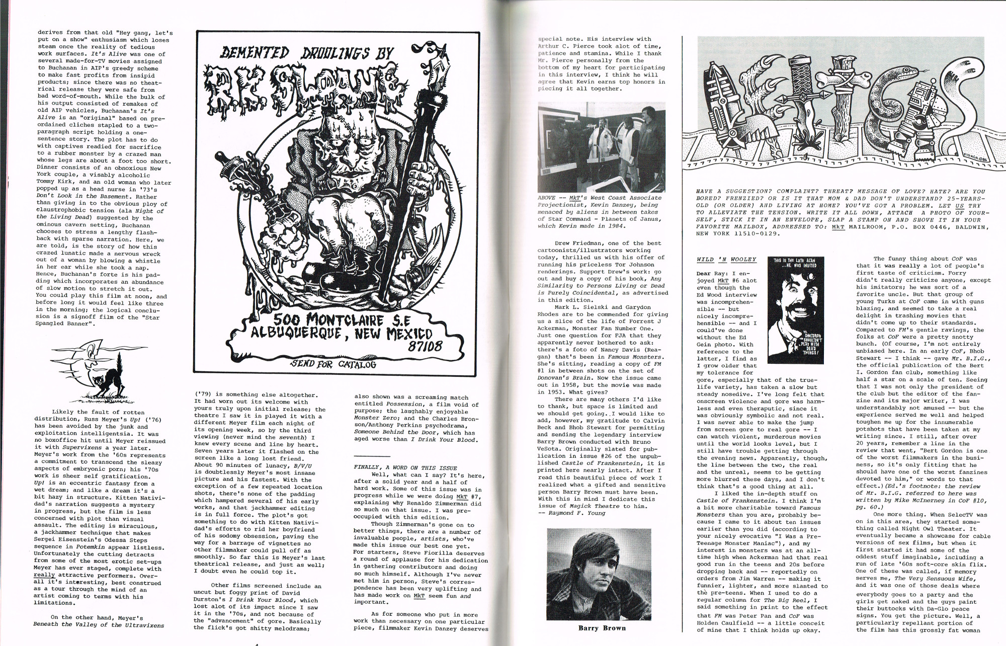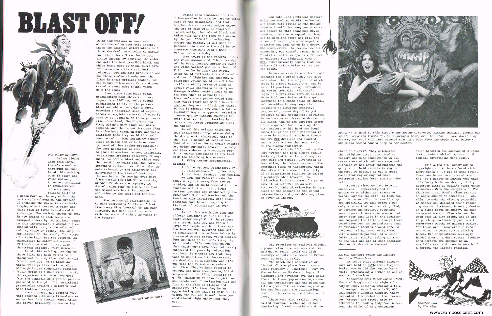 The pro-zine Magick Theatre, put out by Raymond Young, was always a long reading experience as it was packed with content. In this issue there is an interview with Forrest J. Ackerman (Famous Monsters of Filmland magazine), Susan Cabot (The Wasp Woman) is remembered and Review O Rama provides critiques for your viewing pleasure, with the Movie Noose Reel providing the low-down on remakes, half-bakes, and well-dones. And still more to enjoy and bring back memories.