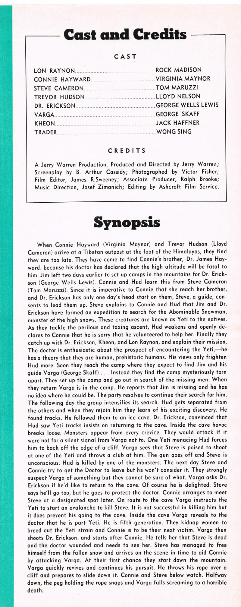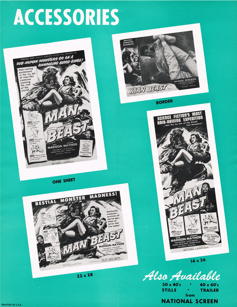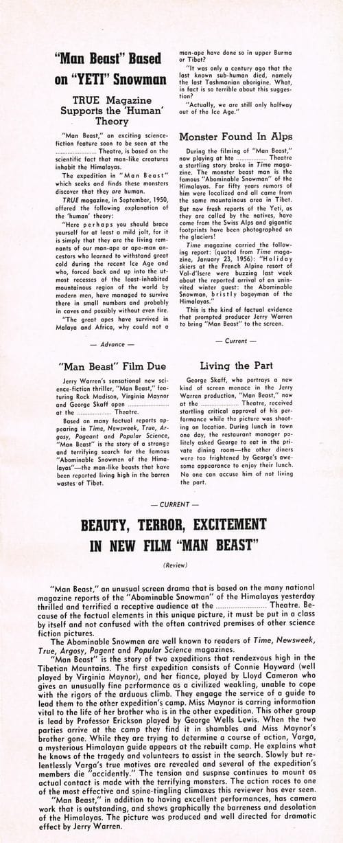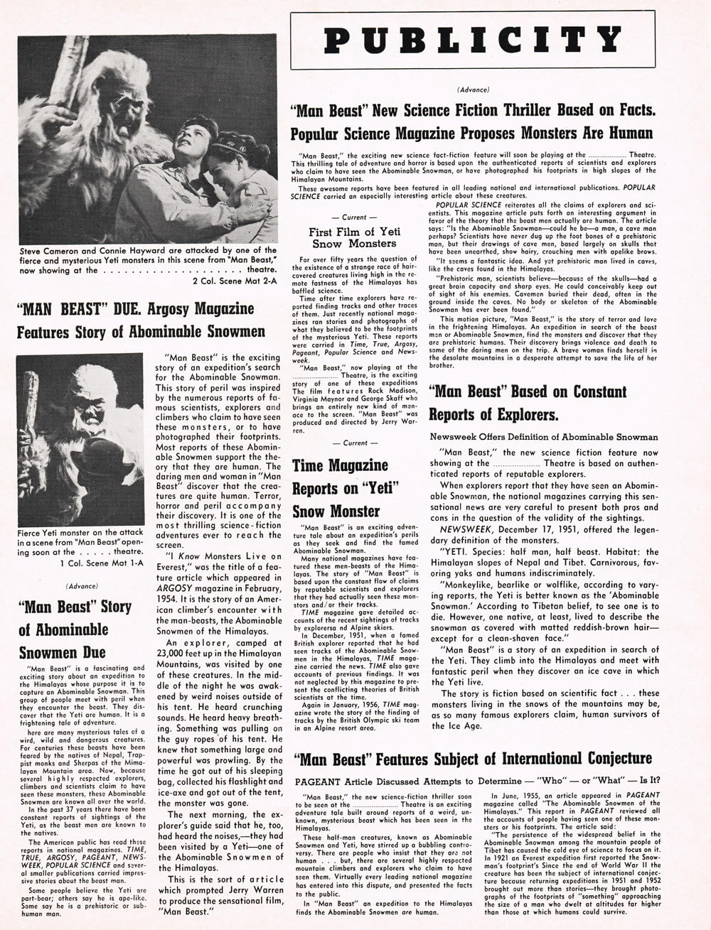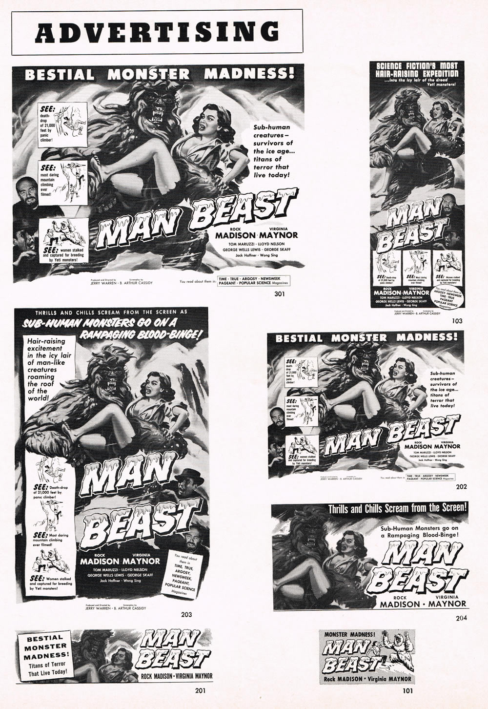 Movie Pressbook: Man Beast (1956) Leave a Comment / Pressbooks (Horror, Sci Fi, Fantasy) / By JM Cozzoli The "SEE:" promotional gimmick is in high swing on this movie.They missed the SEE: A poorly dressed barefoot woman with an open blouse daring to take on the icy snow . Maybe she thought the Man Beast was a wool blanket. Like this:Like Loading... Share this post Facebook Twitter Pinterest Linkedin