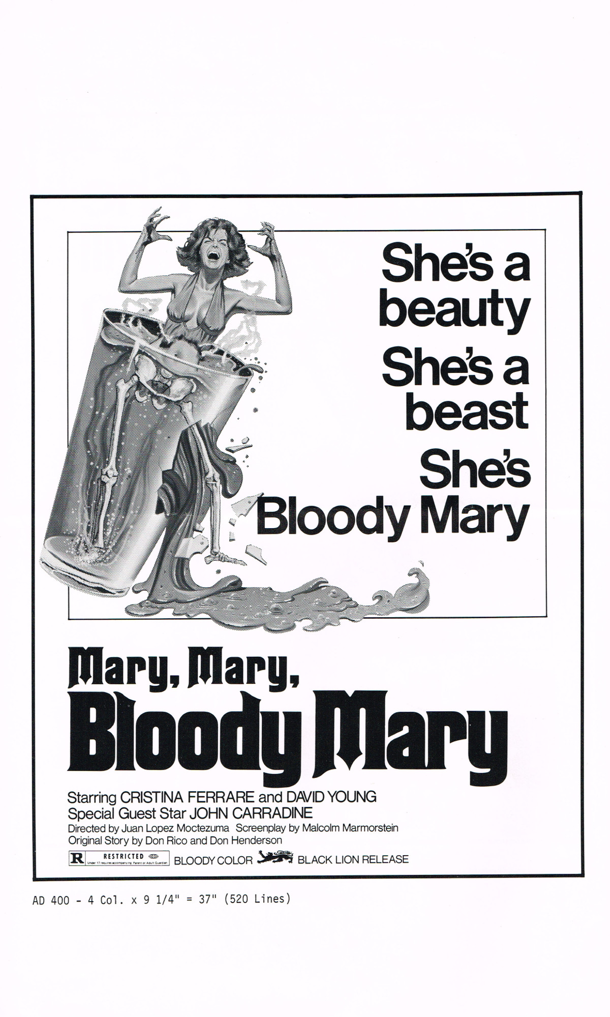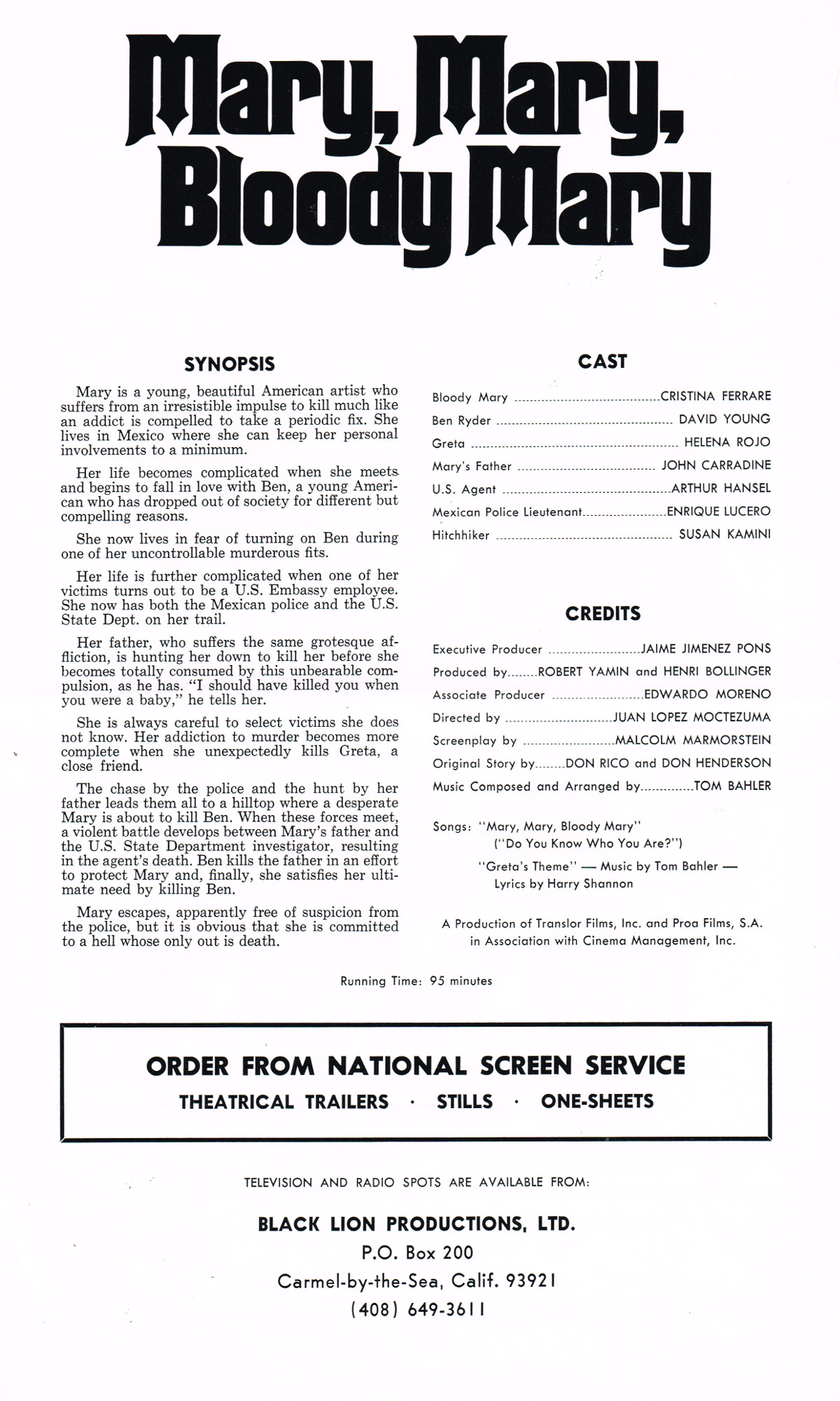 Horrorpedia notes that Quentin Tarantino is a big fan of this movie; critics, not so much. John Carradine appears in this one but not one of his best. Fantastic poster art helps sell this Mexican movie, but the pressbook is disappointing. It contains only newspaper ad mats; no articles on Carradine or the other actors. (see also History of Film with Quentin Tarantino)