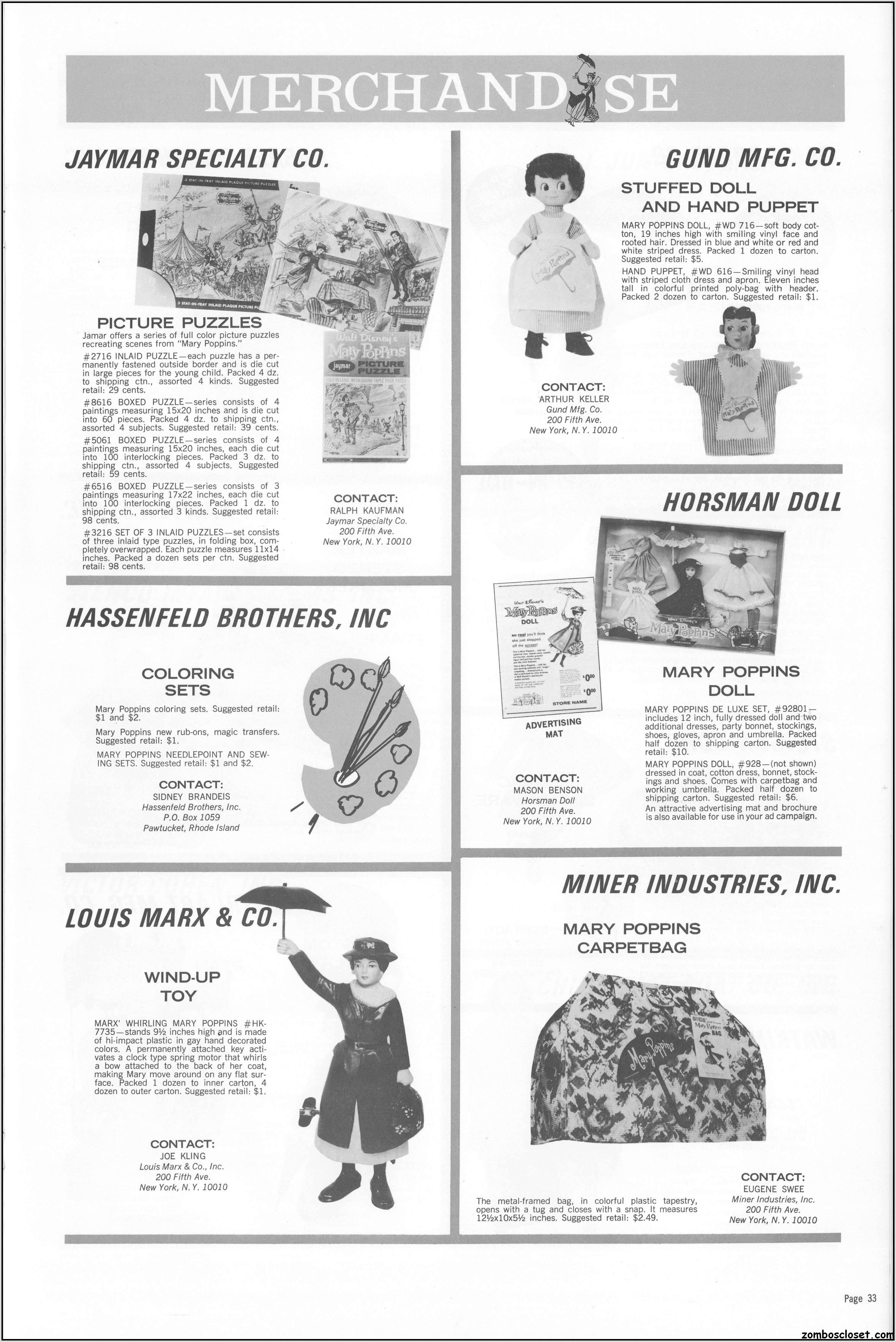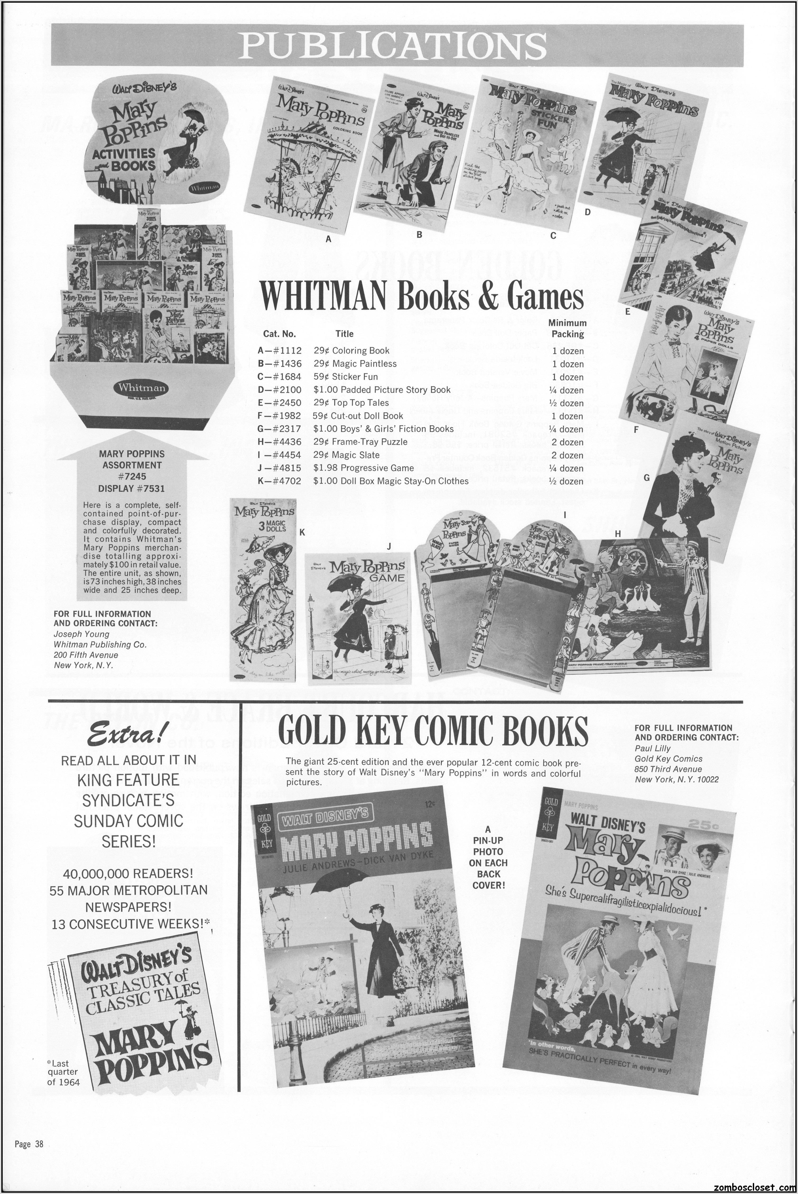 In this second part of the Mary Poppins pressbook is the incredible merchandising. My favorite is the Louis Marx wind-up, but you will find Gold Key comics, Whitman books, records, puzzles, her carpet bag, Golden Books, clothes, and more. Toy merchandising on a grand scale may have started with the Star Wars franchise, but Disney was years ahead in tying loads of merchandise to its movies.