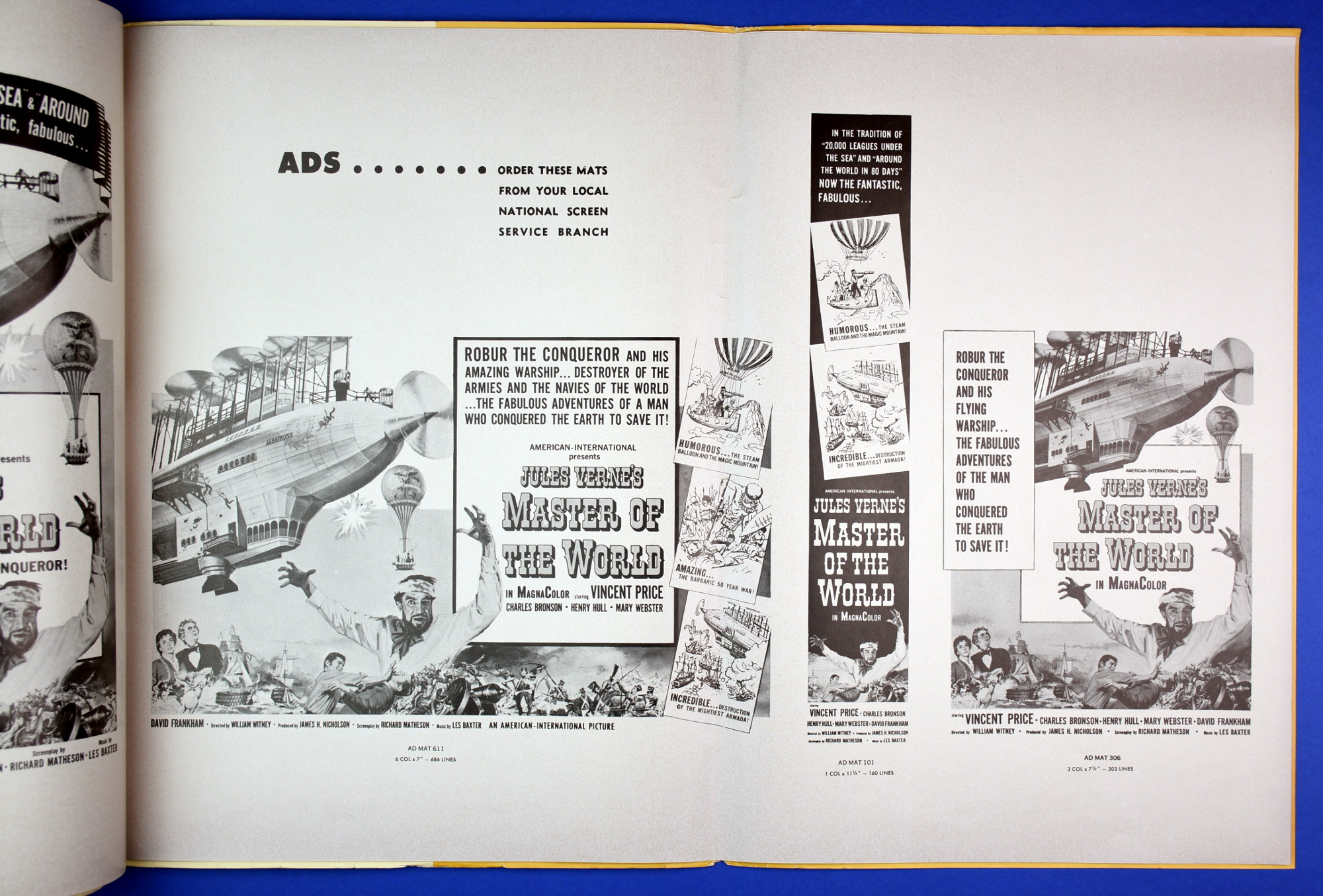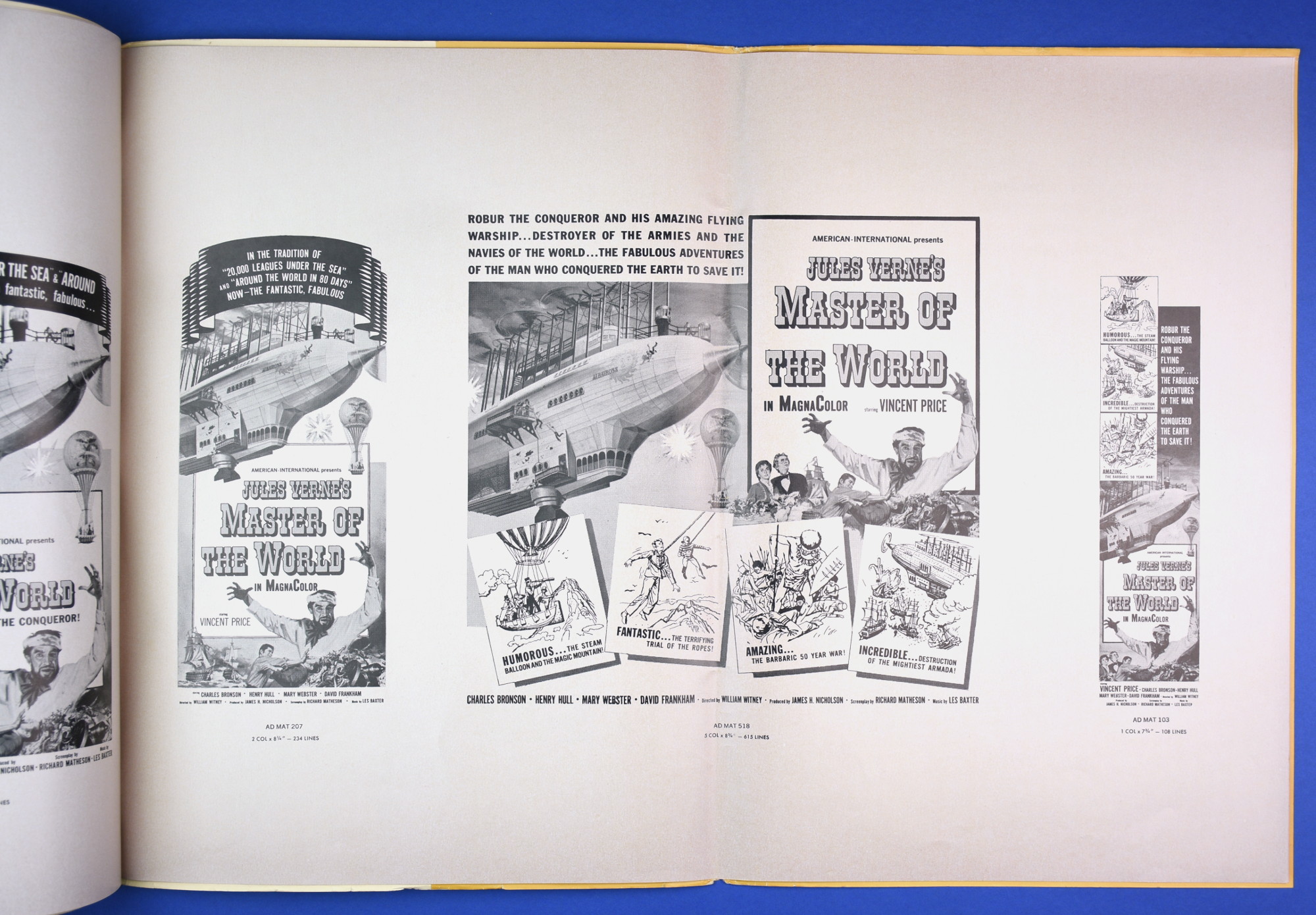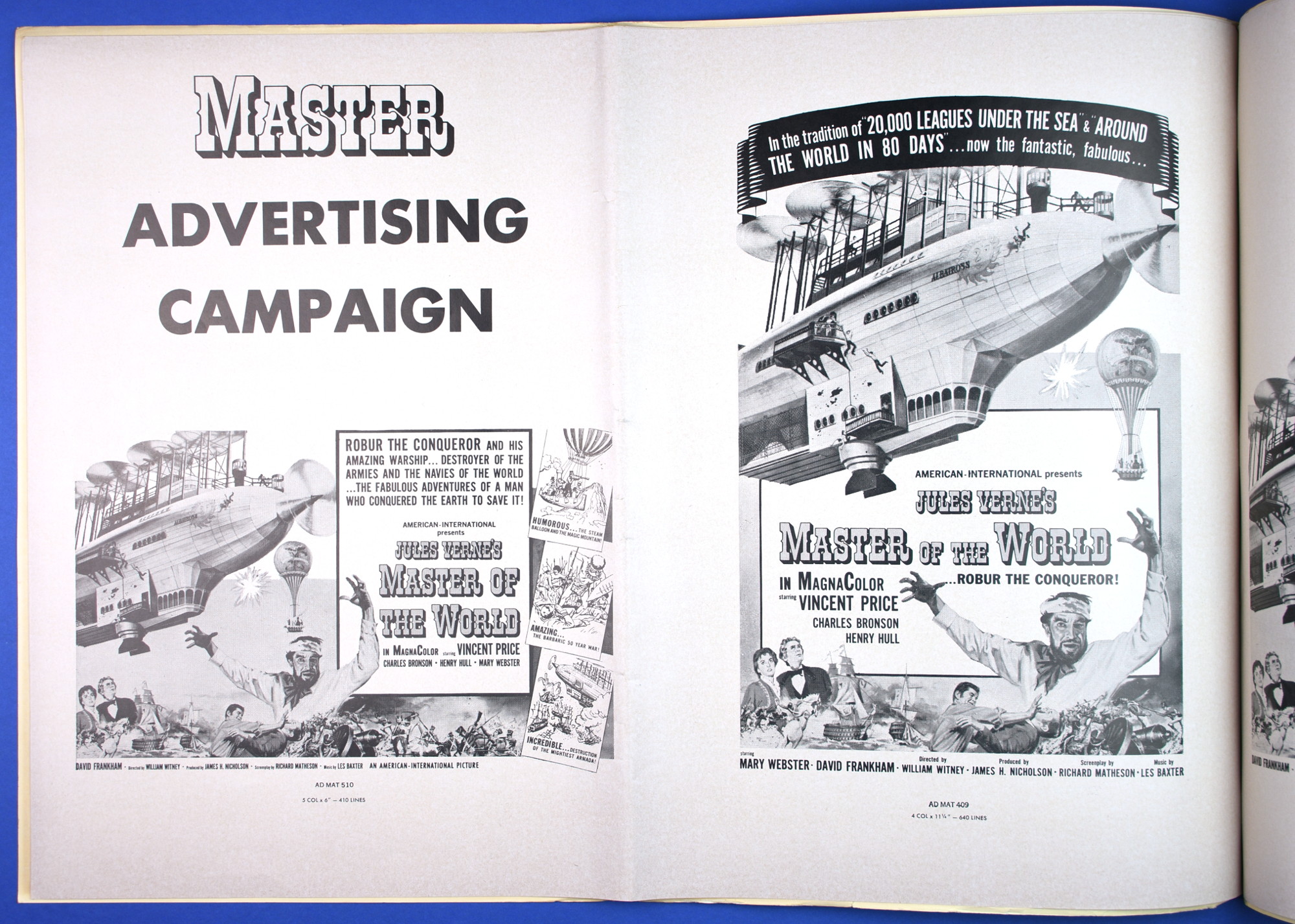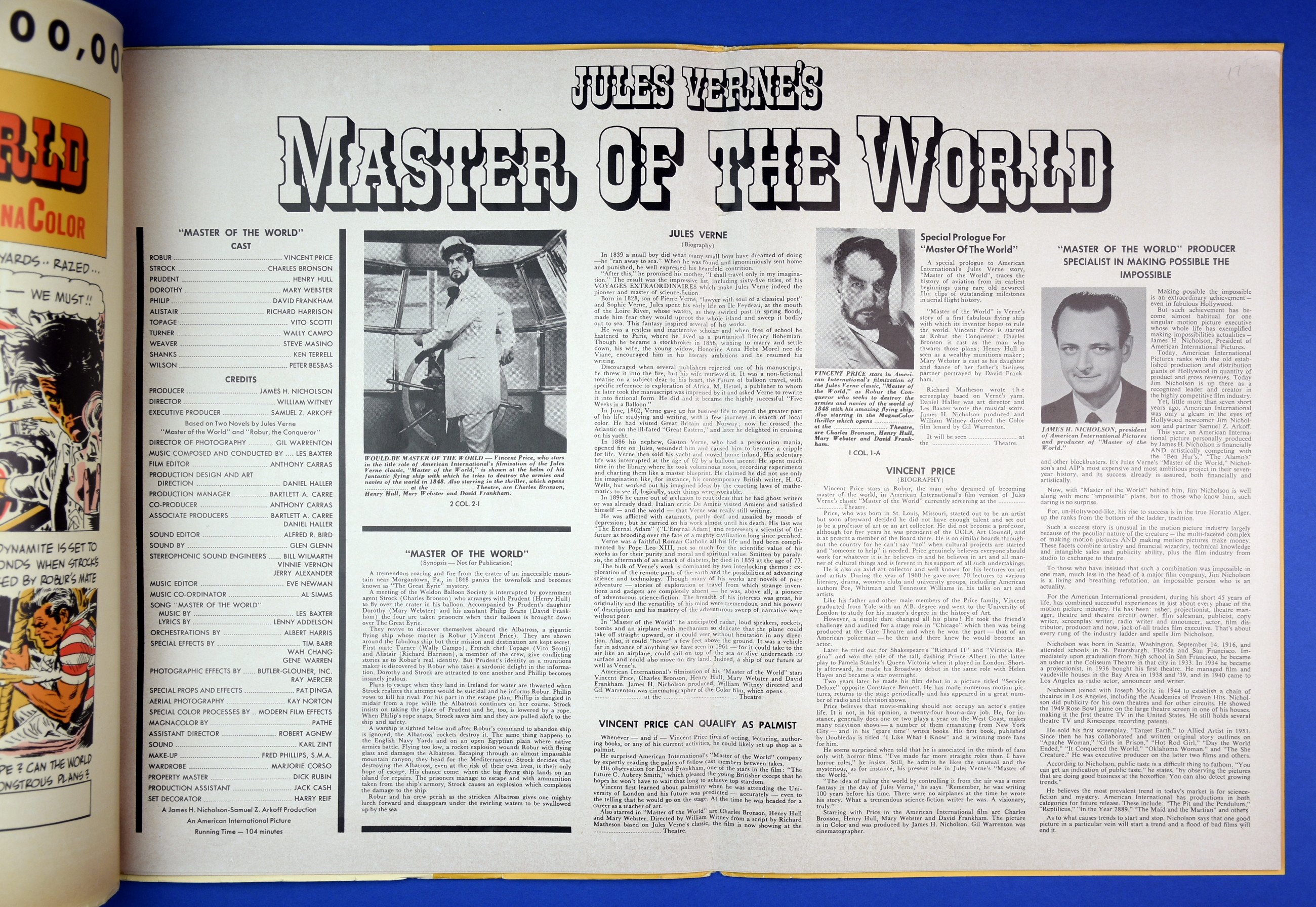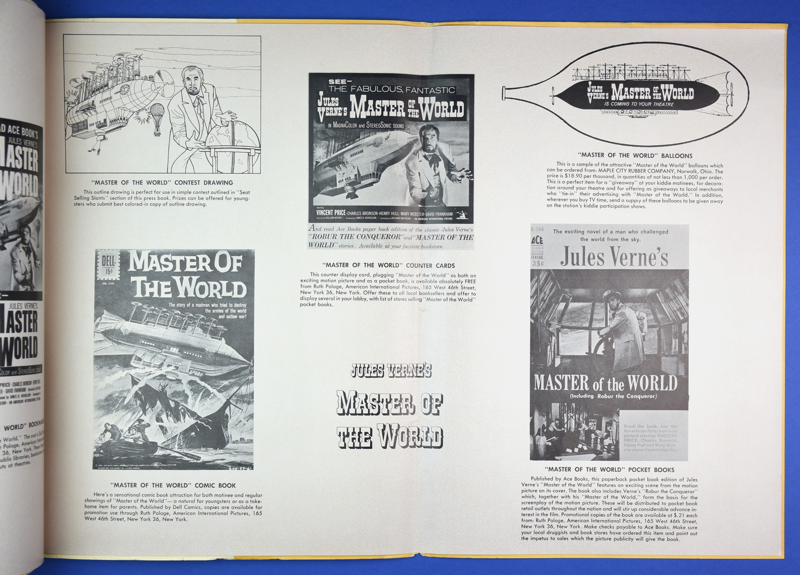 This large 15 by 22 inches pressbook for Jules Verne's Master of the World, starring Vincent Price, has stiff covers, lots of promotional material, and a polished page layout. All of this presents quite a "selling" package to movie theaters, and indicative of American International's use of quality pressbooks for movies where Vincent Price is involved. (See The Tomb of Ligeia and The Haunted Palace.)
