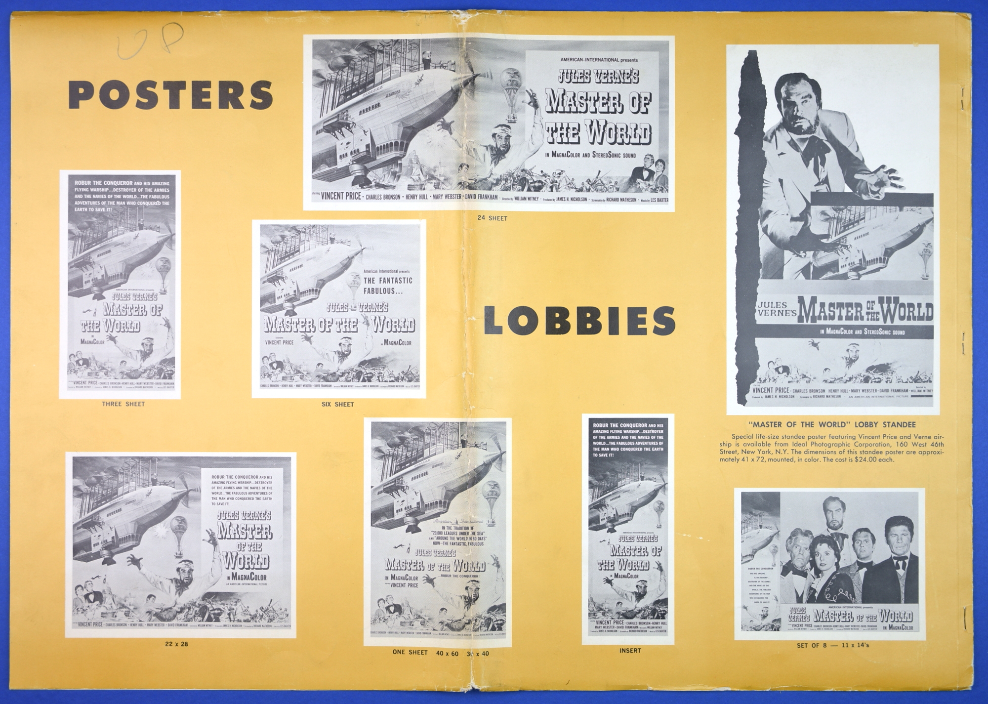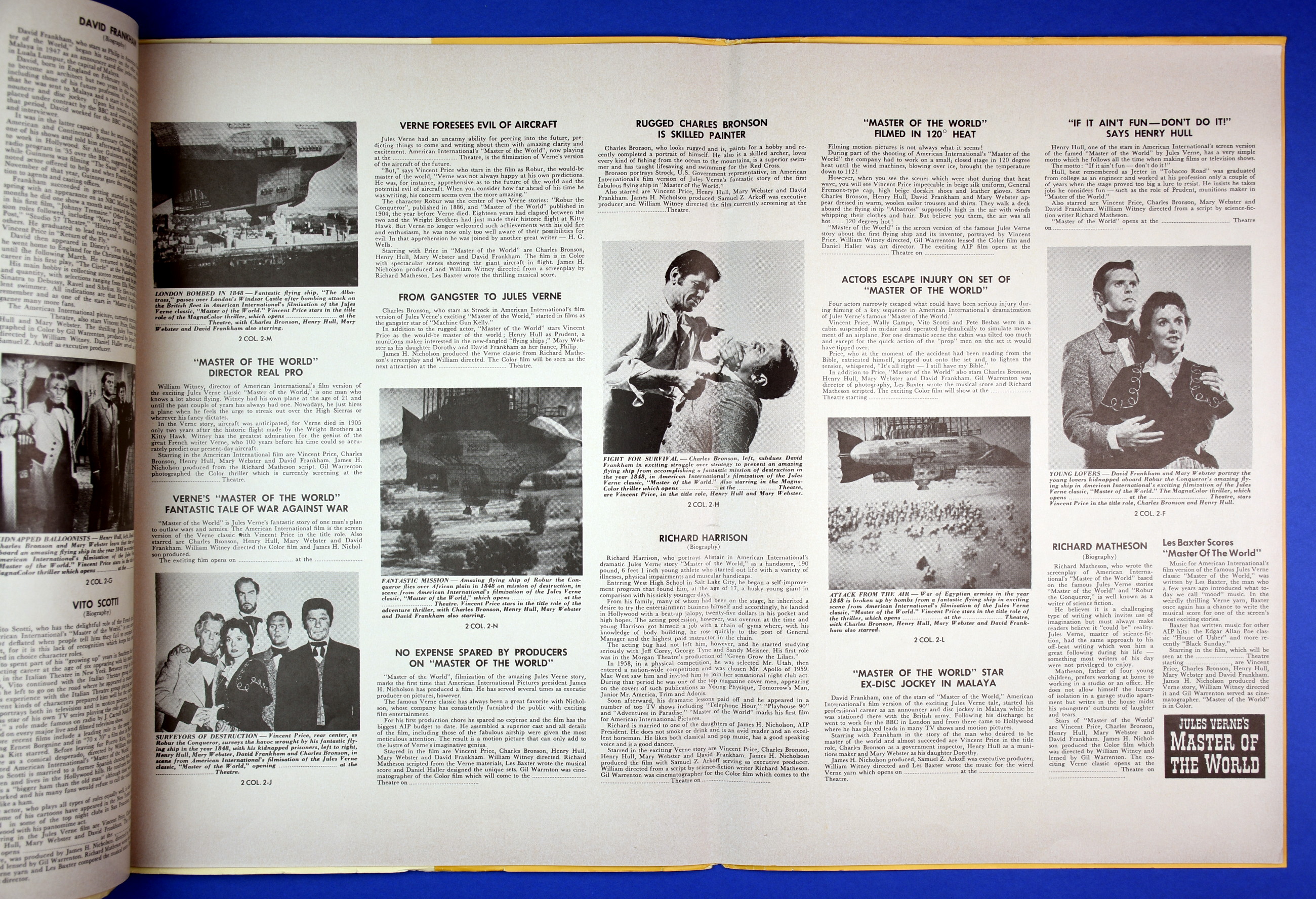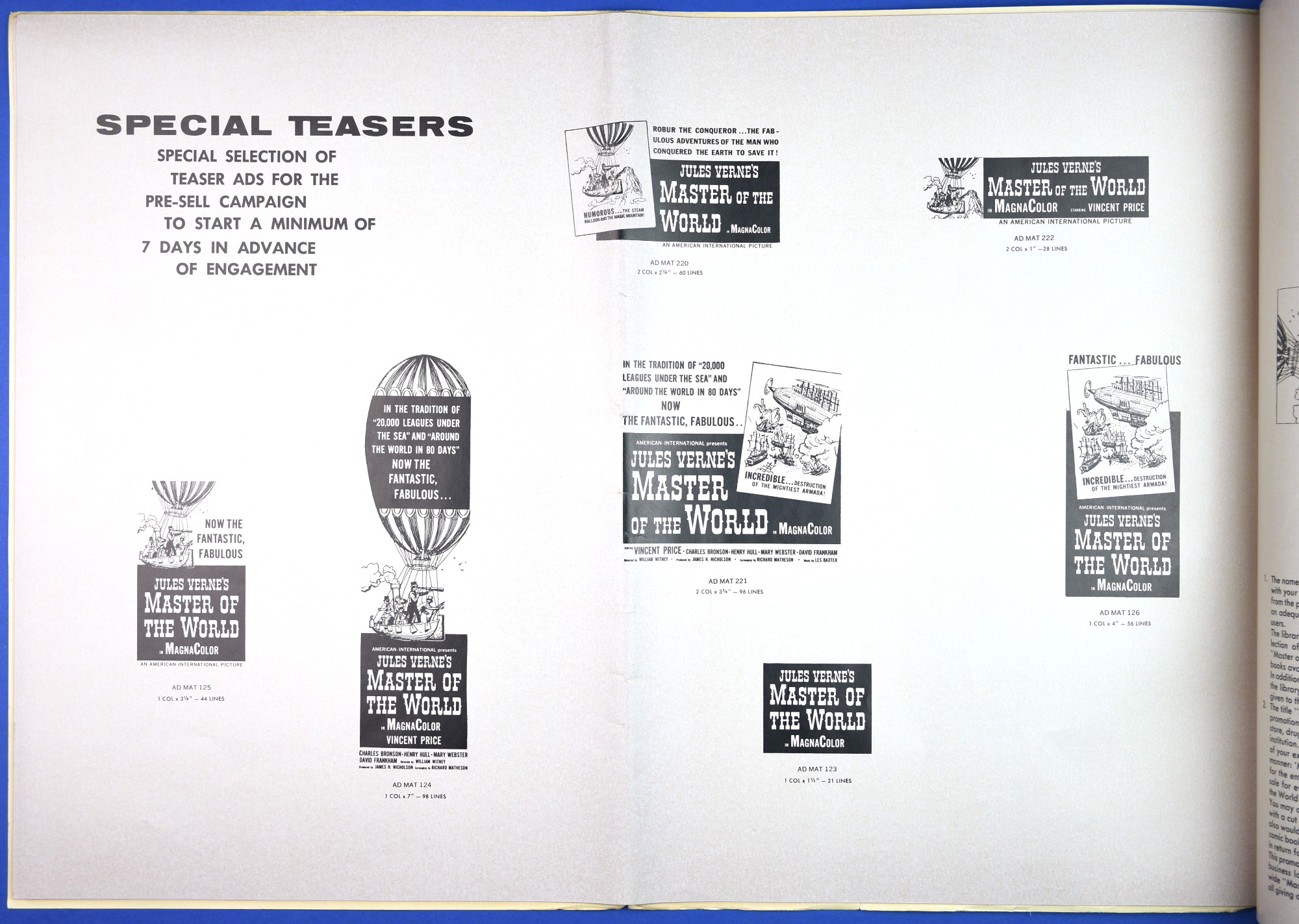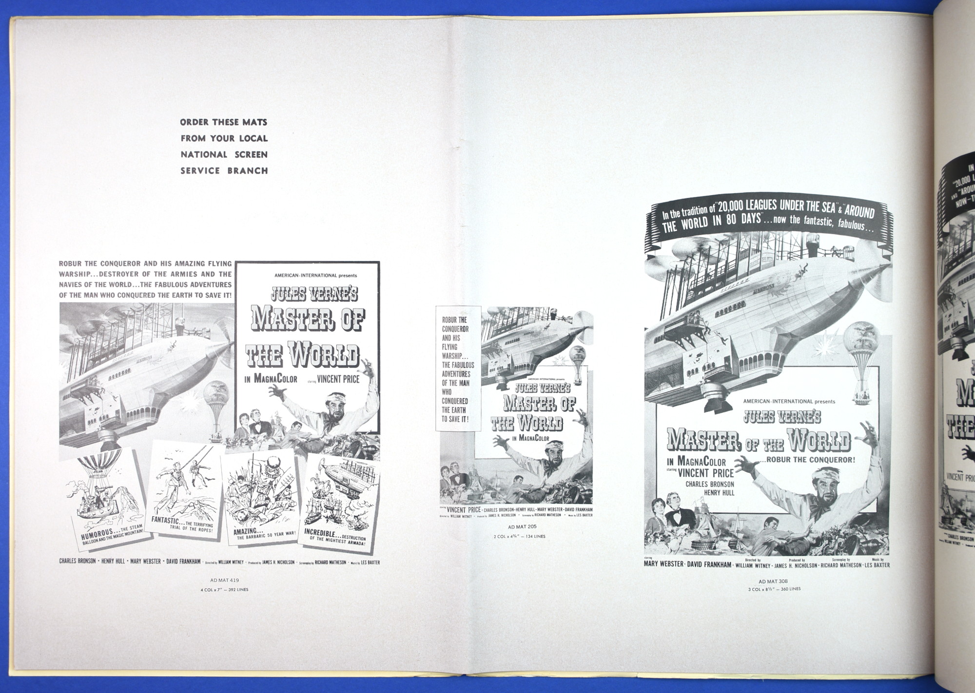 This large 15 by 22 inches pressbook for Jules Verne's Master of the World, starring Vincent Price, has stiff covers, lots of promotional material, and a polished page layout. All of this presents quite a "selling" package to movie theaters, and indicative of American International's use of quality pressbooks for movies where Vincent Price is involved. (See The Tomb of Ligeia and The Haunted Palace.)