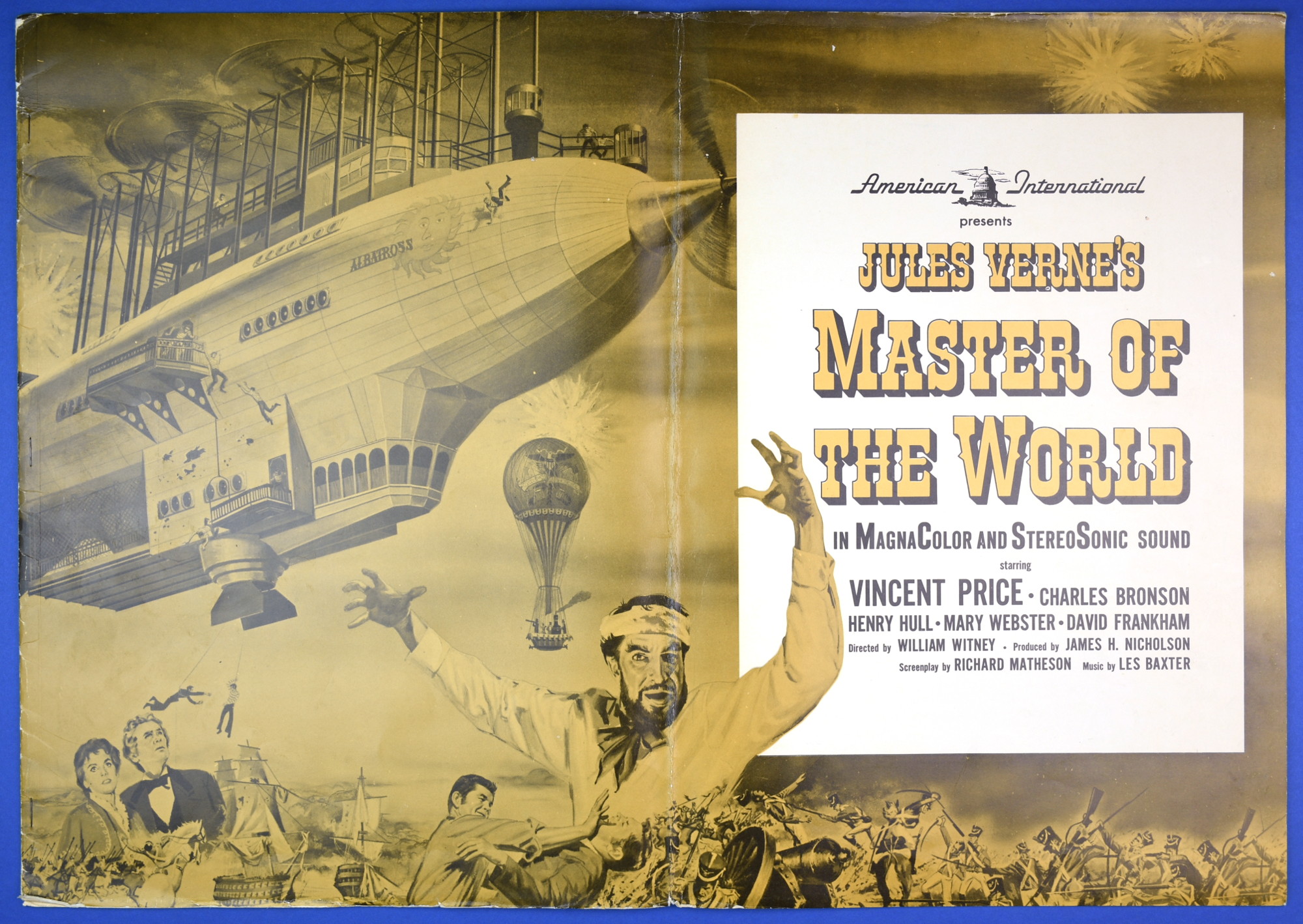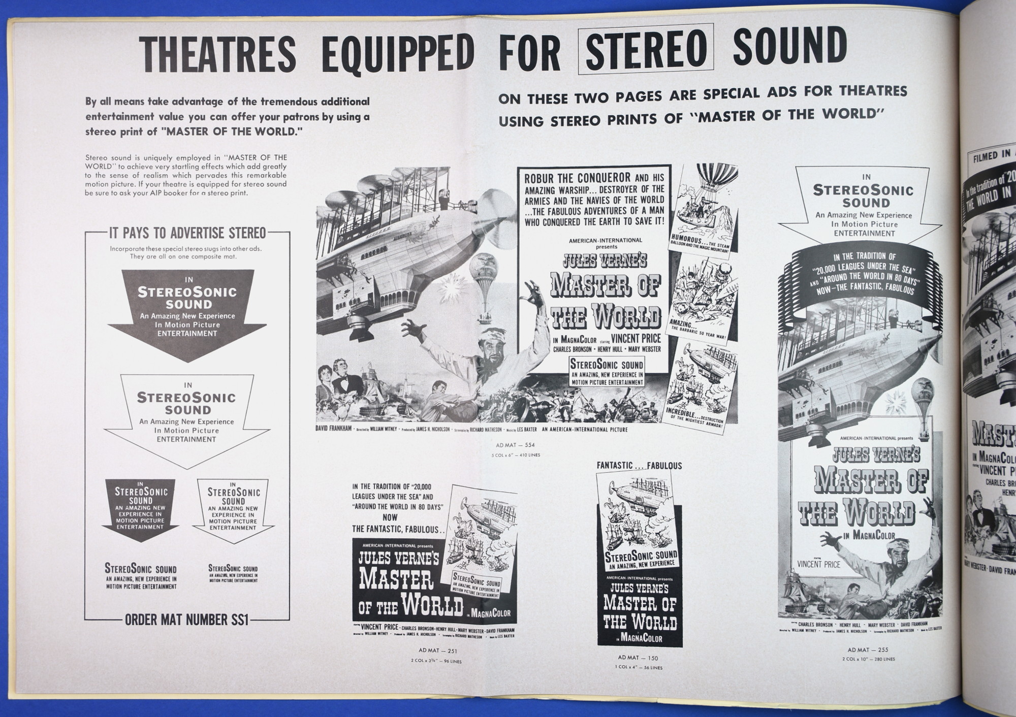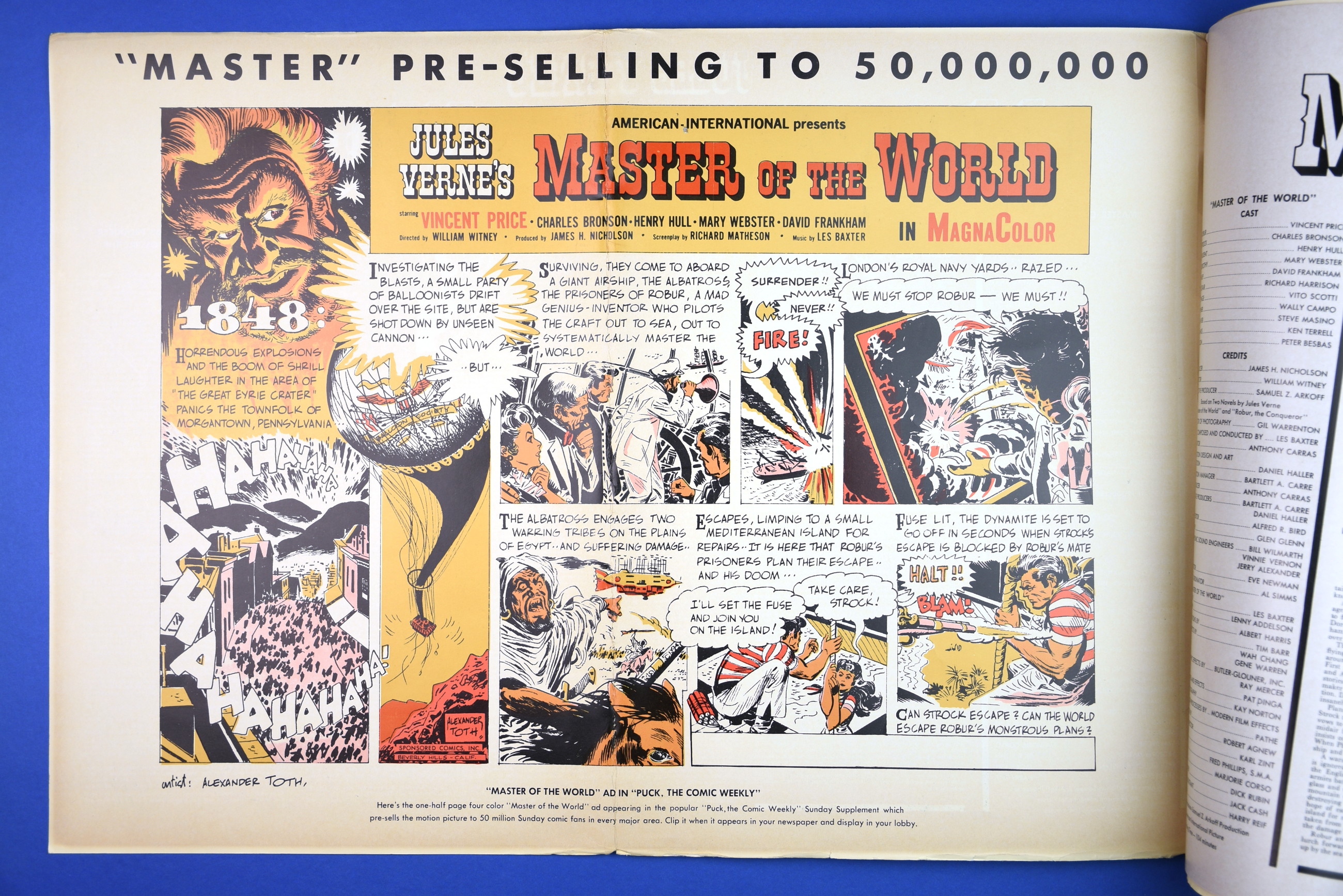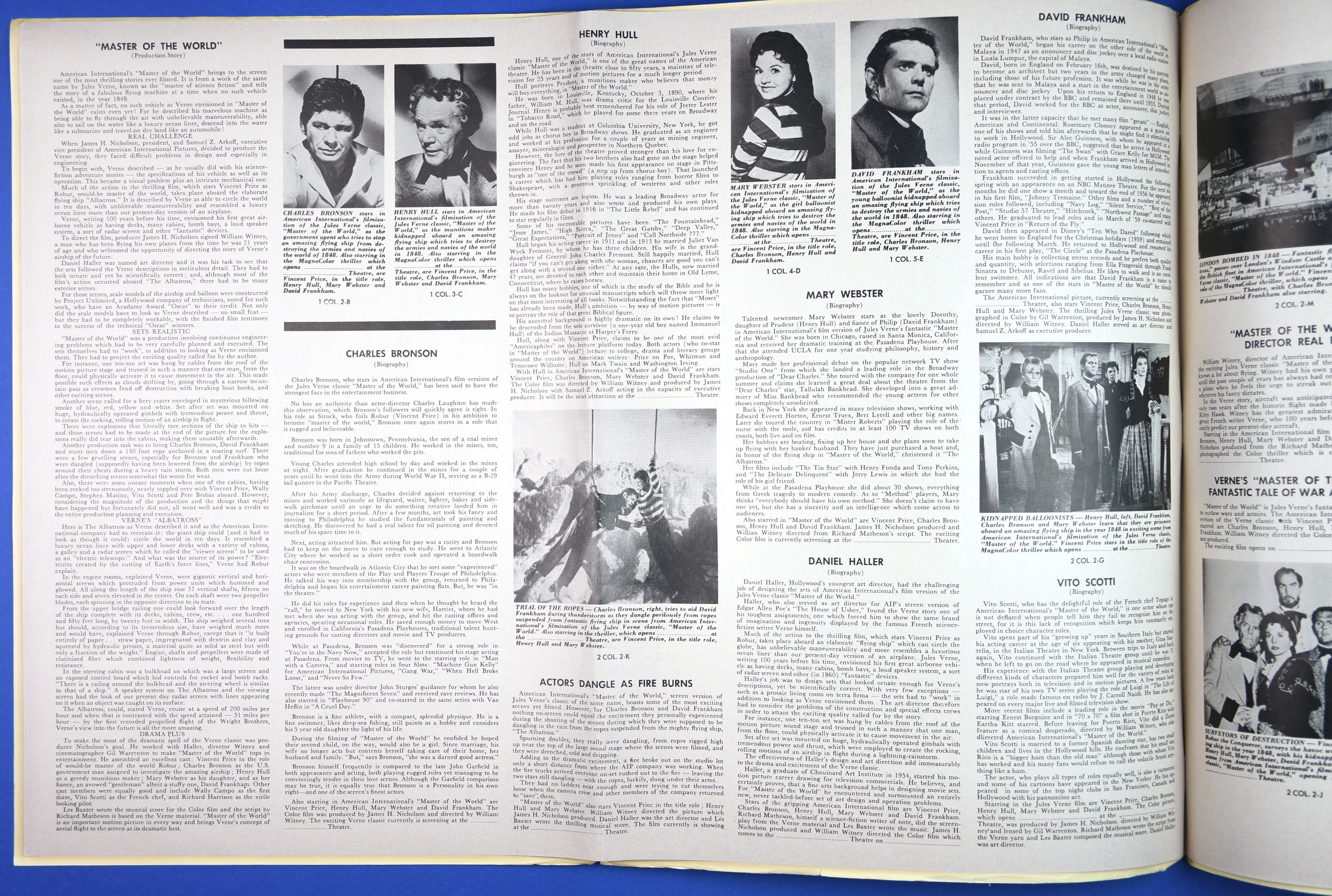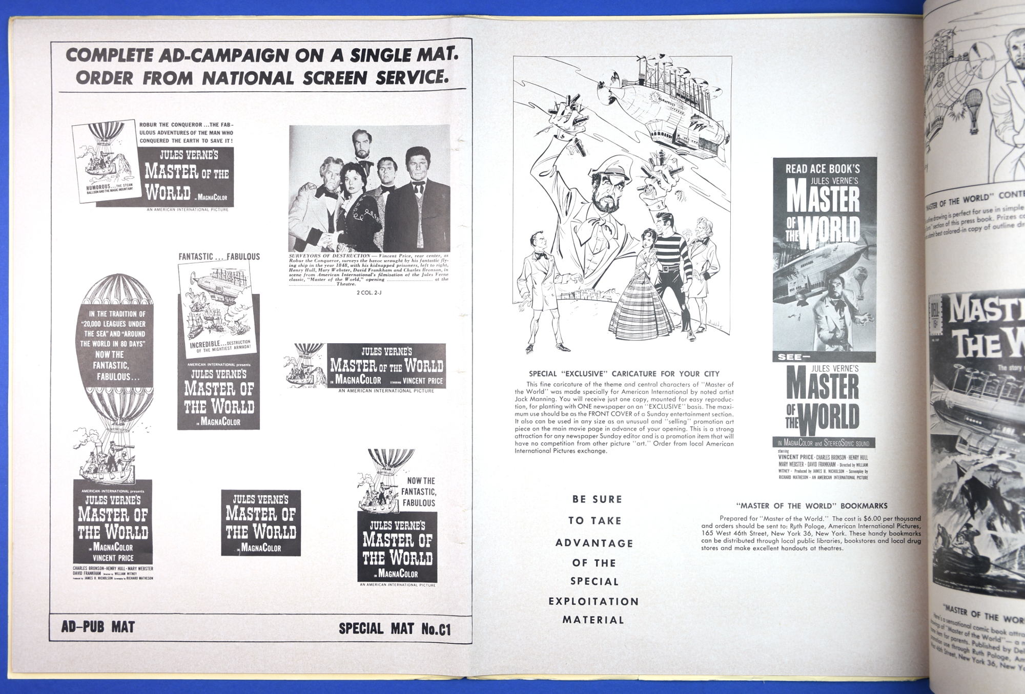 This large 15 by 22 inches pressbook for Jules Verne's Master of the World, starring Vincent Price, has stiff covers, lots of promotional material, and a polished page layout. All of this presents quite a "selling" package to movie theaters, and indicative of American International's use of quality pressbooks for movies where Vincent Price is involved. (See The Tomb of Ligeia and The Haunted Palace.)