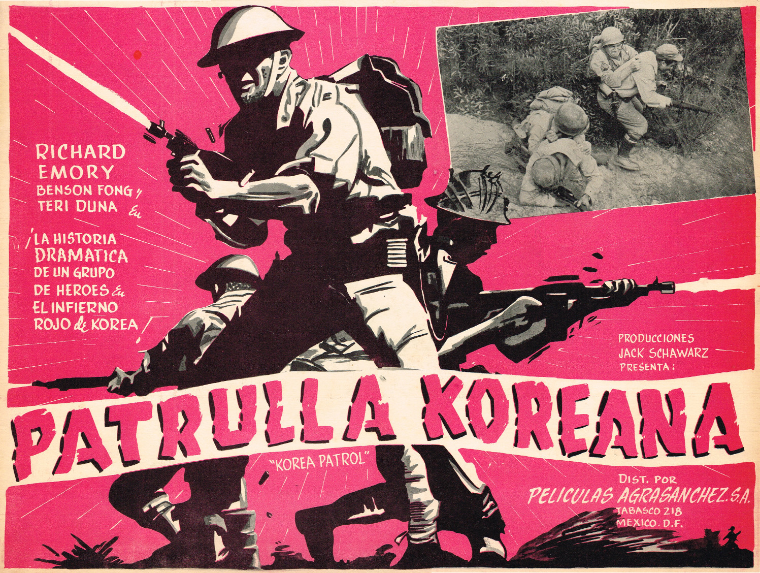 Kinetic illustration with heavily shadowed combatants contrasted against a bright color make this Mexican lobby card for Patrulla Koreana a romanticized art piece for the ugly actions of war. (See an alternate version, Los Tigres De Korea.)