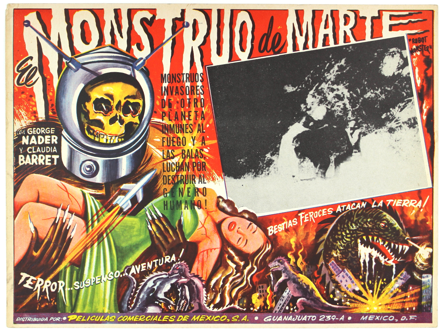 Here's another version of the Mexican lobby card for Robot Monster, El Monstruo De Marte. The lobby cards are definitely much more exciting than the movie. I'm guessing the inset scene shows the gorilla with the rabbit ears–you youngin's go google "rabbit ears"–choking some poor actor who realized this movie was really really bad and wanted out. But with a few Red's Apple Ale (or any suitable hard cider of your choice), this movie's a wild hoot of fun (on a par with Spookies or The Video Dead).