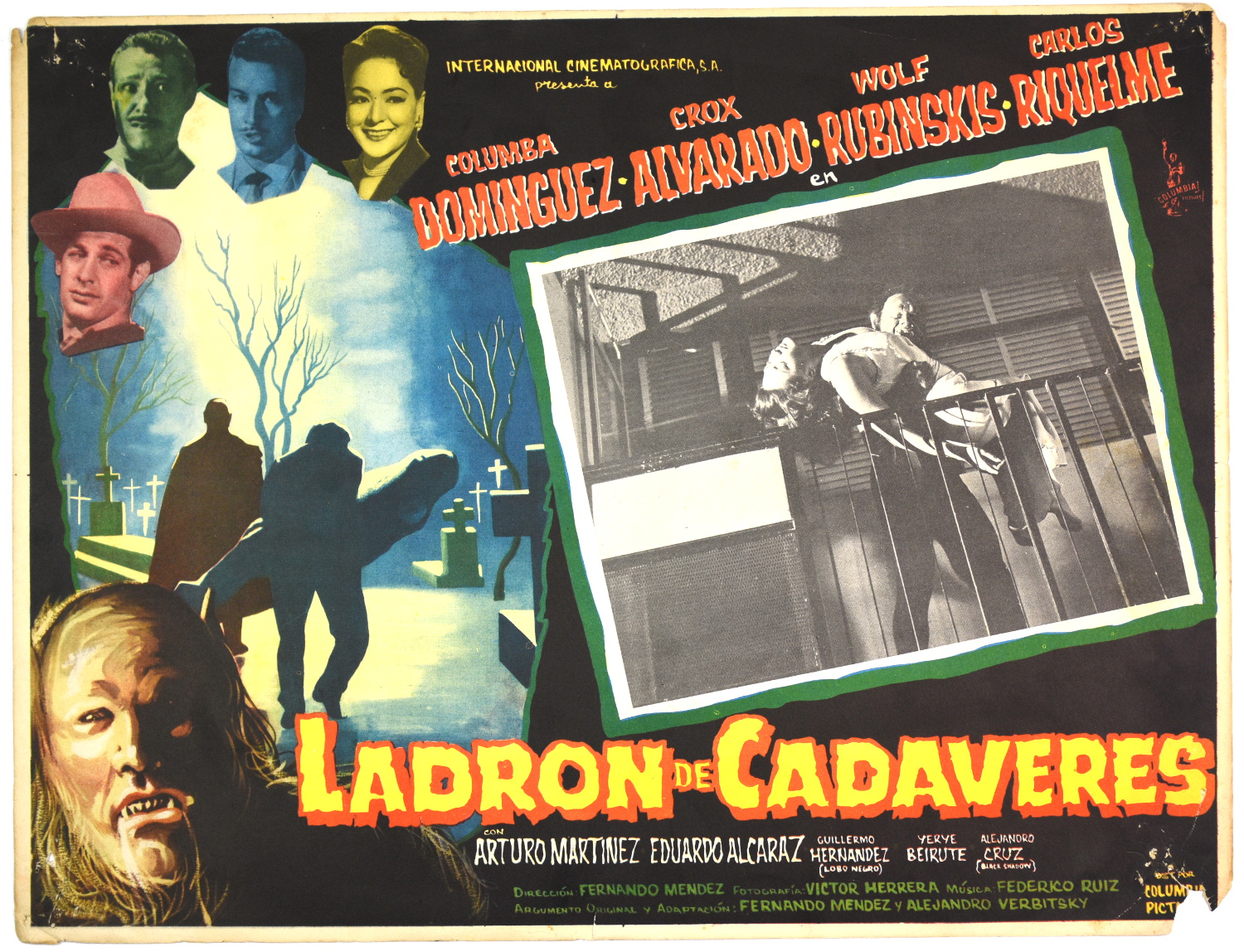 A wrestler is forced to swap brains with a gorilla, the usual mayhem ensues: Ladron De Cadaveras, The Body Snatchers. This Mexican lobby card is unbalanced with the floating heads added in the top left corner, but from bottom left to top right, there’s a more stylized flow showing.