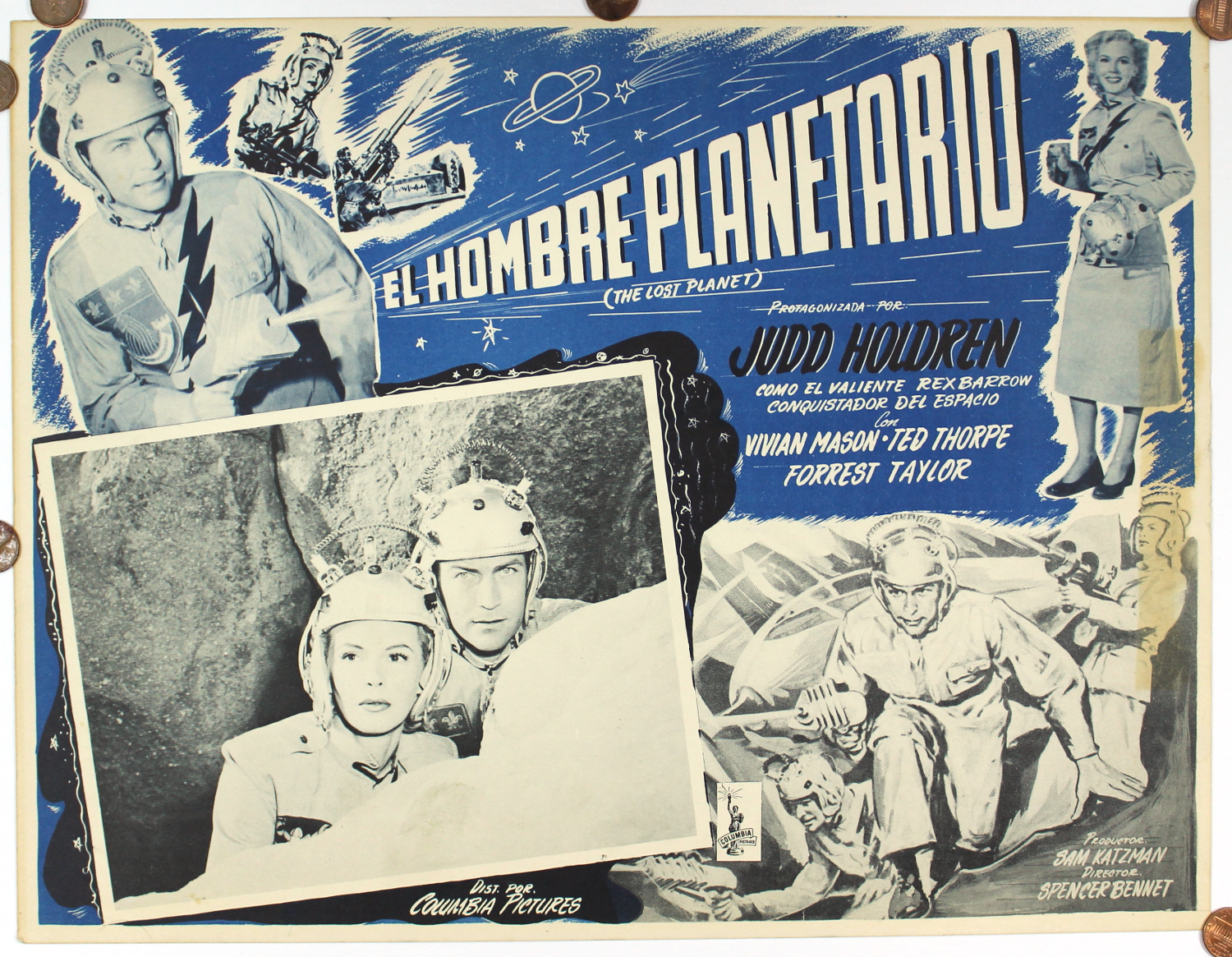 This is the Mexican lobby card for The Lost Planet (but not one called pennies), a 15 chapters, Columbia serial. Wikipedia says it’s the last sound serial made, so that makes it worth seeing (along with the helmets).