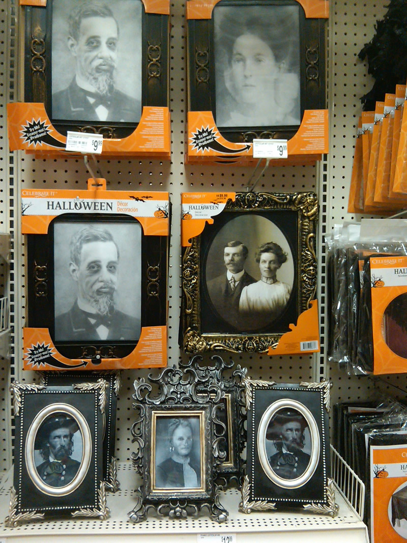 Michaels has their Halloween 2011 merchandise on the shelves. Always a good place to stock up on Lemax Spooky Town dens and denizens, Michaels offers a great lenticular portrait selection to accent your decaying decor just right. I'm a sucker for old-timey shooting galleries, and this year there's a cool arcade tableau I can add to my Spooky Town. The housing prices are a bit steep, though, so you may need to hock some bones.