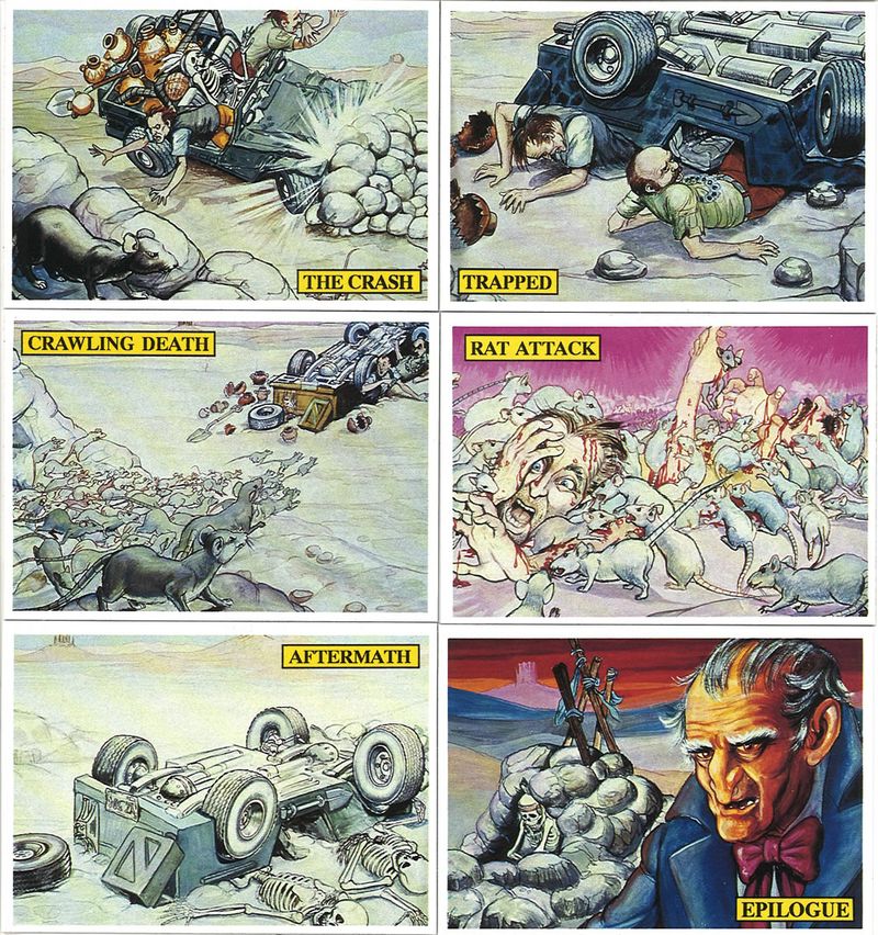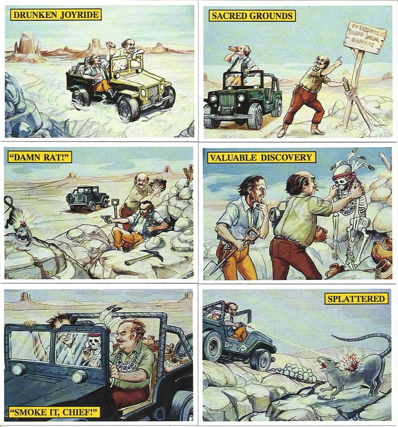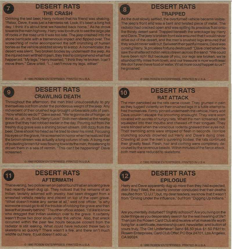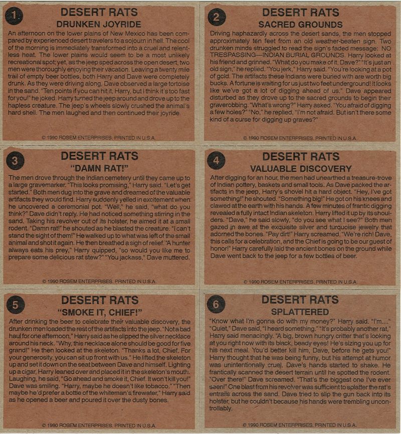 Here is the twelve card story for my favorite one in the series, Desert Rats, from Rosem’s Midnight Madness Card Set. Story is by Steve Kiviat, and illustrations by Alfredo Osorio. (Copyright 1990 by Rosem Enterprises.)