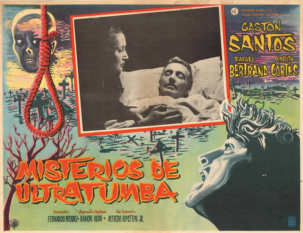 This Mexican lobby card for The Black Pit of Dr. M (1959) uses a visage in the upper left corner familiar to classic horror movie fans: the Phantom of the Opera. That caught my attention. Of course, the noose, the tombstones, and the effectively chilling font and colors caught my attention, too.