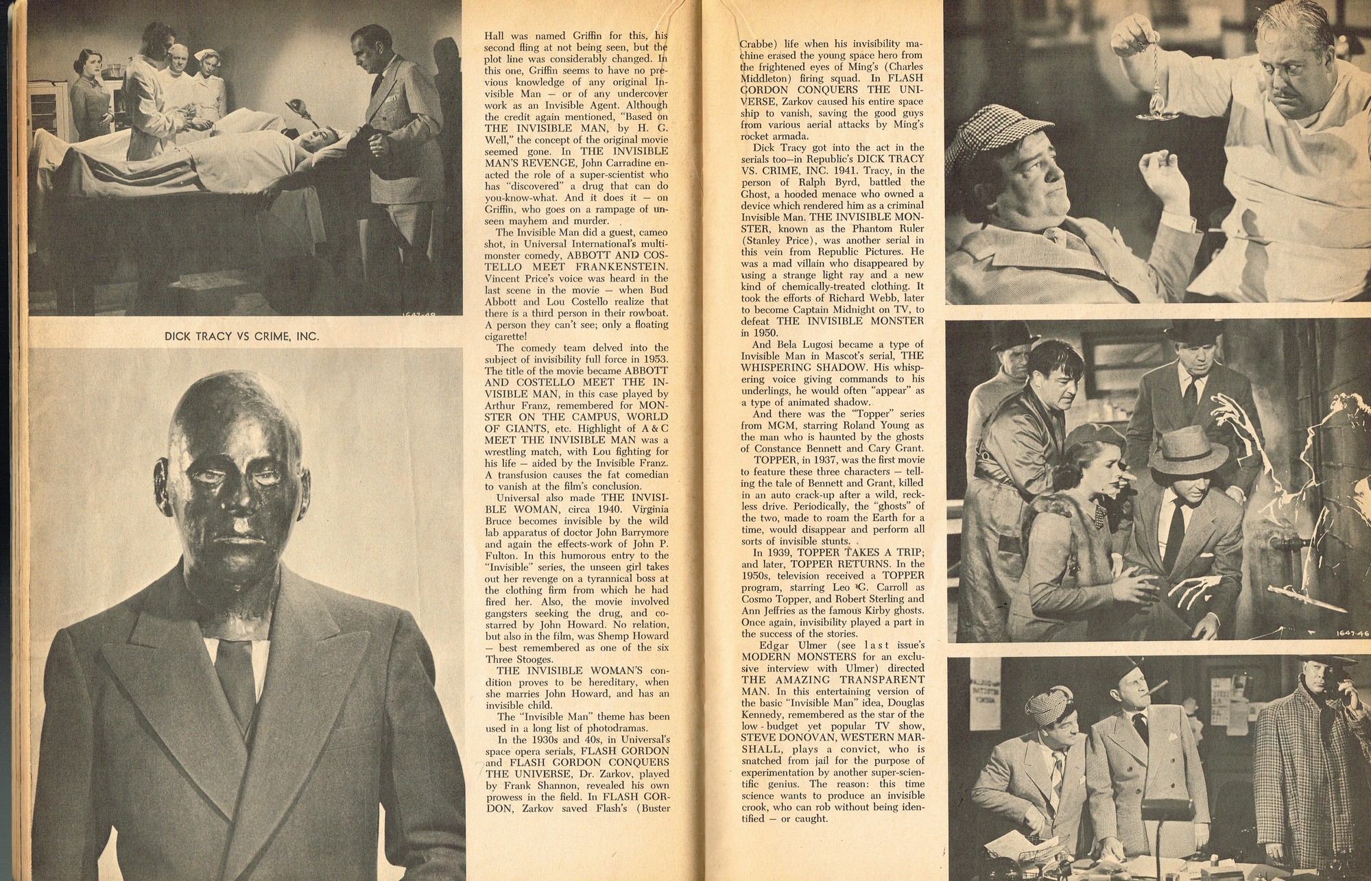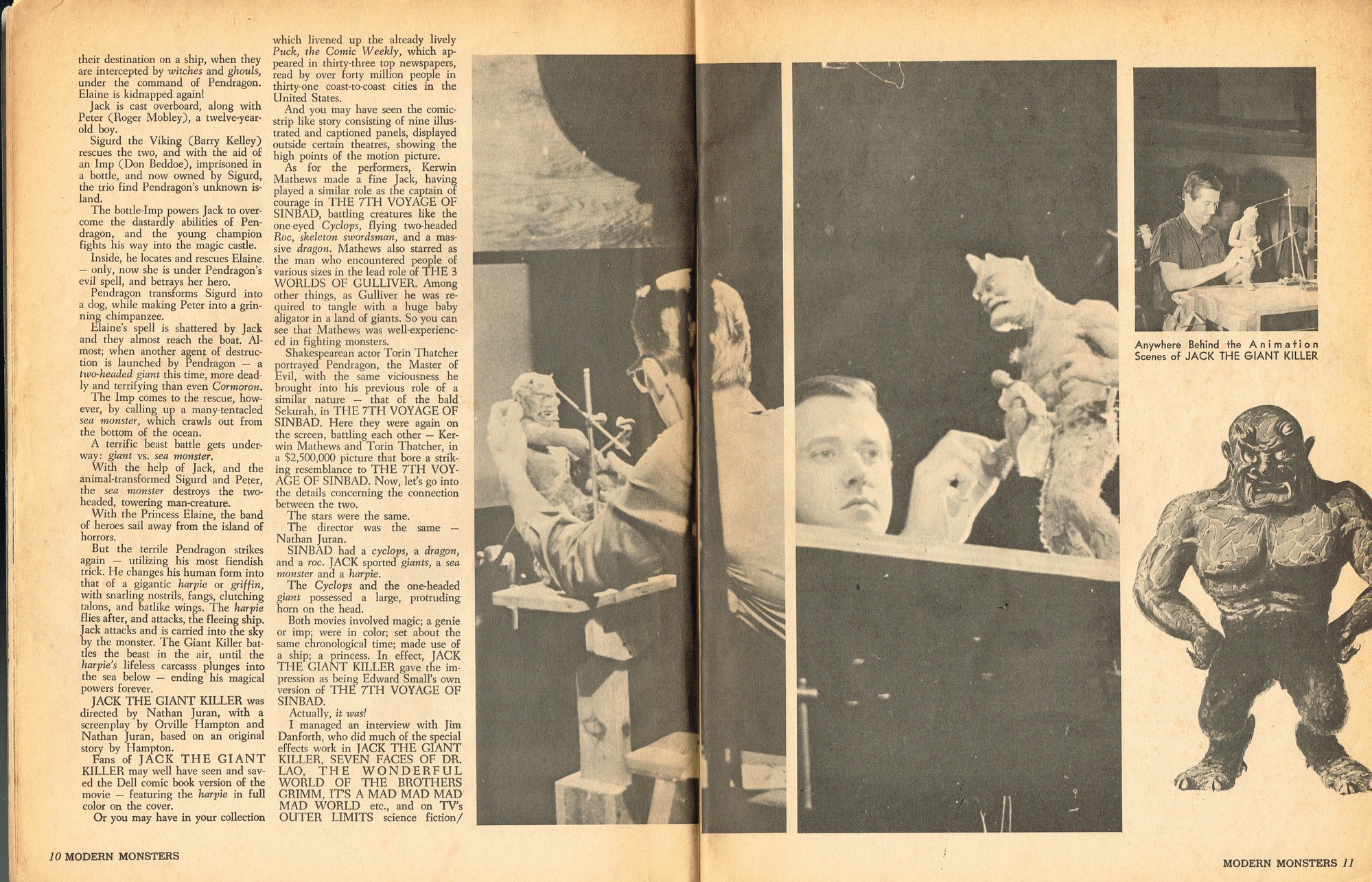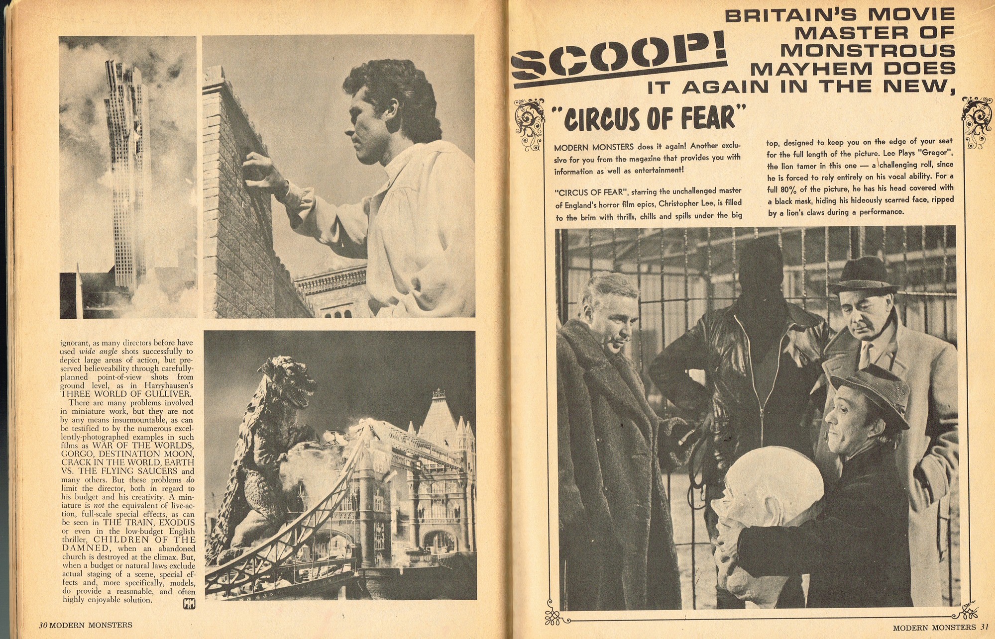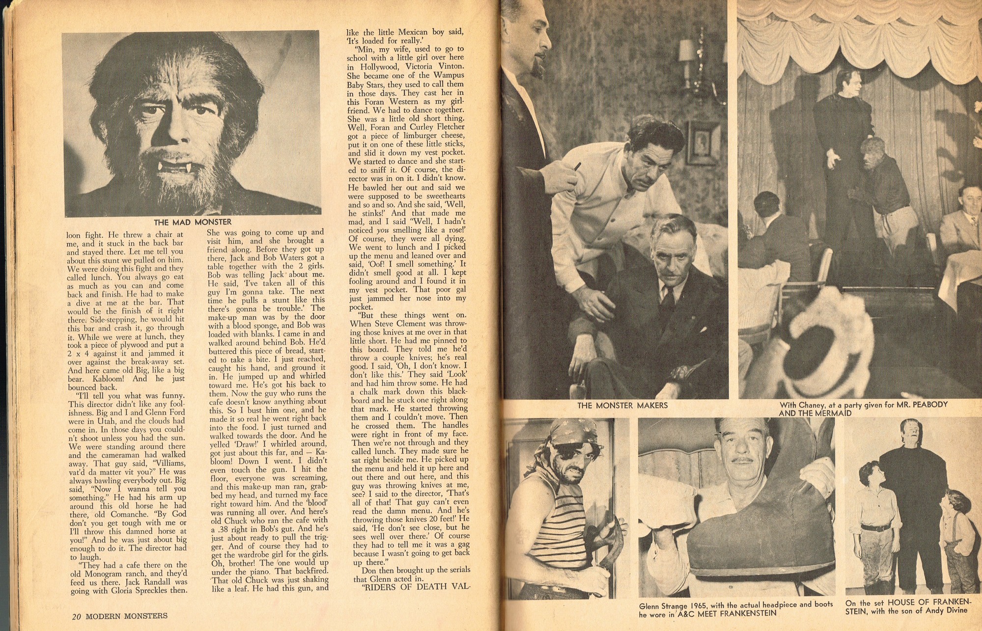A very good monster magazine for the 1960s, Modern Monsters was more adult with its coverage of horror. In this issue 4, Glenn Strange provides interesting behind-the-scenes tidbits from his horror jaunts, Miniatures-Kill or Cure? is pondered by Bob Villard, and Victor Morrison shows us The Invisible Man and His Friends, or something like that. There’s a full color centerfold to pin up, and King Kong and Spy Smasher are examined. At over 80 pages, with pictures galore, and layout that’s plain but easy-reading, it’s a shame Modern Monsters didn’t continue past four issues. (Go to part 2)