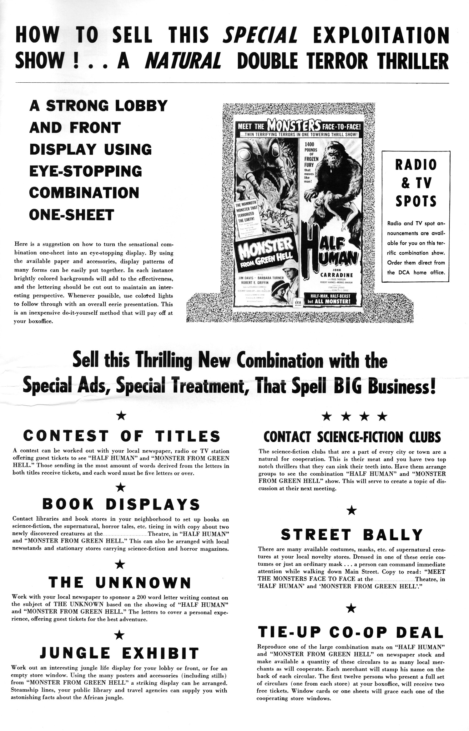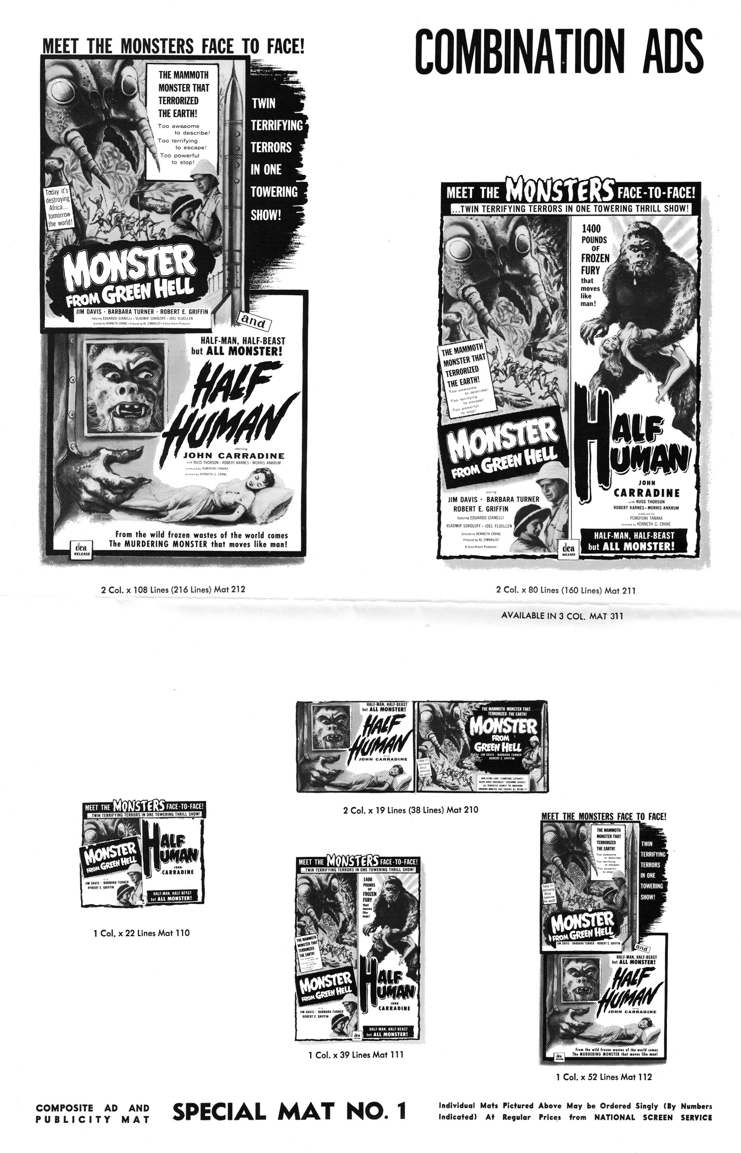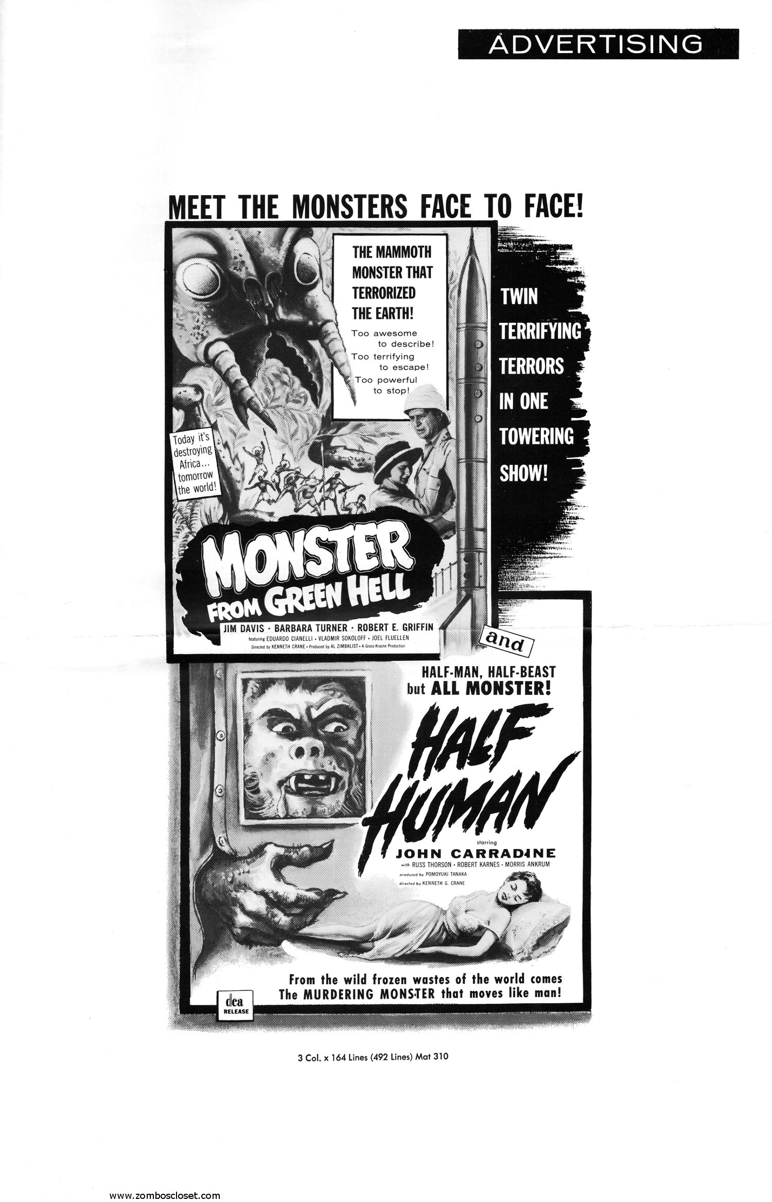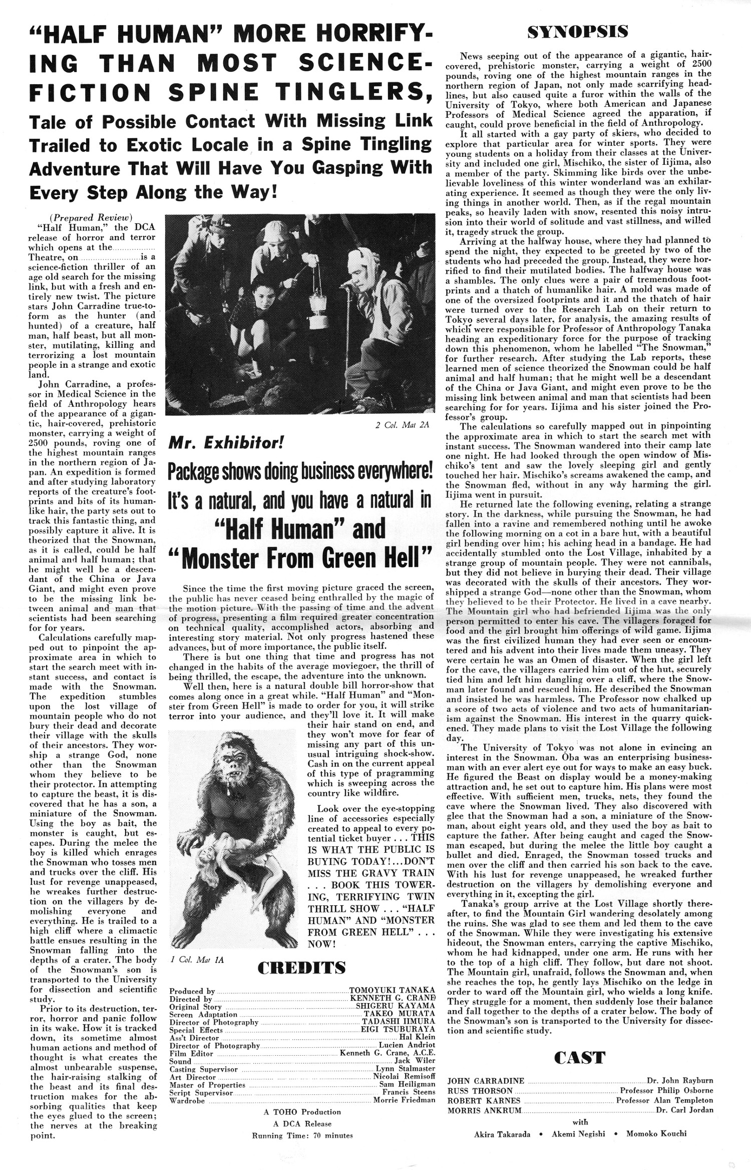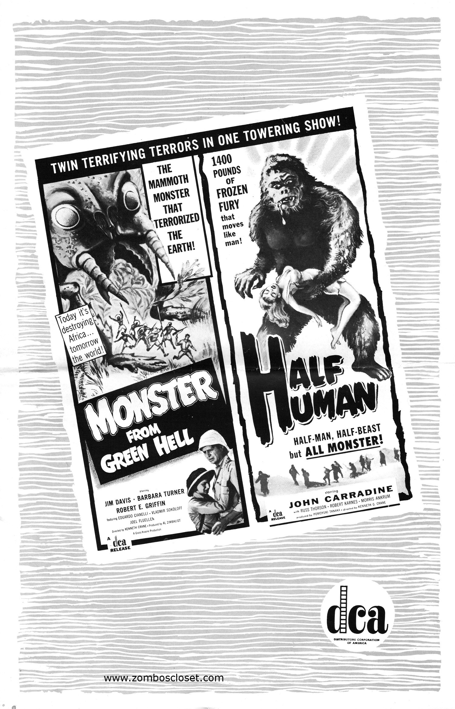 You can see the movie theater herald for this double bill here. And if you have a comic reader, here's the cbz file of this Monster From Green Hell and Half Human pressbook. MFGH also appeared with The Brain From Planet Arous (one of my favorites!). According to the DCA Wikipedia entry, "among the last films DCA distributed were Half Human (1958), The Strange World of Planet X (1958), The Crawling Eye (1958), and Plan 9 from Outer Space (1959).