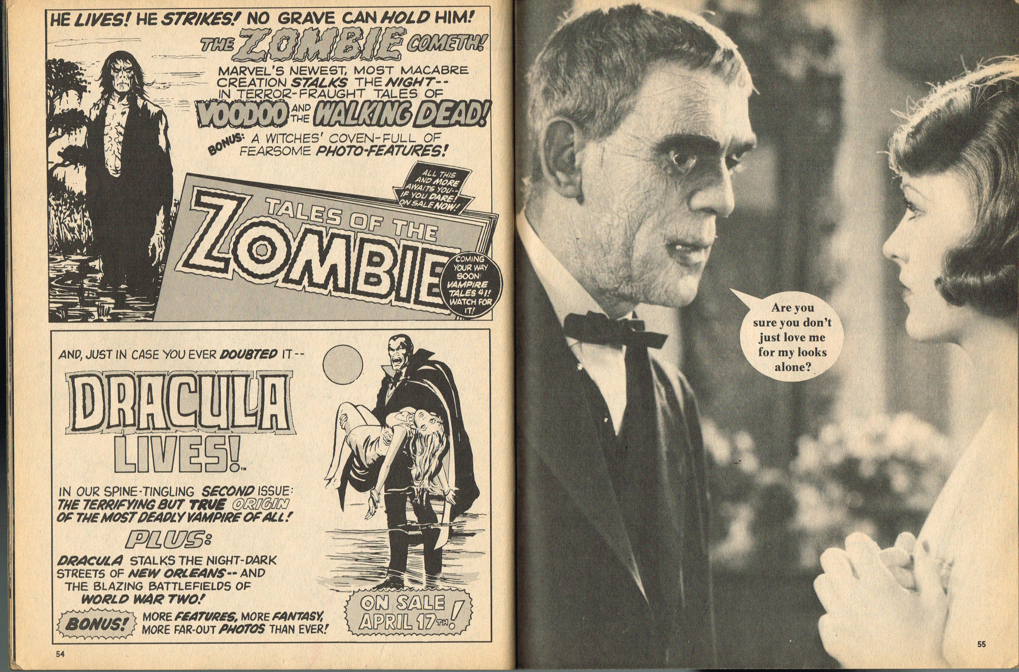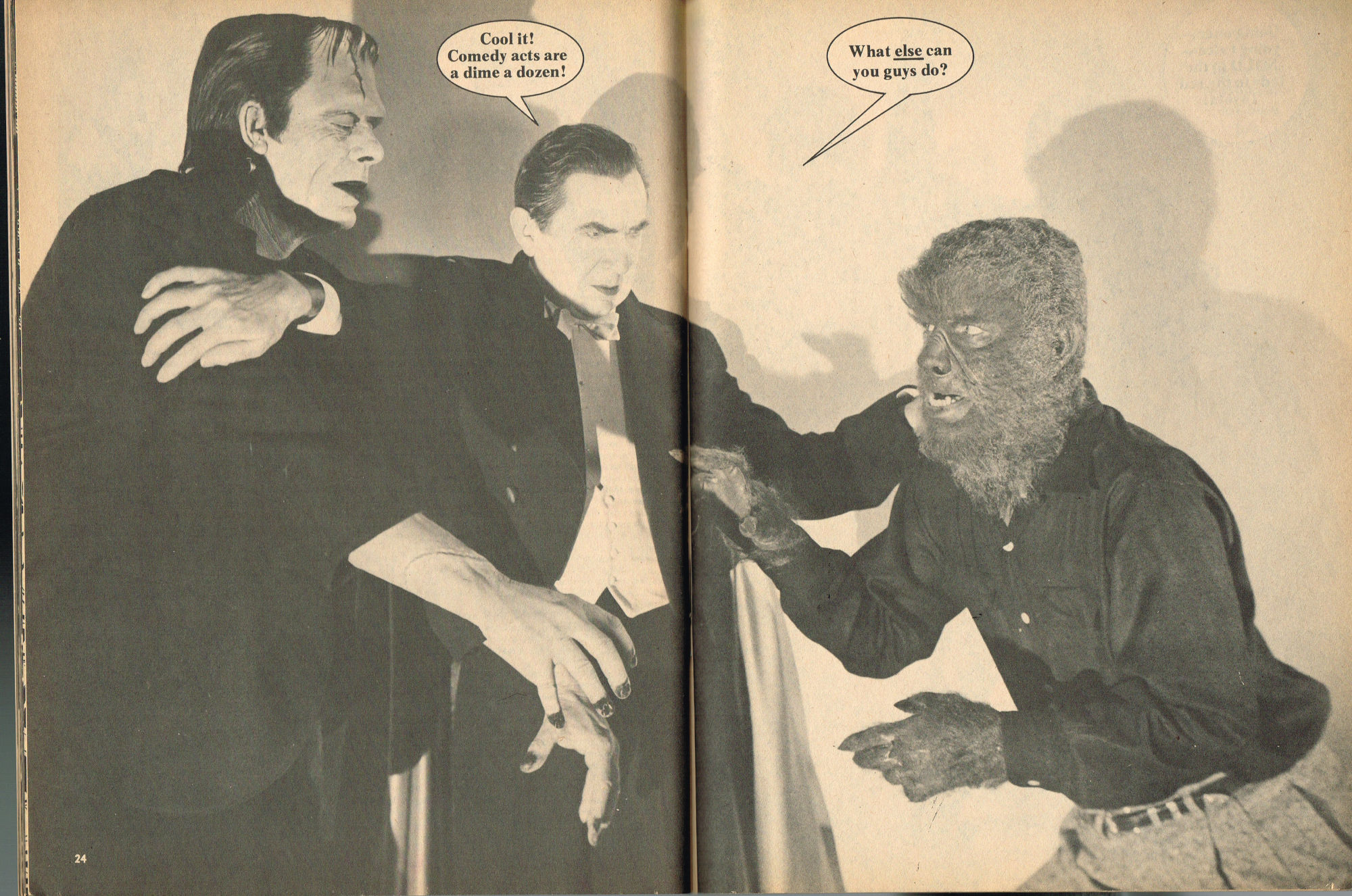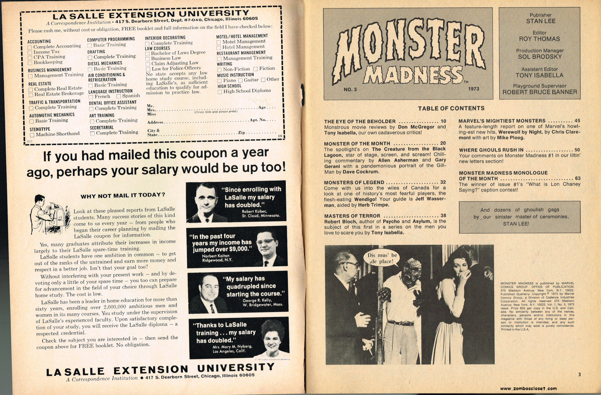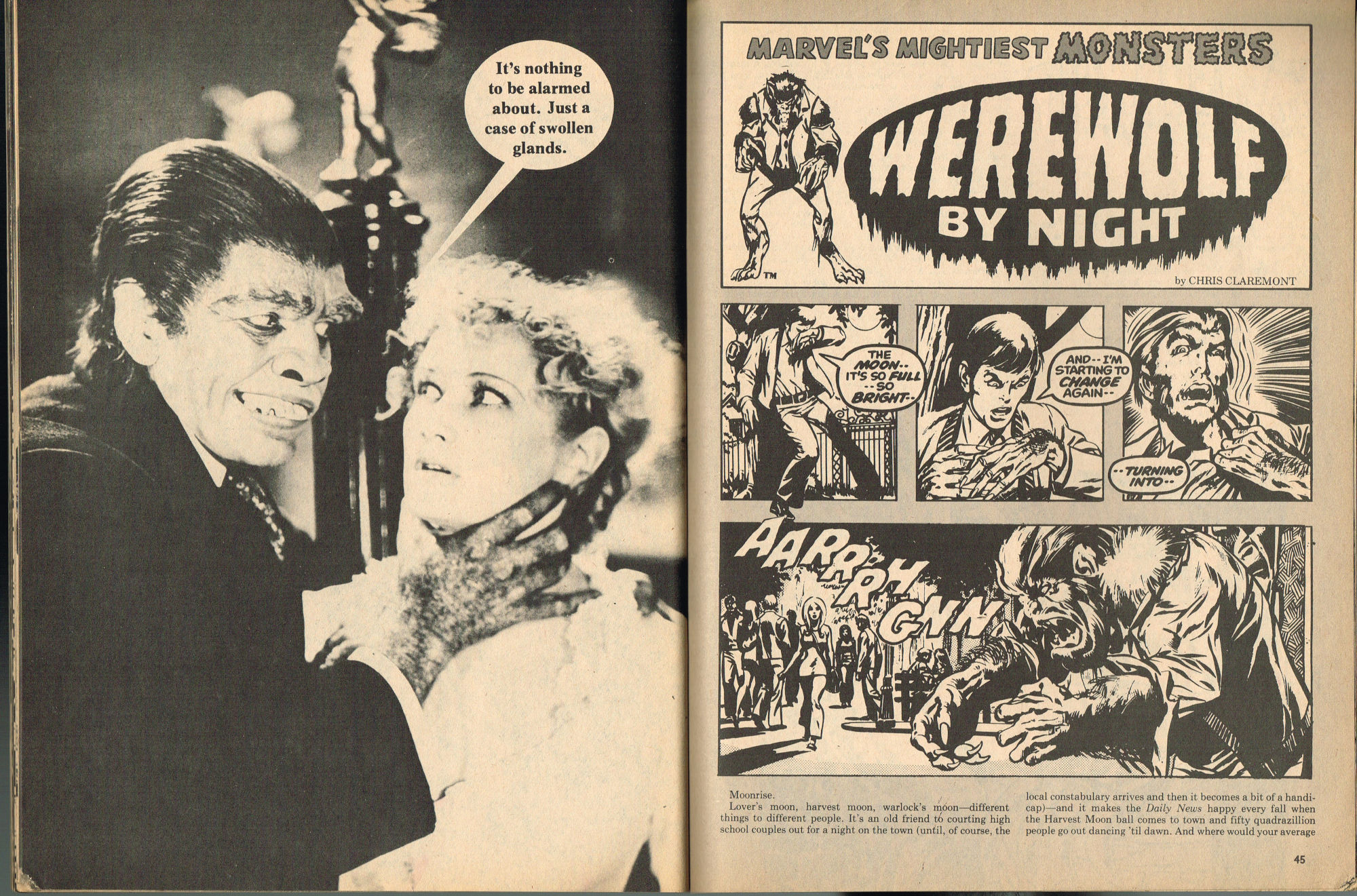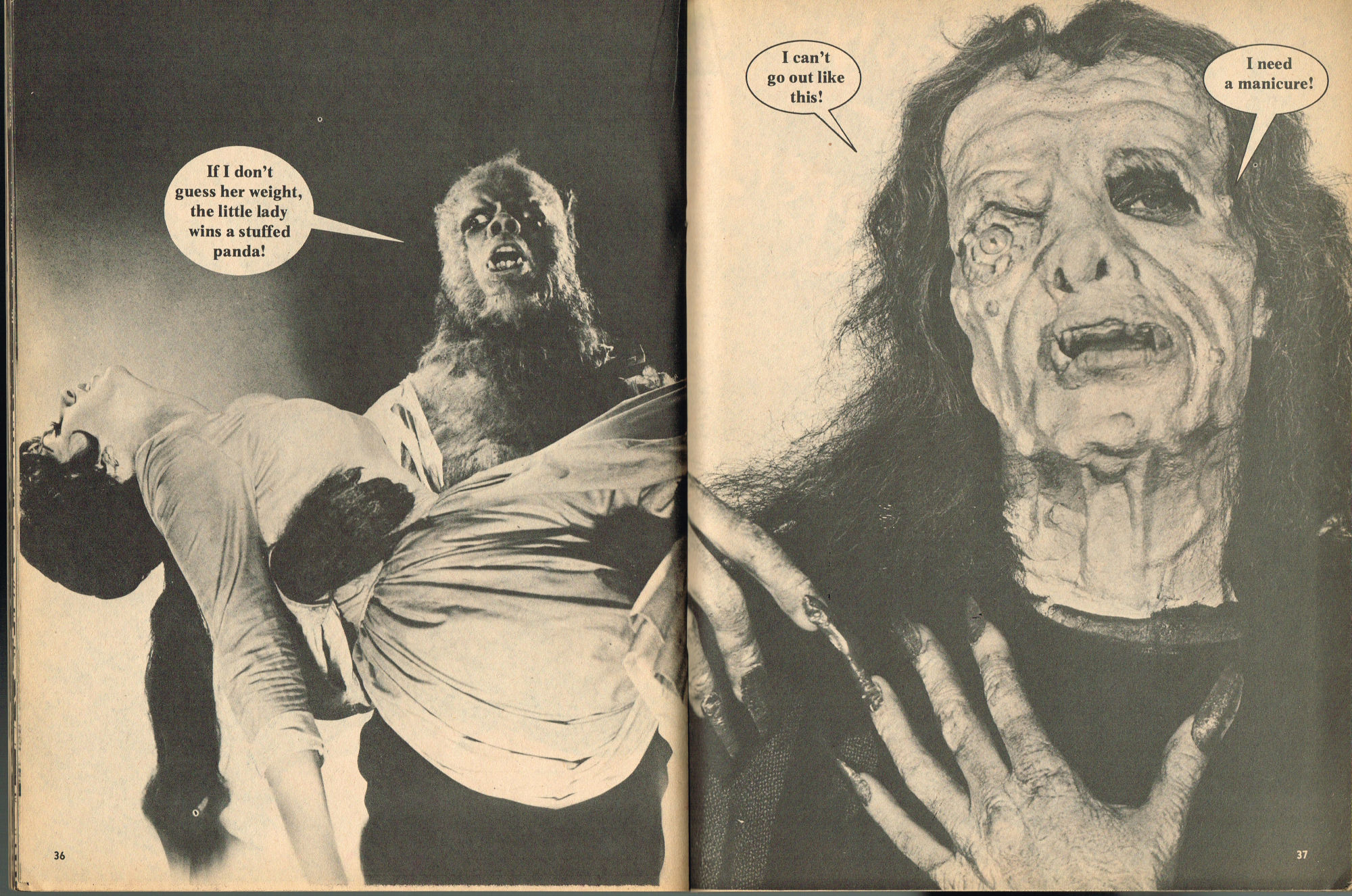 By issue 3 of Marvel's Monster Madness, it looks like the editors realized a magazine solely comprised of funny photos was no longer enough. Monsterkids, nurtured on Famous Monsters of Filmland, were growing up: they needed more meat on those monster bones to gnaw on. In this issue, aside from the many two-page photo spreads, you'll find articles on movie reviews, the Creature from the Black Lagoon as the Monster of the Month, the Fear-Fables of Robert Block, and Marvel's Werewolf by Night. Unfortunately, this would be the last issue, but Marvel would soon bring forth Monsters of the Movies to the crowded newsstands and spinner racks.