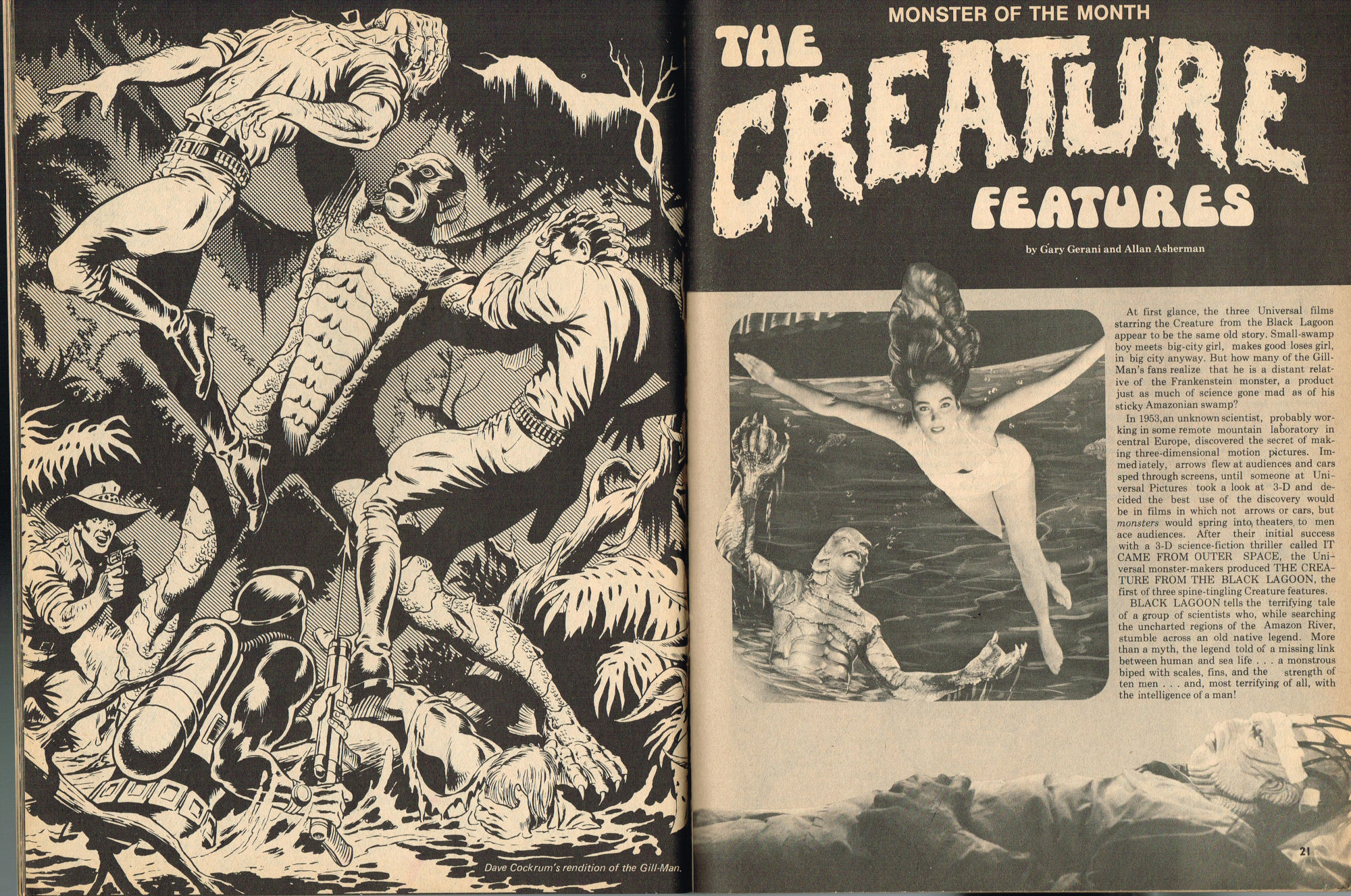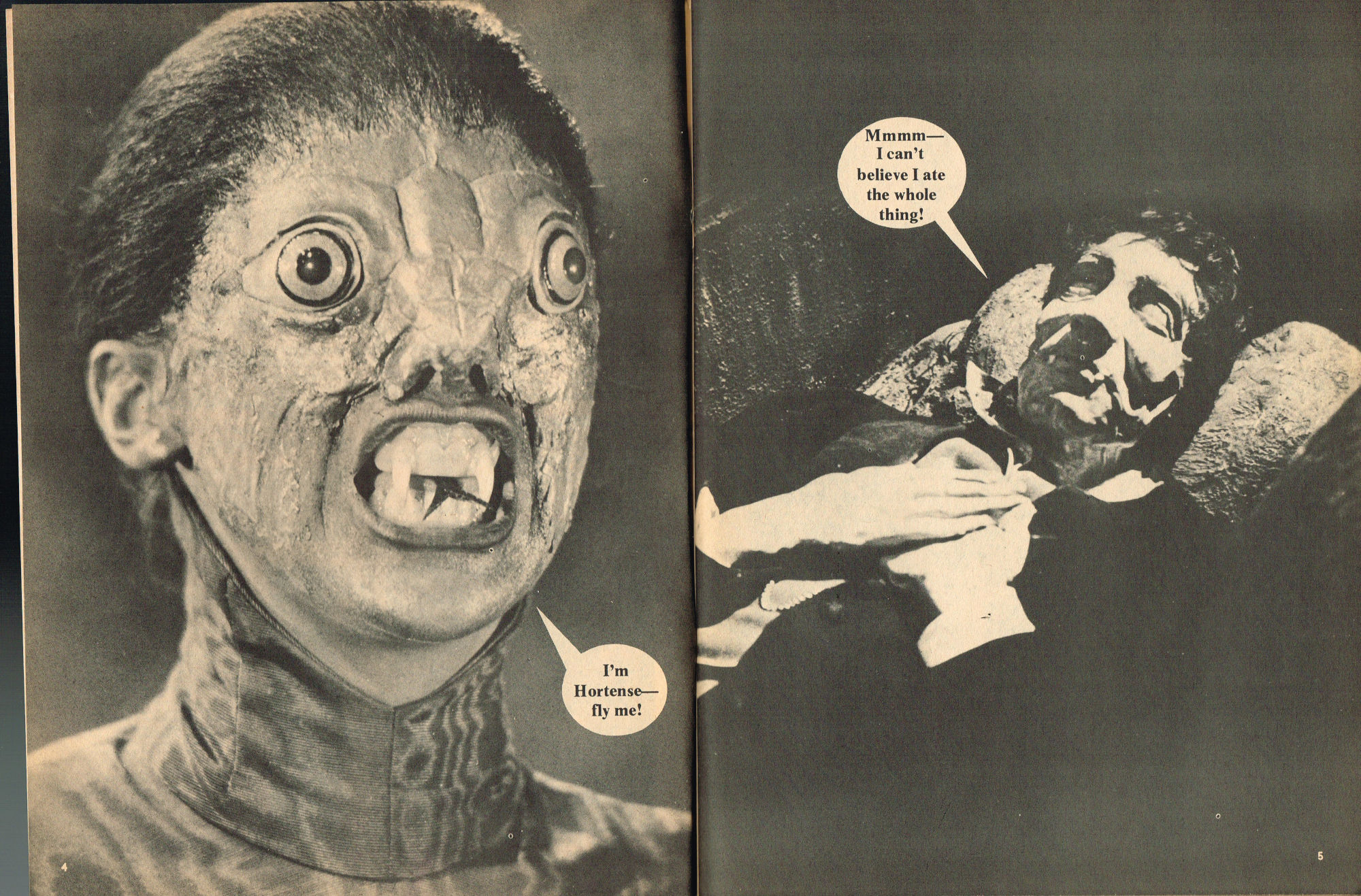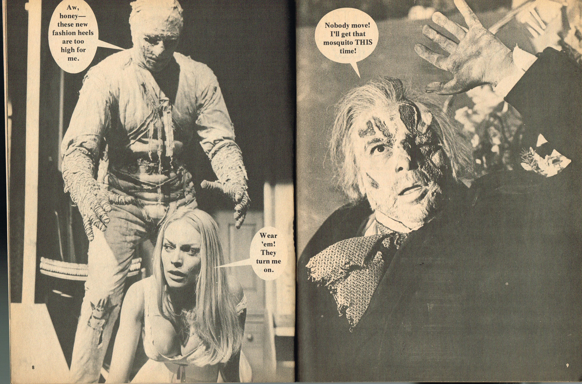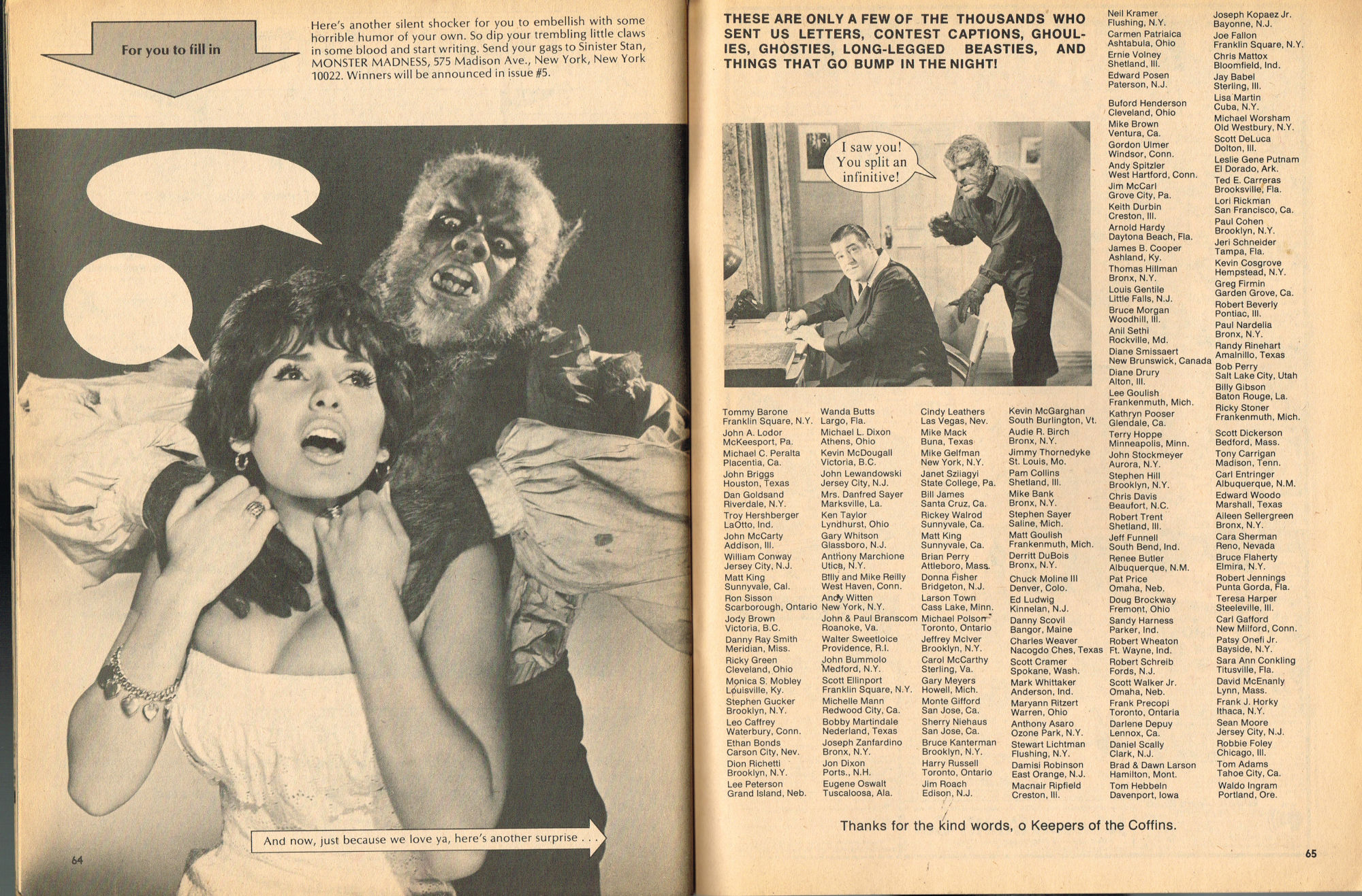 By issue 3 of Marvel's Monster Madness, it looks like the editors realized a magazine solely comprised of funny photos was no longer enough. Monsterkids, nurtured on Famous Monsters of Filmland, were growing up: they needed more meat on those monster bones to gnaw on. In this issue, aside from the many two-page photo spreads, you'll find articles on movie reviews, the Creature from the Black Lagoon as the Monster of the Month, the Fear-Fables of Robert Block, and Marvel's Werewolf by Night. Unfortunately, this would be the last issue, but Marvel would soon bring forth Monsters of the Movies to the crowded newsstands and spinner racks.