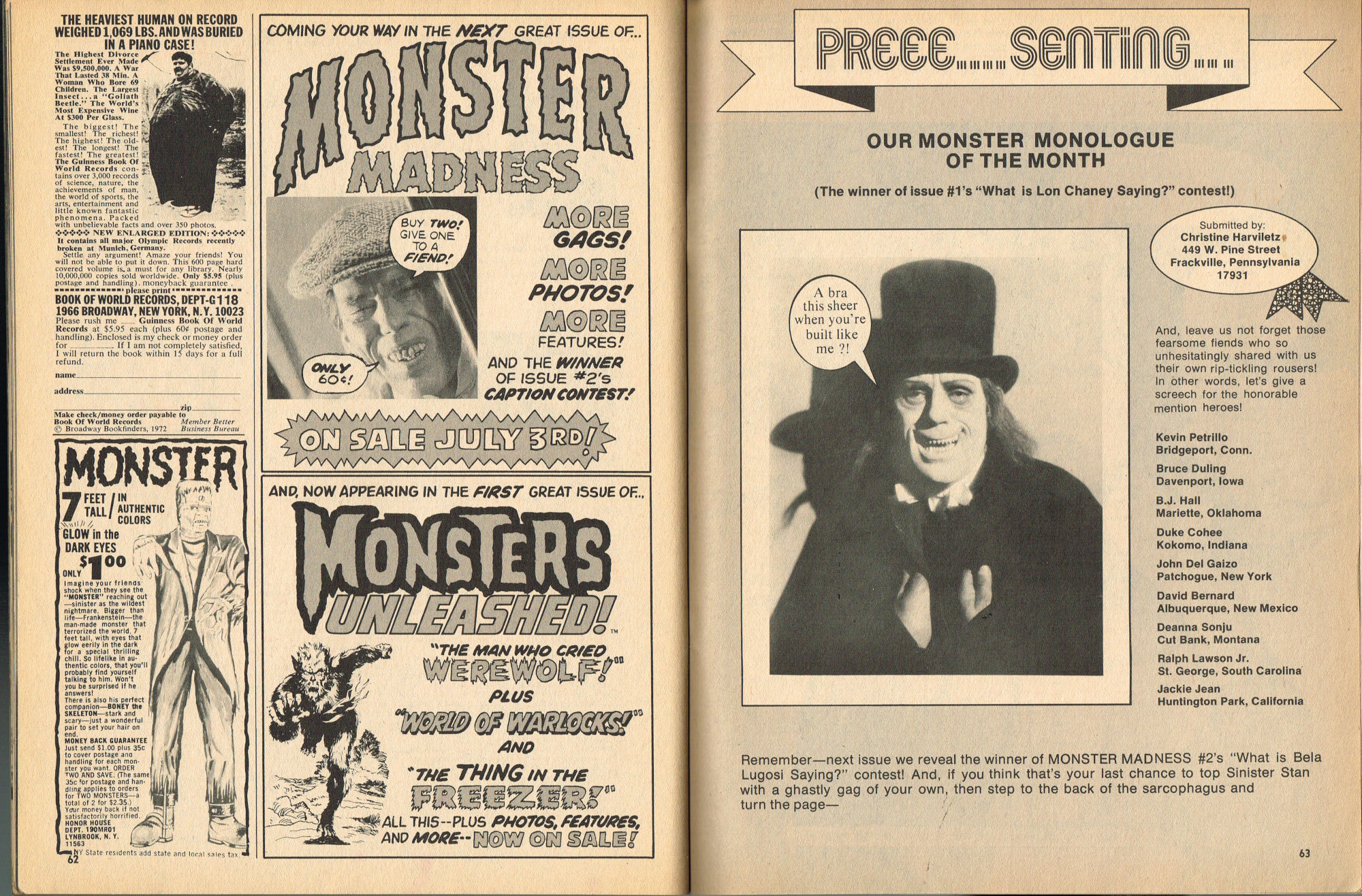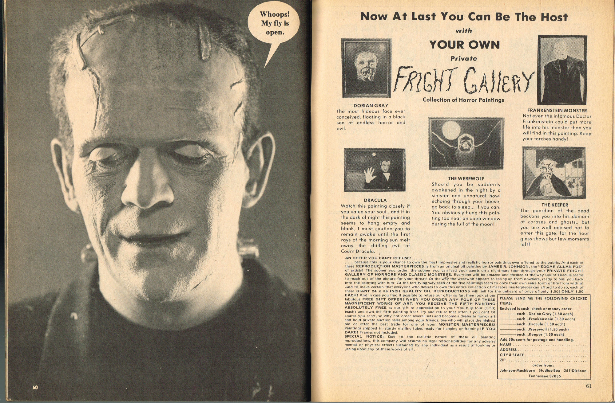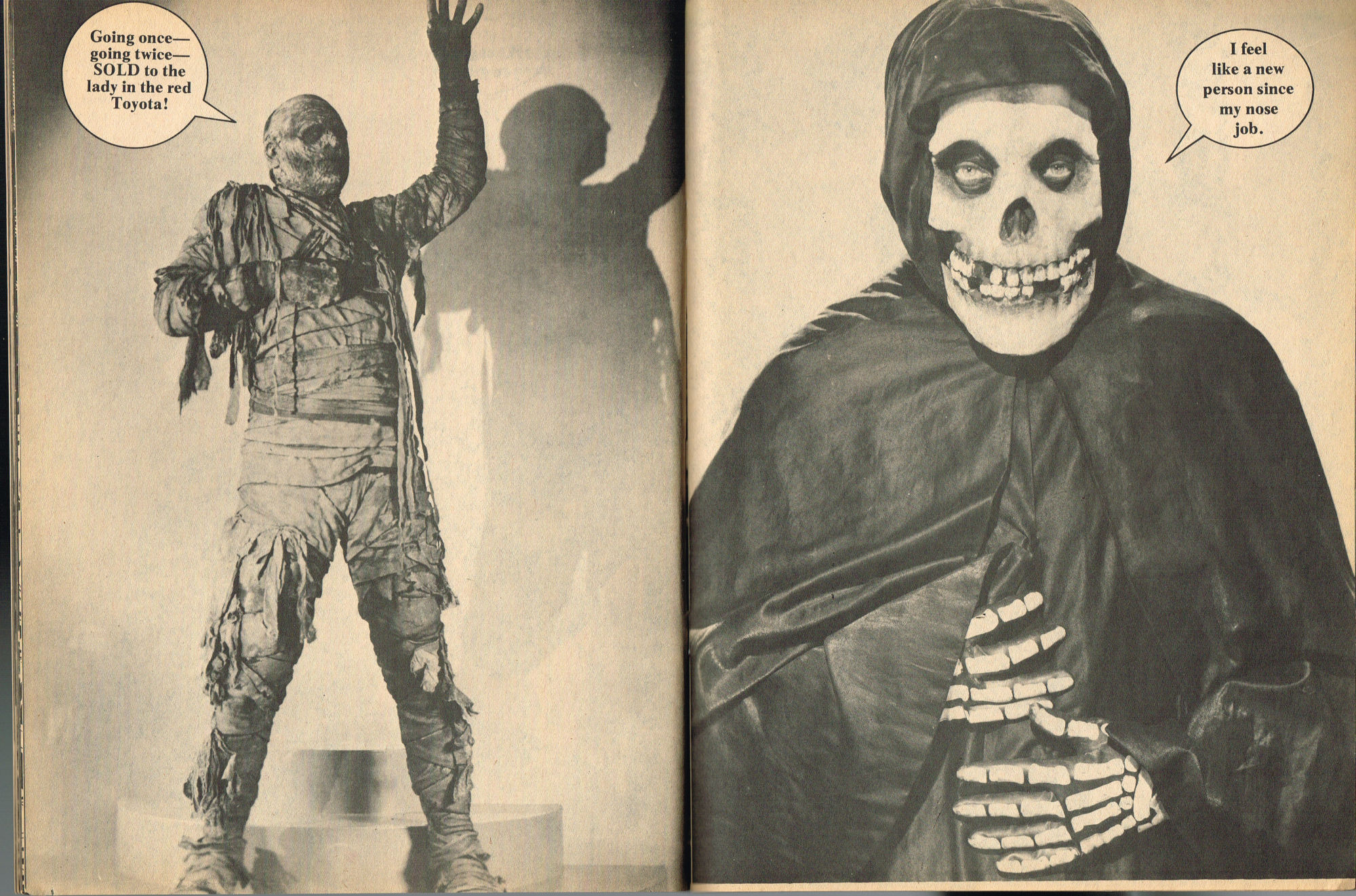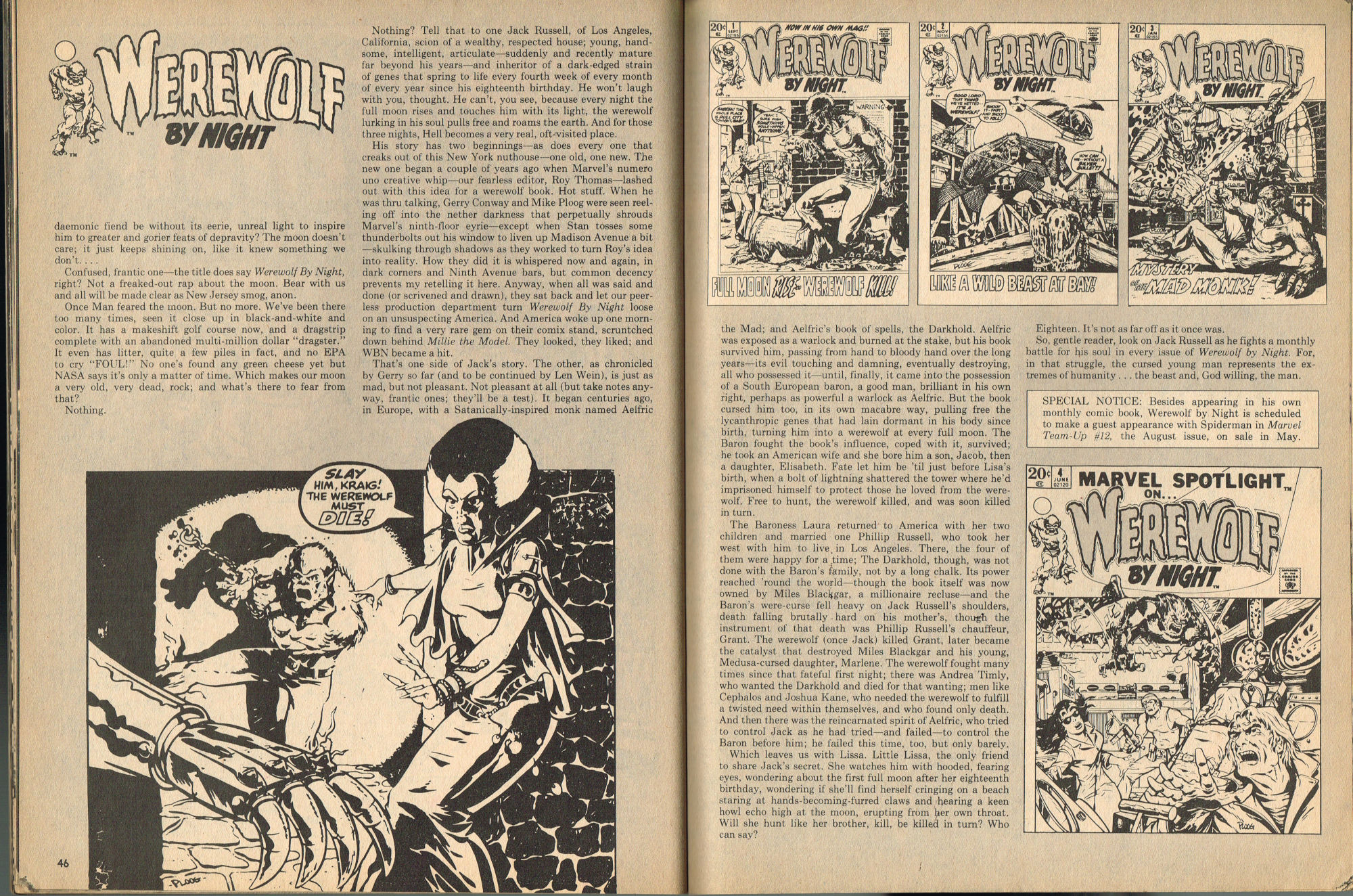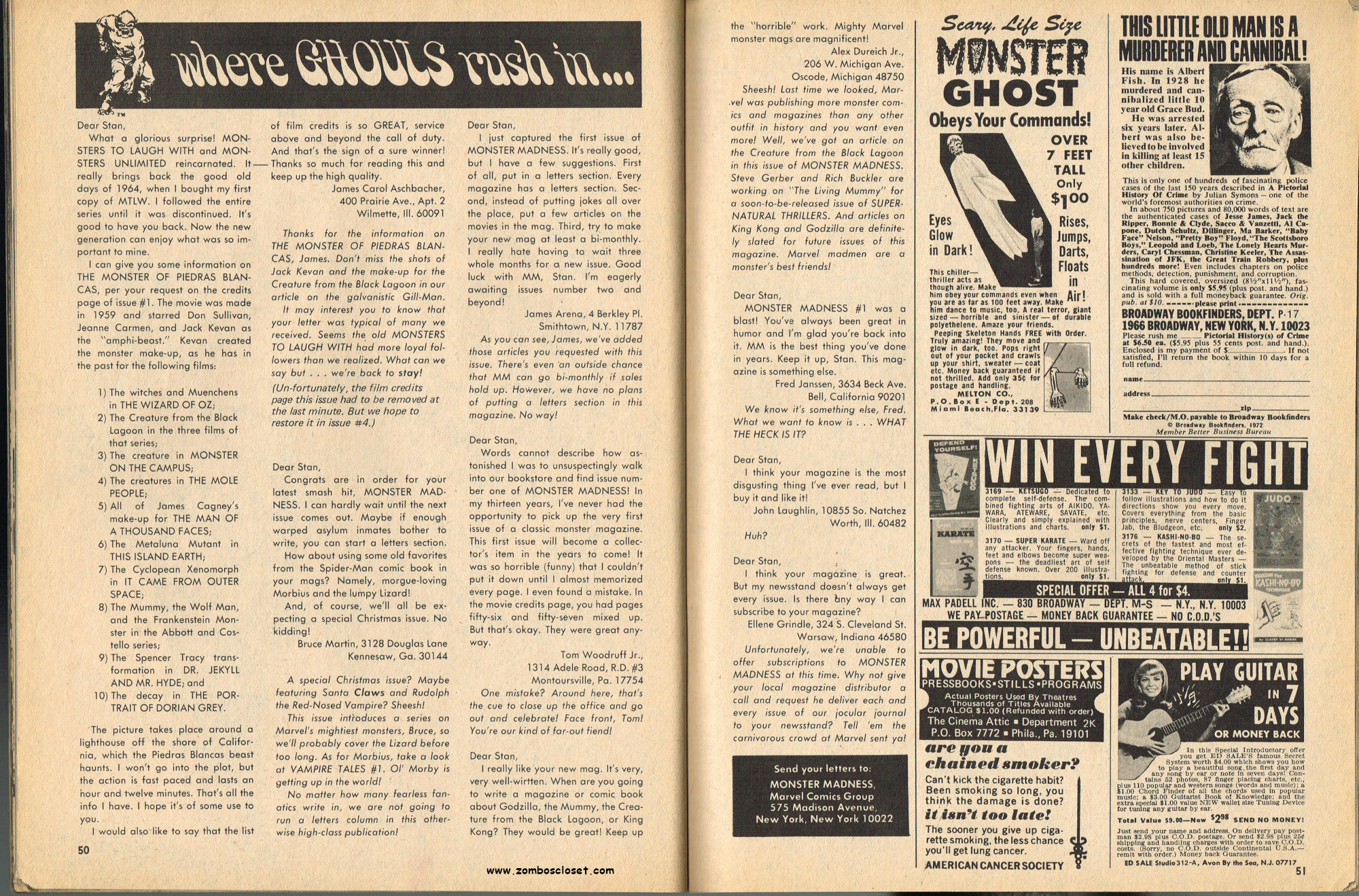 By issue 3 of Marvel's Monster Madness, it looks like the editors realized a magazine solely comprised of funny photos was no longer enough. Monsterkids, nurtured on Famous Monsters of Filmland, were growing up: they needed more meat on those monster bones to gnaw on. In this issue, aside from the many two-page photo spreads, you'll find articles on movie reviews, the Creature from the Black Lagoon as the Monster of the Month, the Fear-Fables of Robert Block, and Marvel's Werewolf by Night. Unfortunately, this would be the last issue, but Marvel would soon bring forth Monsters of the Movies to the crowded newsstands and spinner racks.