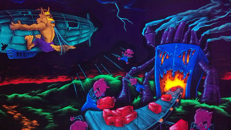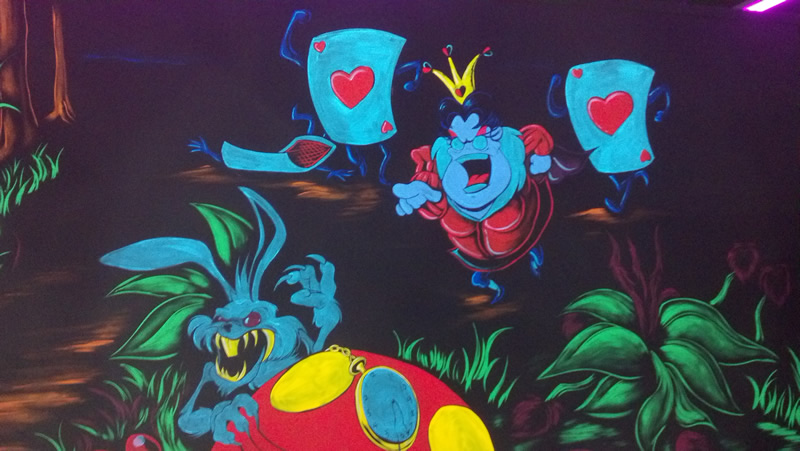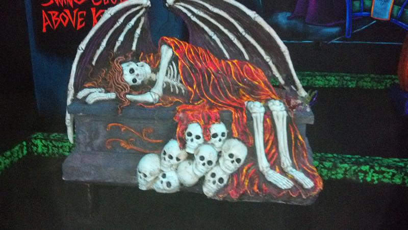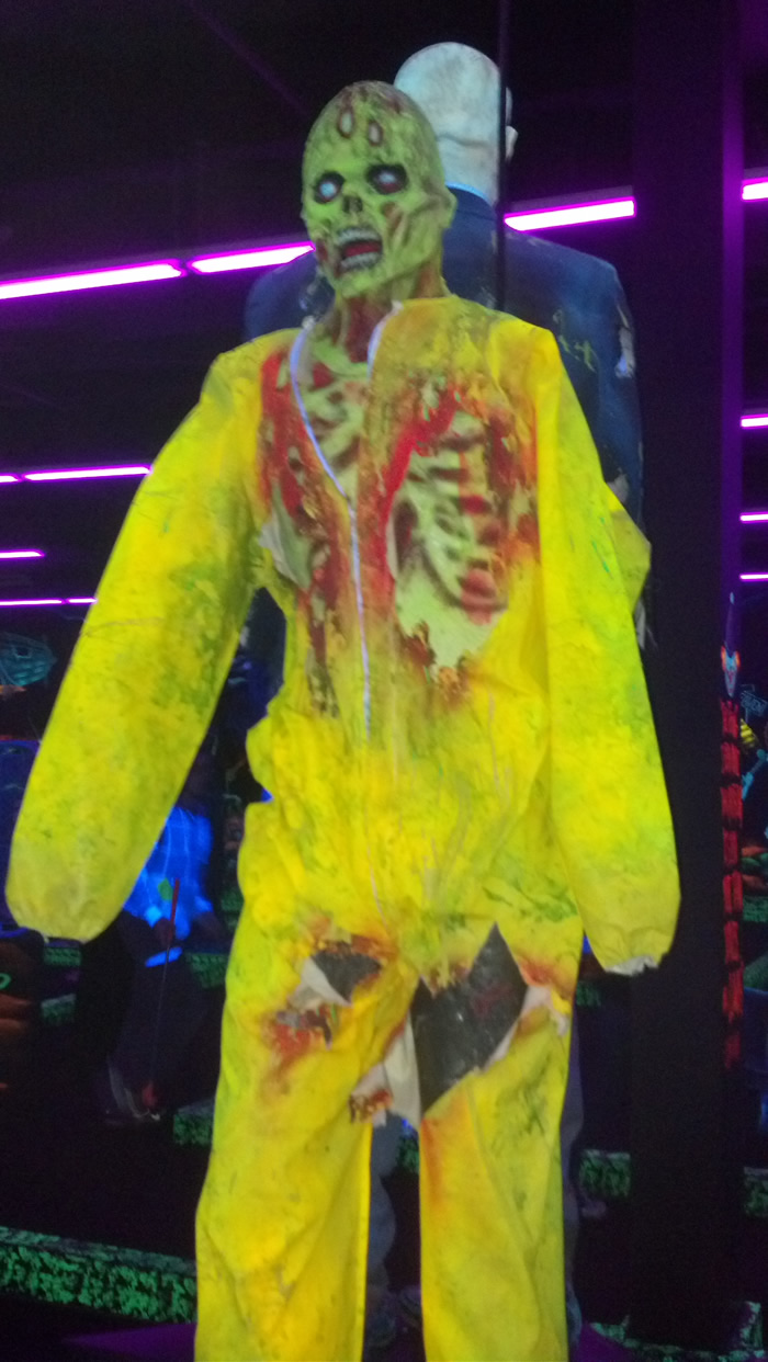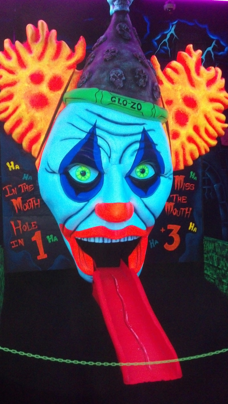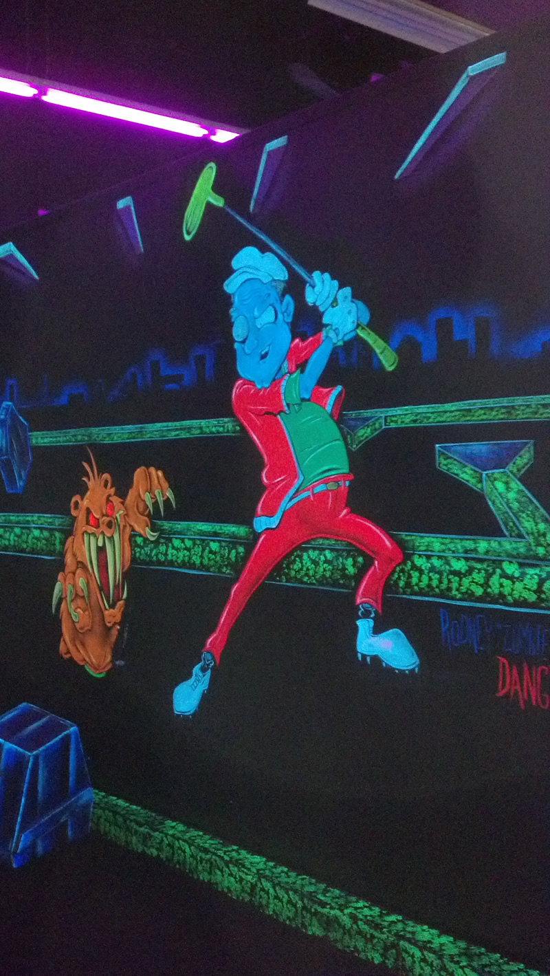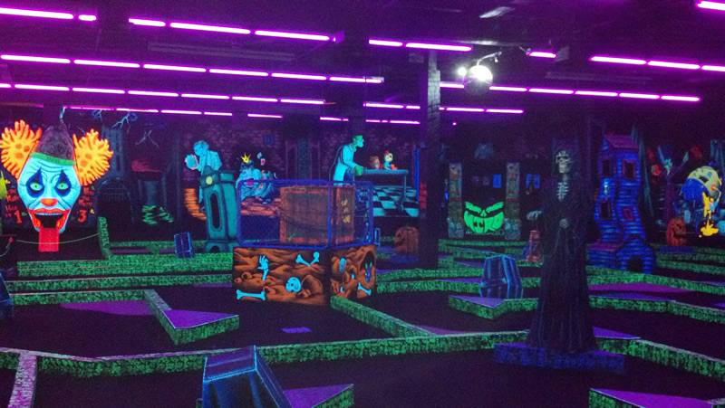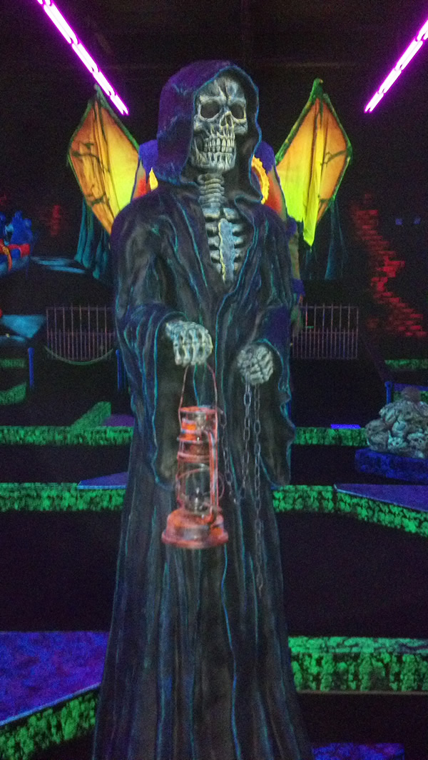 Over the holiday weekend I paid my first visit to the Monster Mini Golf franchise. Didn't realize they set the mood with black light, otherwise I'd have worn my Dr. Strange t-shirt, which would have been glowingly awesome. The mini golf is tricky because they force you to do a lot of bank shots, but the graphically-inspired environment is superb for horror fans. Here are some shots I took of the more saliently spooky highlights.