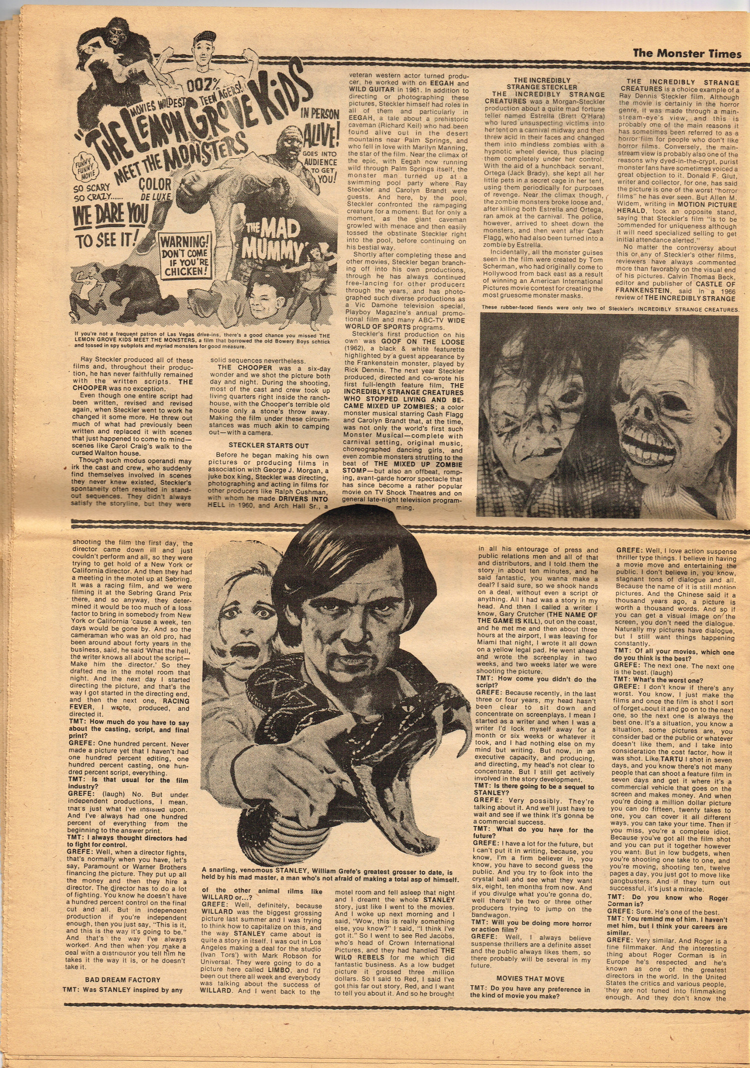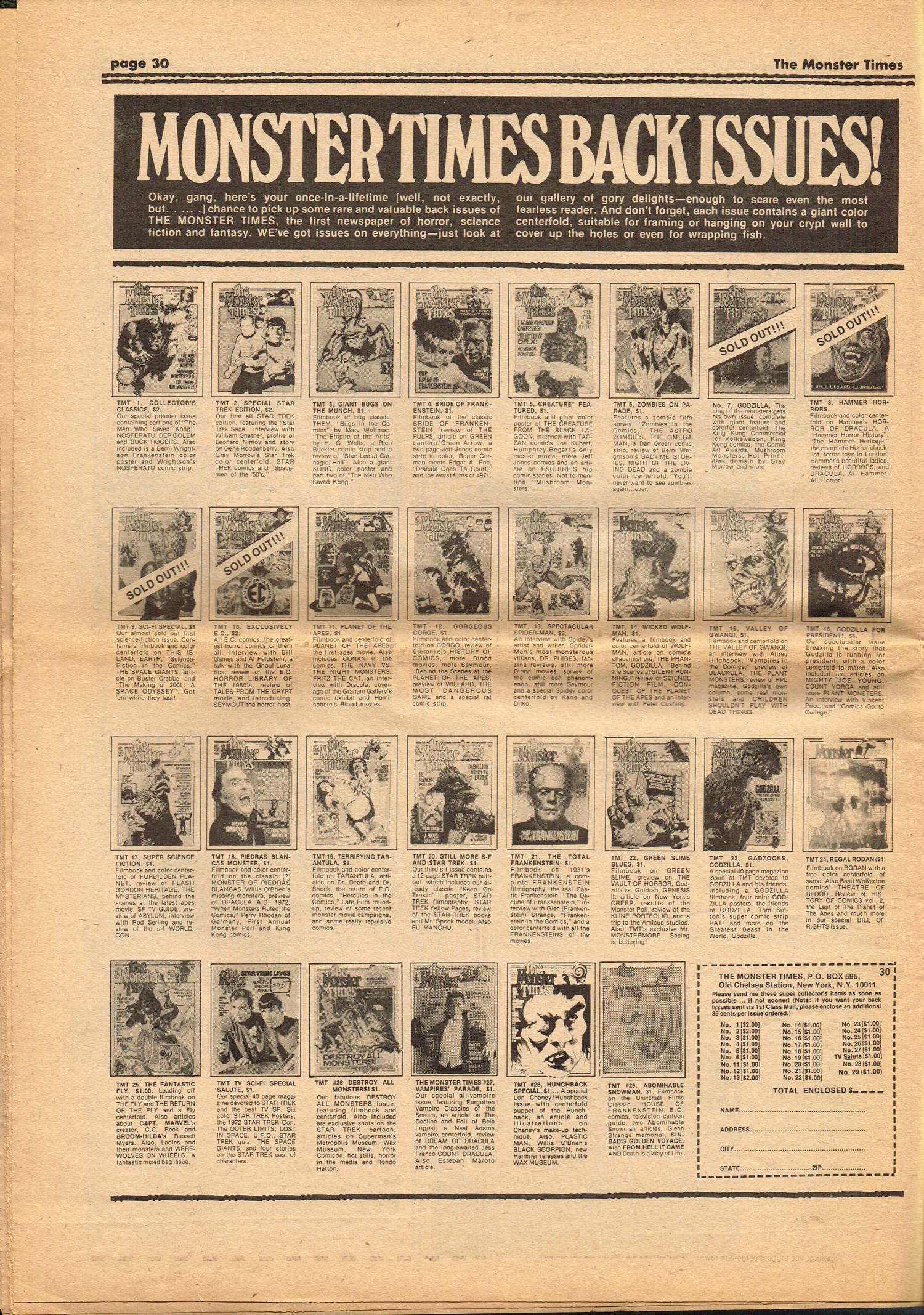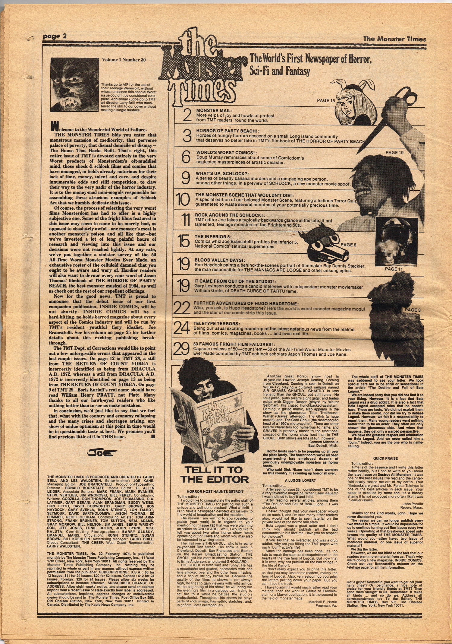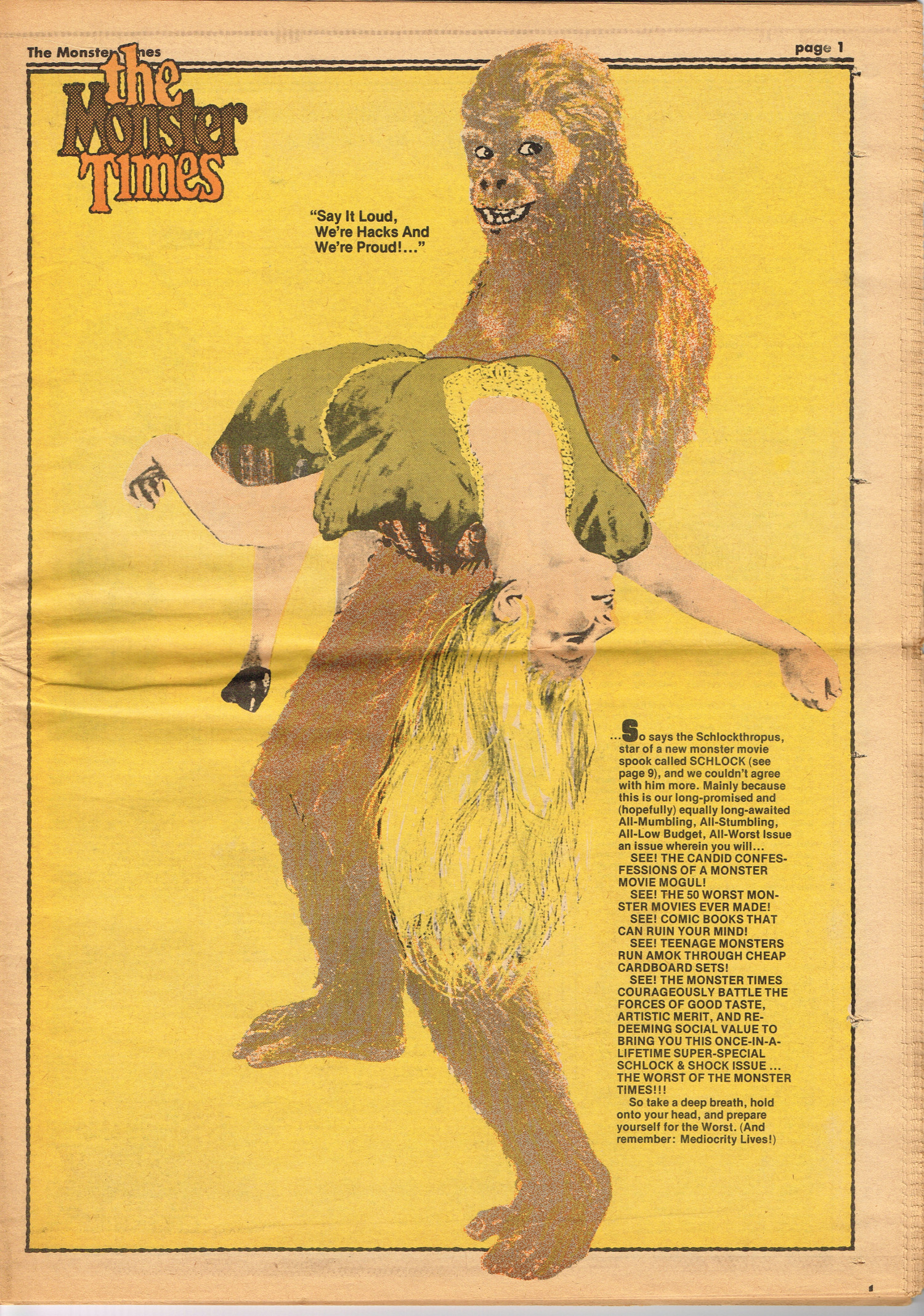 Issue 30 of The Monster Times gives Long Island a bad rap by providing way too much coverage on The Horror of Party Beach, annoys comic book fans with an assessment of The World's Worst Comics, and goes ape over John Landis's Schlock. Continuing the schlock motif, Joe Kane explores the 1950s teenage-slanted horror movies, with perhaps a bit more negativity than is warranted, and William Grefe (the director of Stanley) is interviewed. The best article is a rundown on all the really bad horror movies we can't seem to forget.