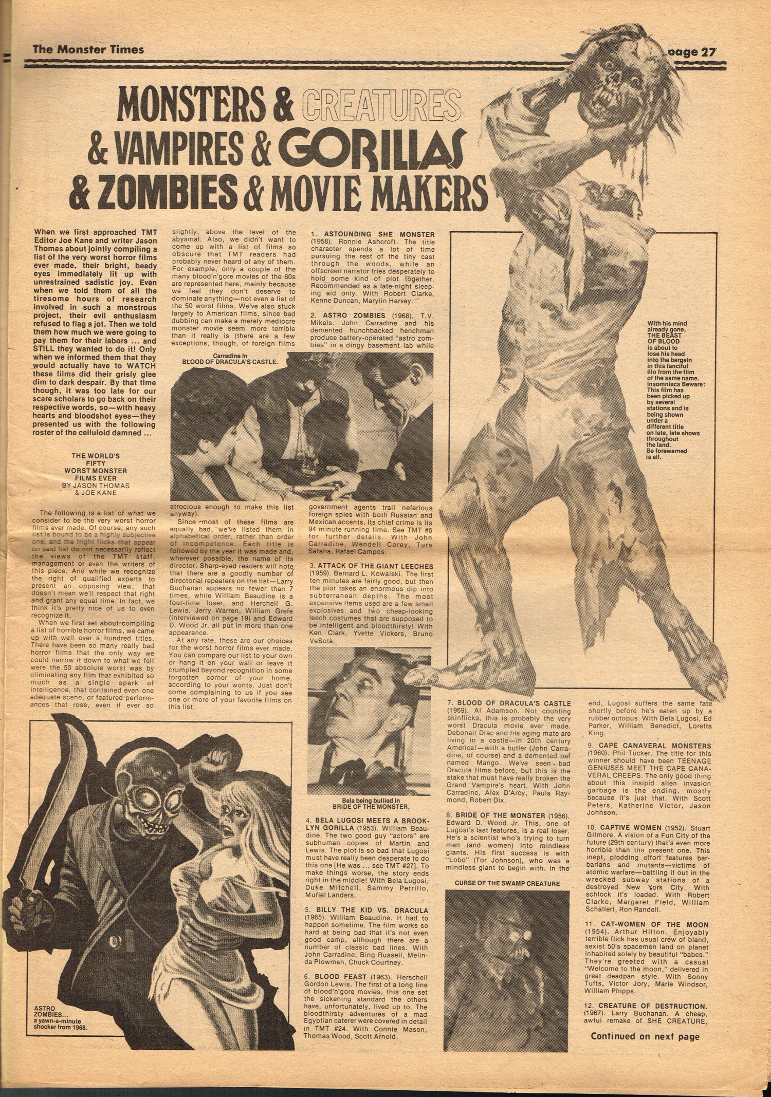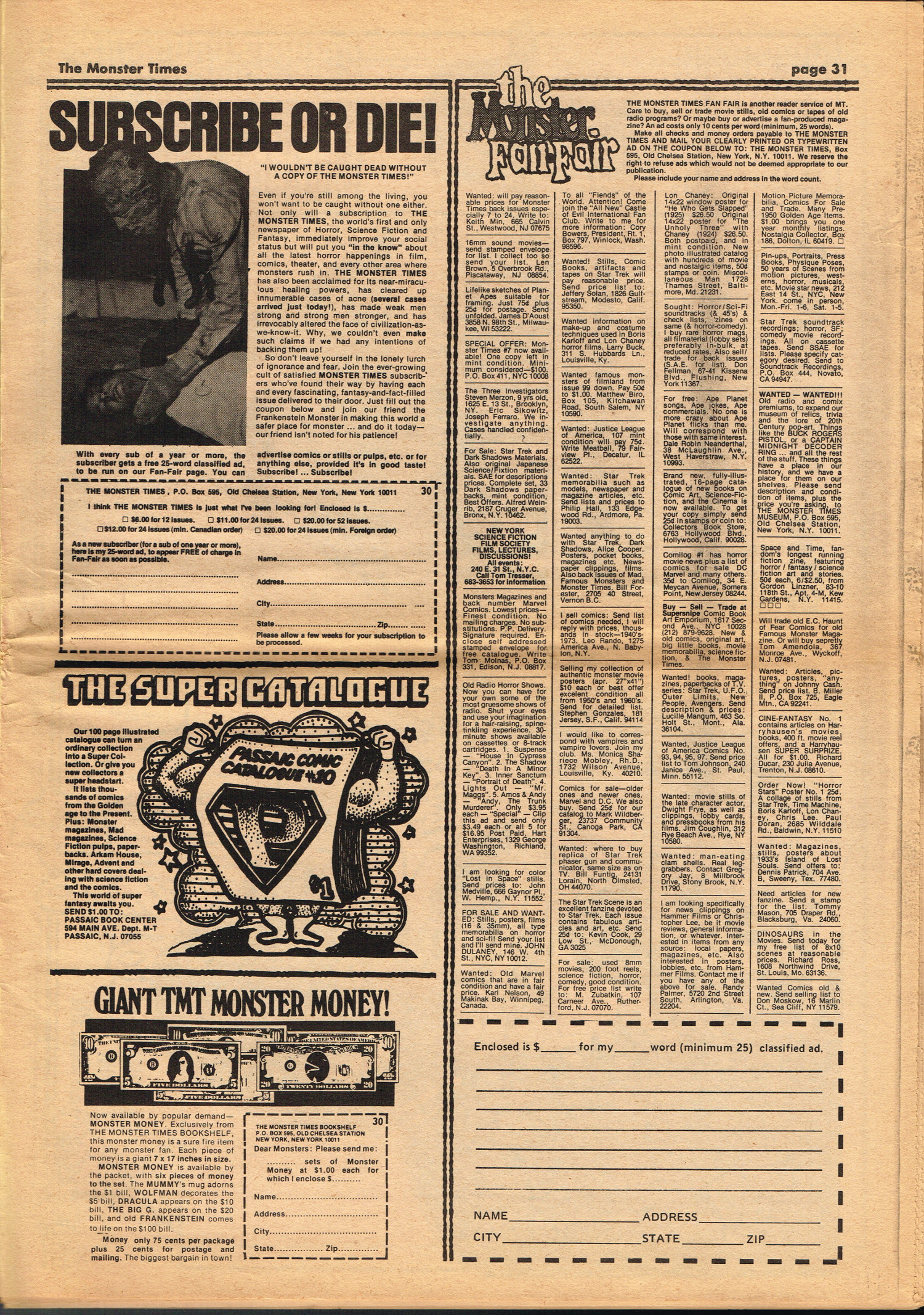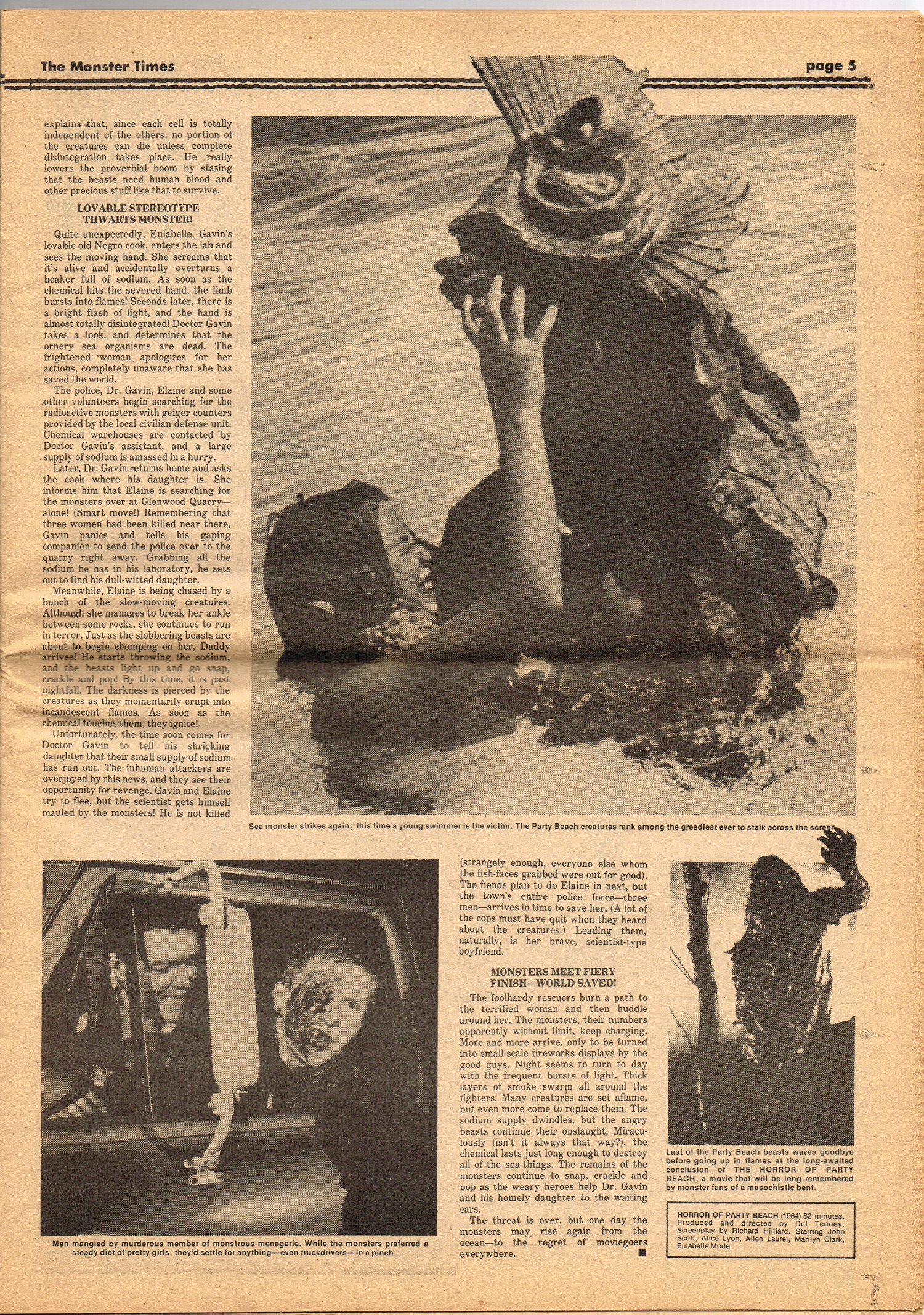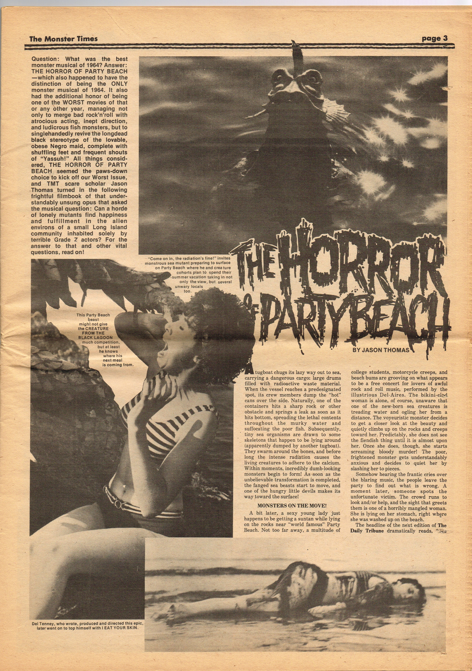 Issue 30 of The Monster Times gives Long Island a bad rap by providing way too much coverage on The Horror of Party Beach, annoys comic book fans with an assessment of The World's Worst Comics, and goes ape over John Landis's Schlock. Continuing the schlock motif, Joe Kane explores the 1950s teenage-slanted horror movies, with perhaps a bit more negativity than is warranted, and William Grefe (the director of Stanley) is interviewed. The best article is a rundown on all the really bad horror movies we can't seem to forget.