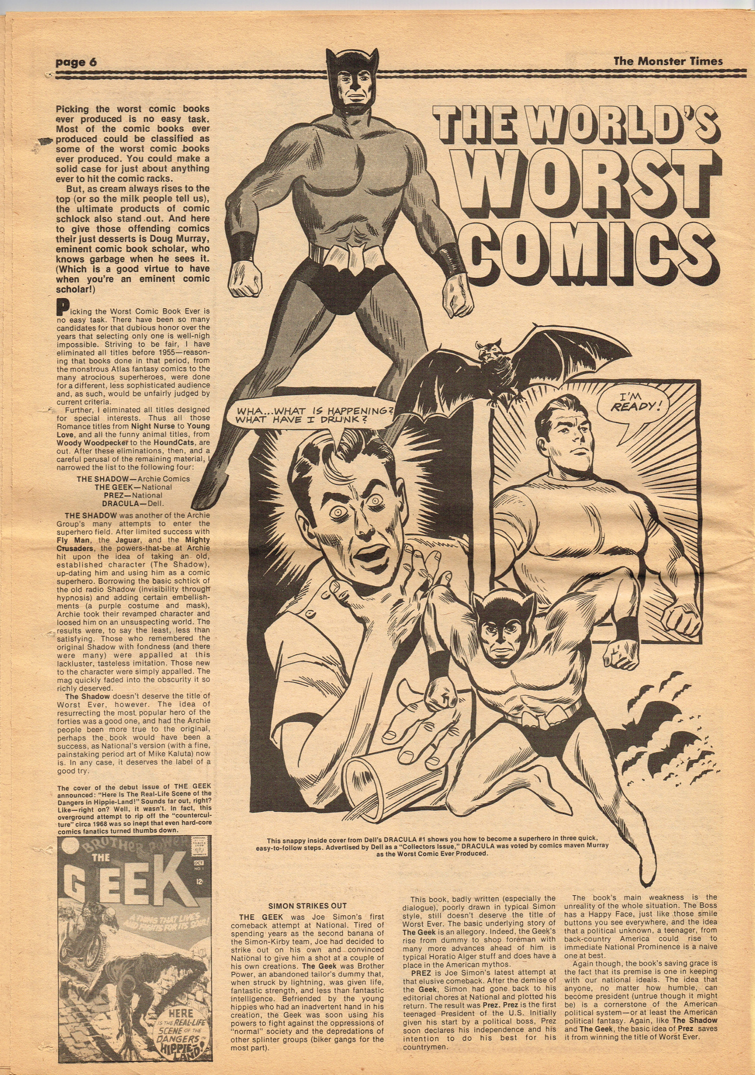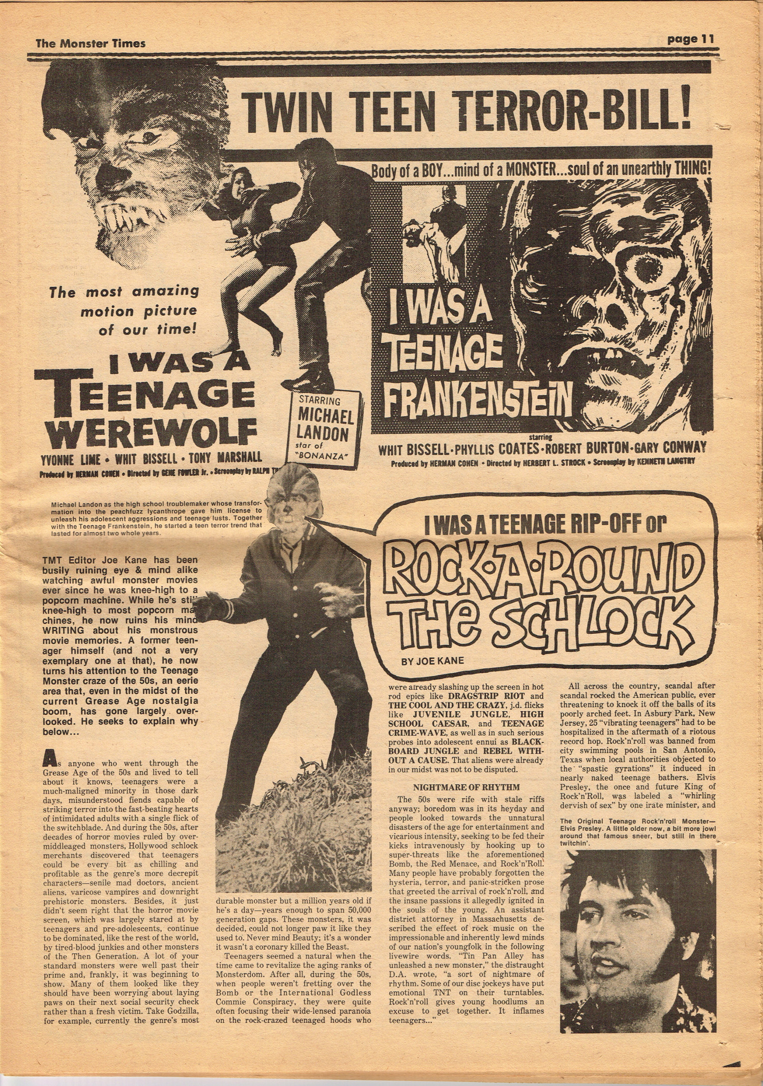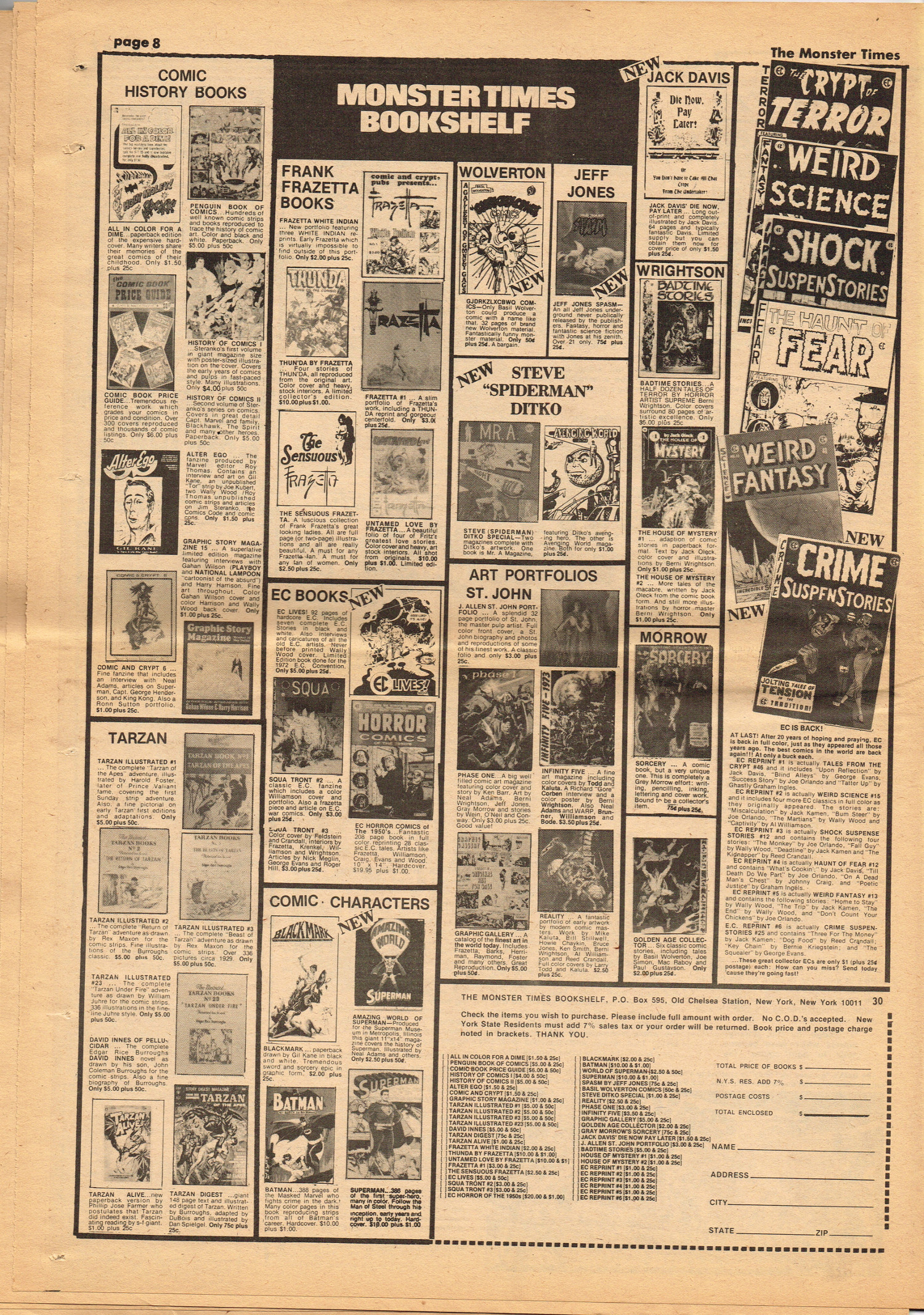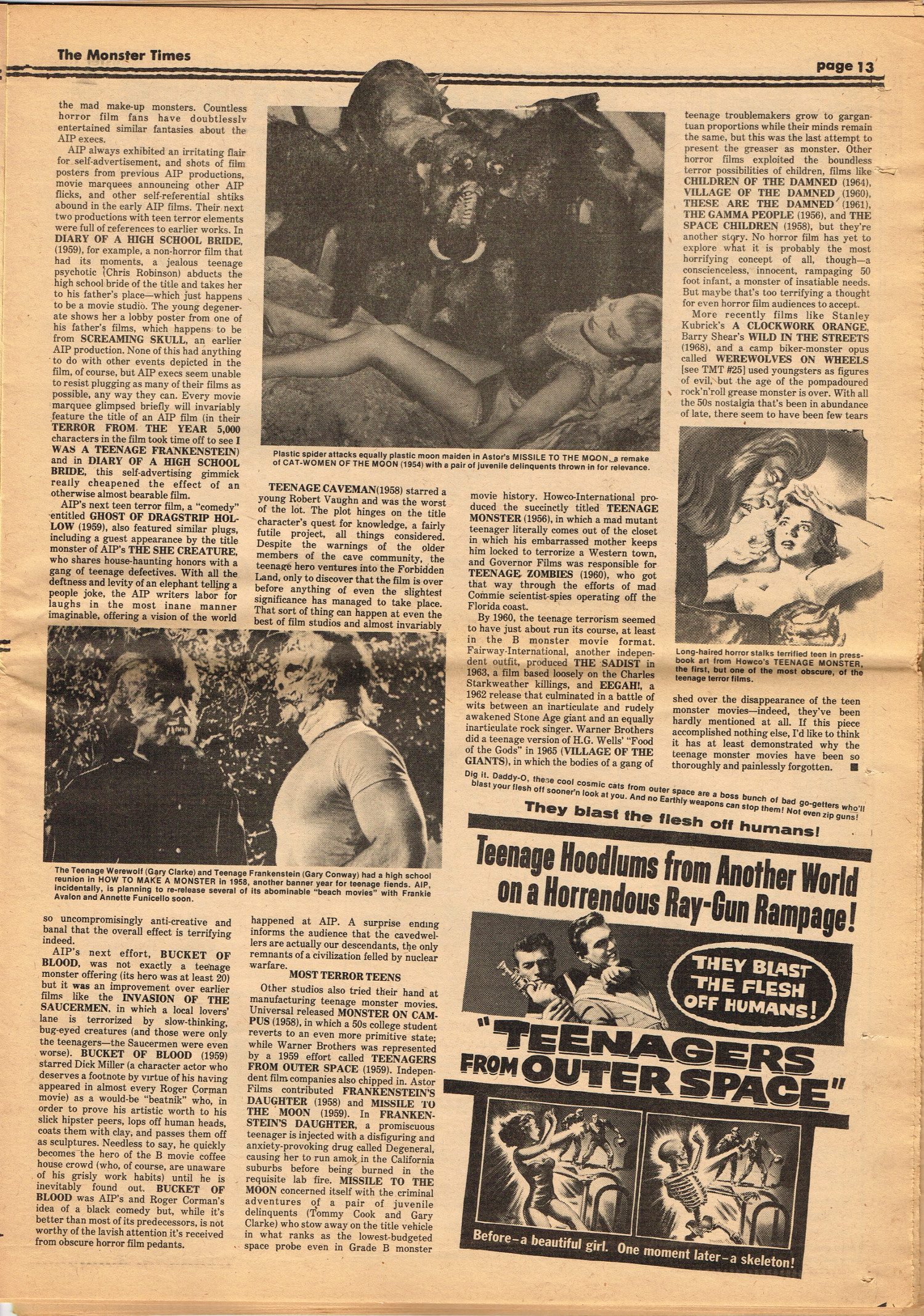 Issue 30 of The Monster Times gives Long Island a bad rap by providing way too much coverage on The Horror of Party Beach, annoys comic book fans with an assessment of The World's Worst Comics, and goes ape over John Landis's Schlock. Continuing the schlock motif, Joe Kane explores the 1950s teenage-slanted horror movies, with perhaps a bit more negativity than is warranted, and William Grefe (the director of Stanley) is interviewed. The best article is a rundown on all the really bad horror movies we can't seem to forget.