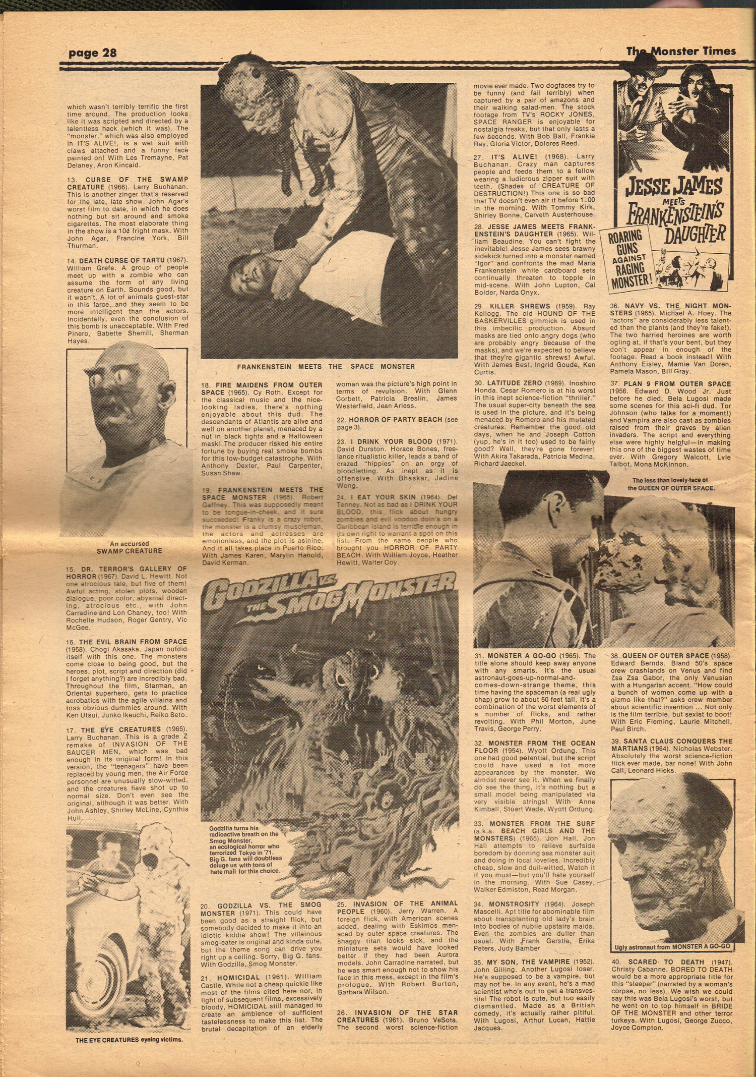 Issue 30 of The Monster Times gives Long Island a bad rap by providing way too much coverage on The Horror of Party Beach, annoys comic book fans with an assessment of The World's Worst Comics, and goes ape over John Landis's Schlock. Continuing the schlock motif, Joe Kane explores the 1950s teenage-slanted horror movies, with perhaps a bit more negativity than is warranted, and William Grefe (the director of Stanley) is interviewed. The best article is a rundown on all the really bad horror movies we can't seem to forget.