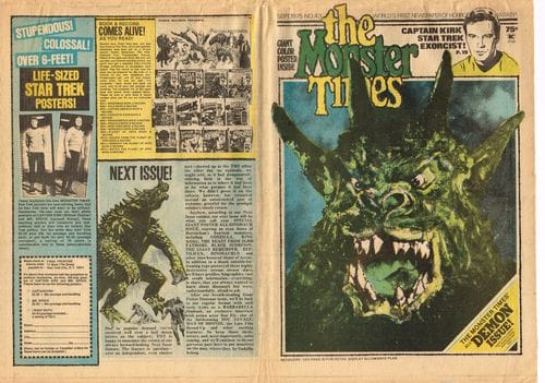 Issue 43 of The Monster Times looks at demons and devils in movies and comics. The Exorcist, Rosemary's Baby, Night of the Demon, Haxan, and a lot of lesser demons and devils get face time. Those Lousy Lovecraft Films ponders why demons leave home, and Ban It Yourself Exorcism Products takes a page or two out of Cracked's For Monsters Only book of zany. Even Captain Kirk gets into the action (he always did, didn't he?) with a rundown on all the devils banished in Star Trek. A first rate TMT issue, entertaining and informative, all around. By 1975, the monsterkid craze was a fond memory, but it had mutated into something greater: now it was the time of the monsterteens, who gobbled up everything on comics and contemporary horror movies they could sink their teeth into.