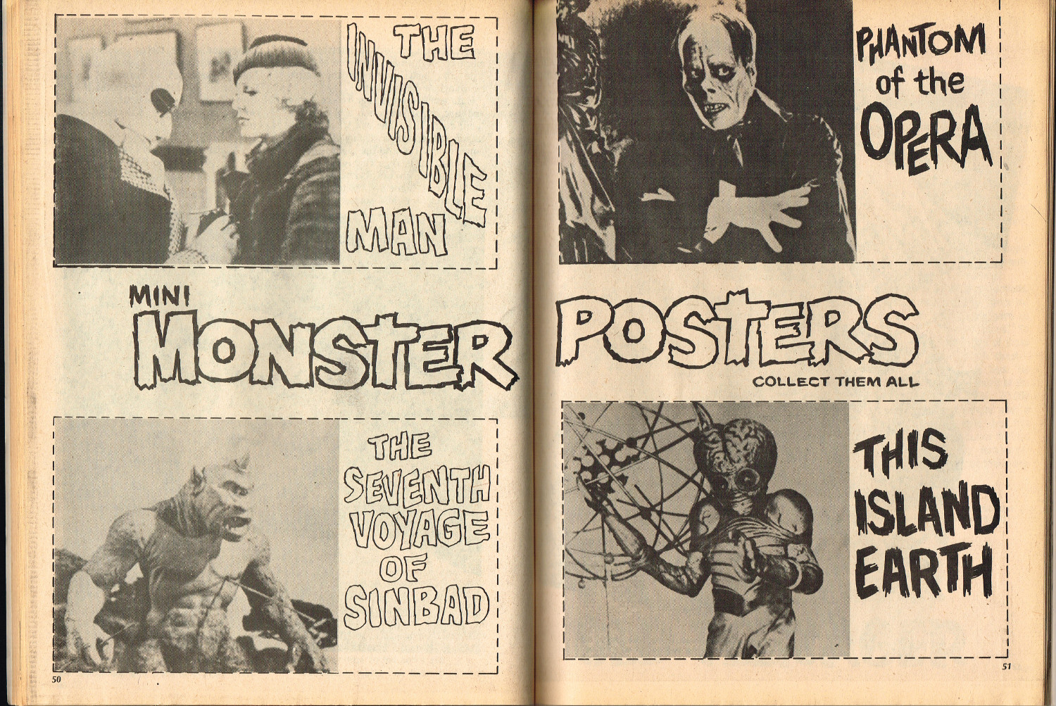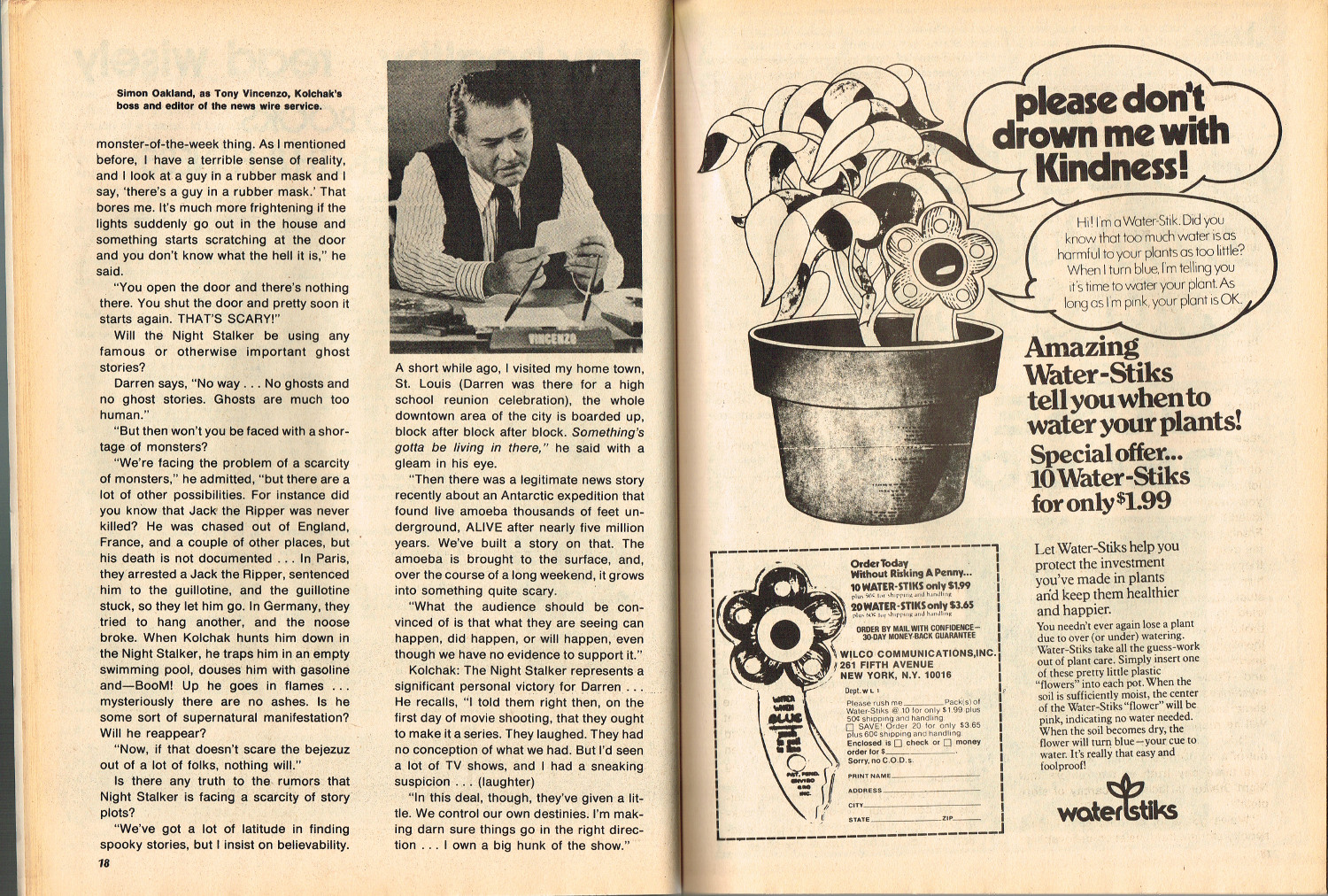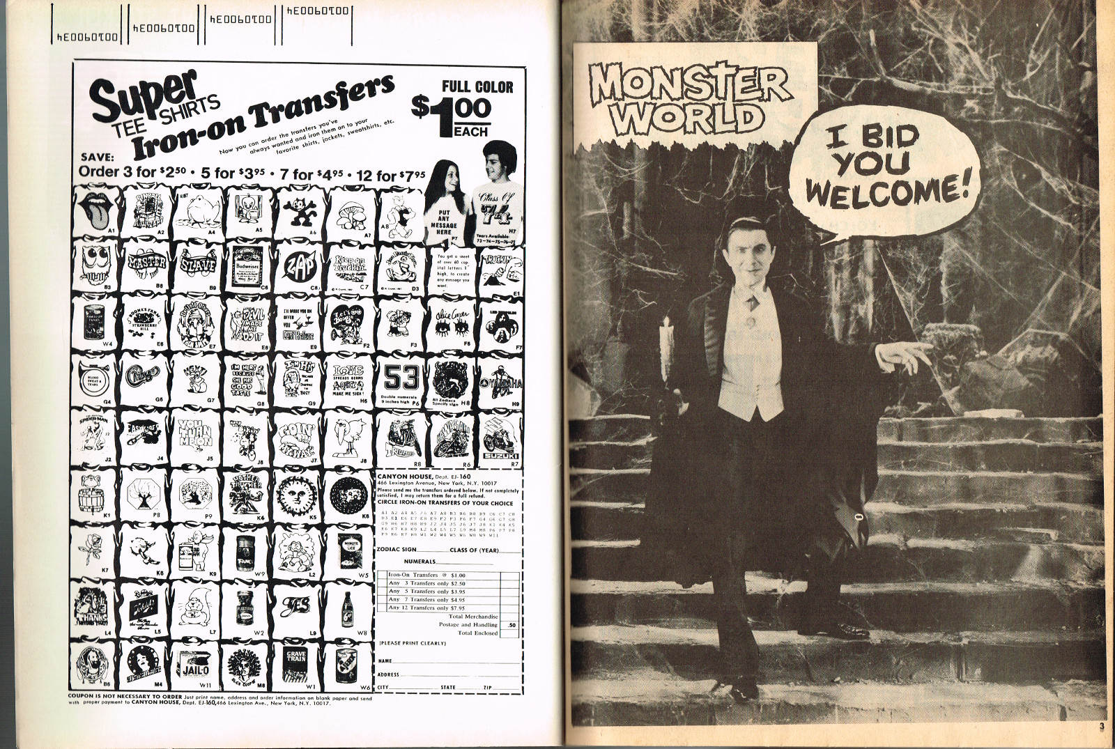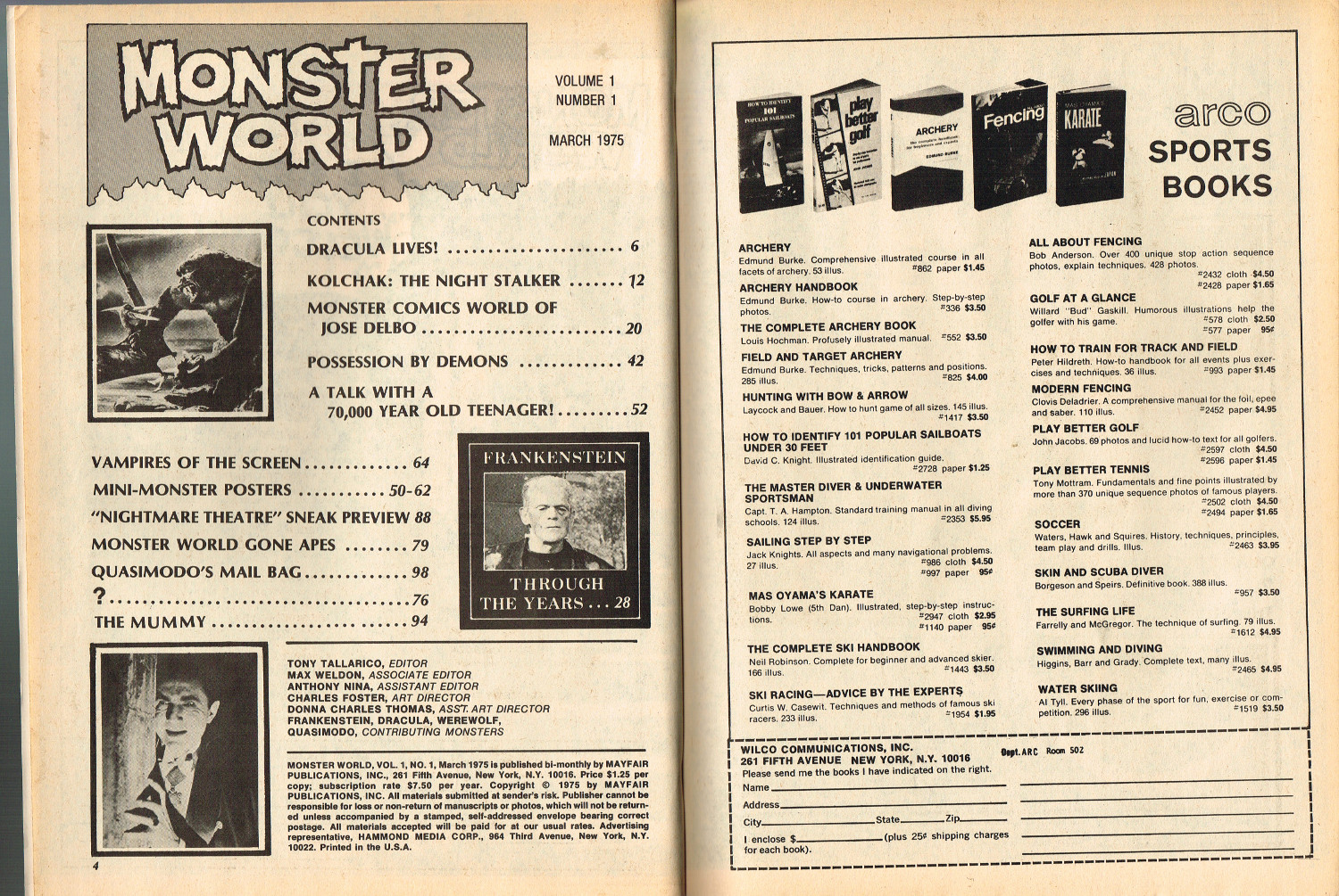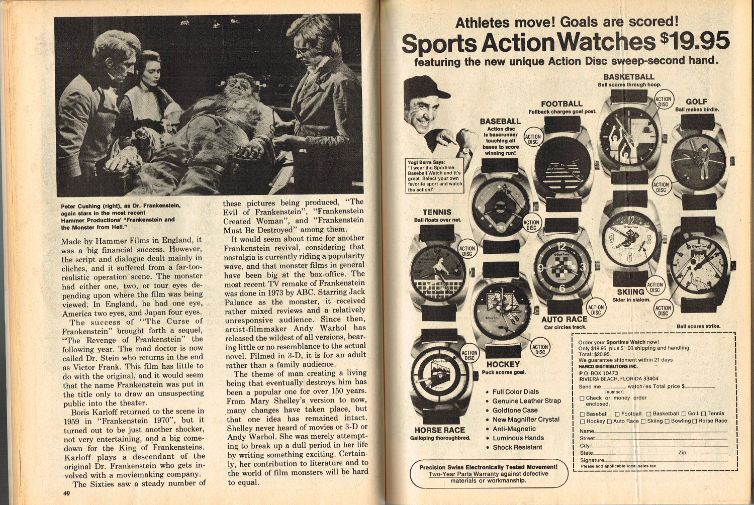 After reading Cranston Macmillan's Quasimodo's Monster Magazine chapter in the recently released 70s Monster Memories (yup, shameless plug here!), I dug out my first issue of Quasi's, which was called Monster World. At least for the first three issues, then it changed title to Quasimodo's Monster Magazine. It's a lot of pages if little else, but there's a charm to its simplicity (okay, poor layout and cheap printing). The covers were always to die for. In this first half of the magazine you'll read about Kolchak, The Night Stalker, The Monster Comics World of Jose Delbo, and Frankenstein, Through the Years. But nevermind that. What's really killer here are the advertising pages: you can drown your plants with love by giving them Water Stiks, stay healthy with Arco books on fitness, buy $20.00 sport action watches, plug in the miracle TV antenna (I can tell you from personal experience it sucked), and grab a fine collectible Chinese Doll (but that's in the second half of the magazine, which I'll post shortly). While other horror and monster mags had copious ads for fan-favorite merchandise, this first issue went for the wrong target audience. How terrifying!.