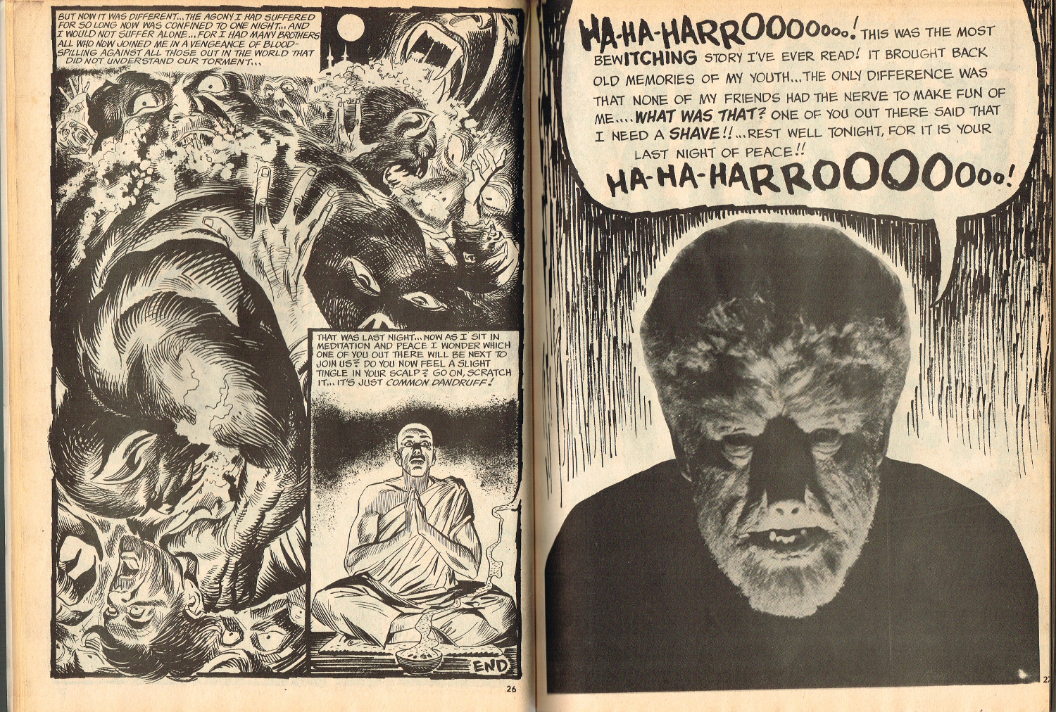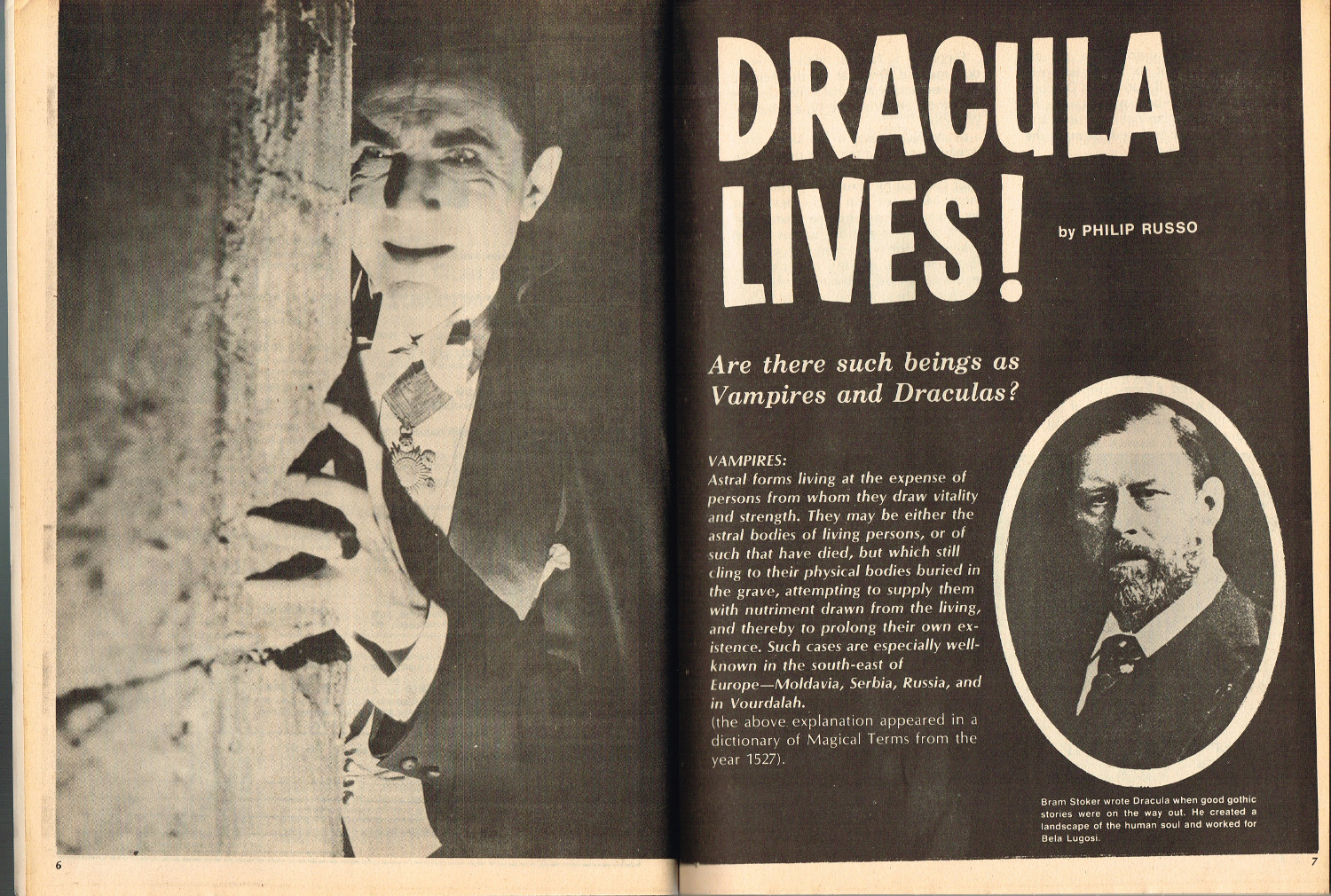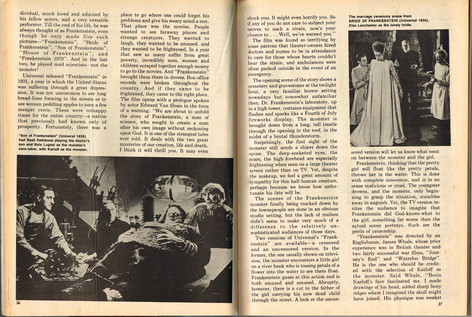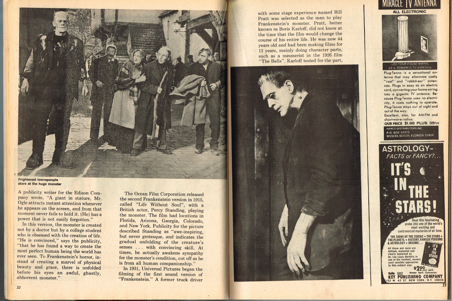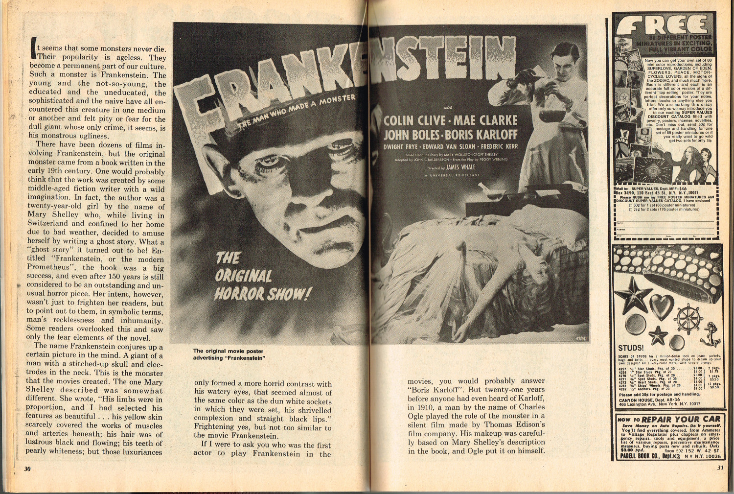 After reading Cranston Macmillan's Quasimodo's Monster Magazine chapter in the recently released 70s Monster Memories (yup, shameless plug here!), I dug out my first issue of Quasi's, which was called Monster World. At least for the first three issues, then it changed title to Quasimodo's Monster Magazine. It's a lot of pages if little else, but there's a charm to its simplicity (okay, poor layout and cheap printing). The covers were always to die for. In this first half of the magazine you'll read about Kolchak, The Night Stalker, The Monster Comics World of Jose Delbo, and Frankenstein, Through the Years. But nevermind that. What's really killer here are the advertising pages: you can drown your plants with love by giving them Water Stiks, stay healthy with Arco books on fitness, buy $20.00 sport action watches, plug in the miracle TV antenna (I can tell you from personal experience it sucked), and grab a fine collectible Chinese Doll (but that's in the second half of the magazine, which I'll post shortly). While other horror and monster mags had copious ads for fan-favorite merchandise, this first issue went for the wrong target audience. How terrifying!.