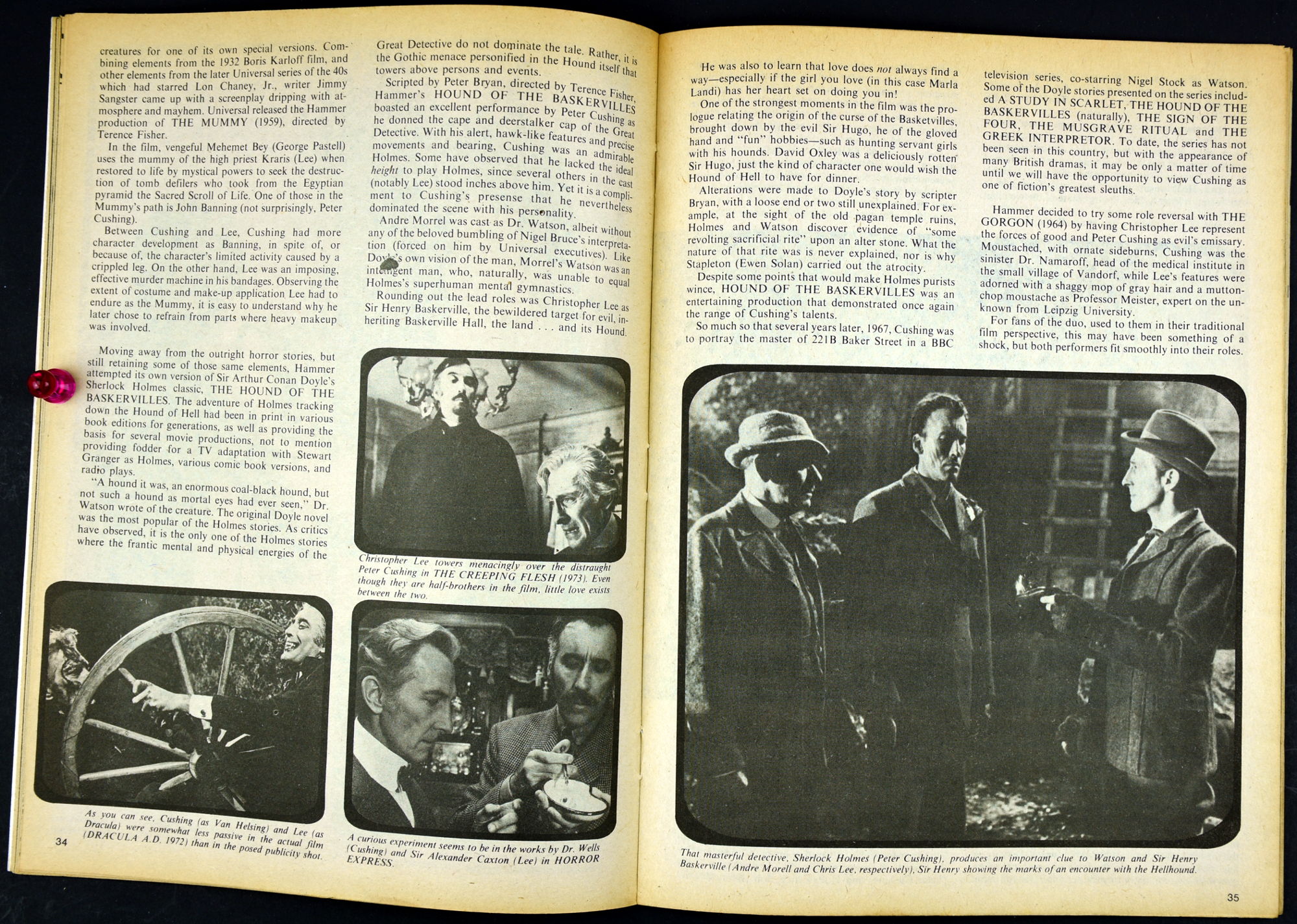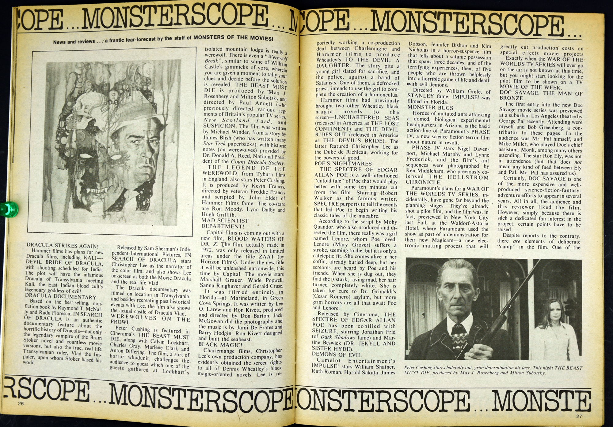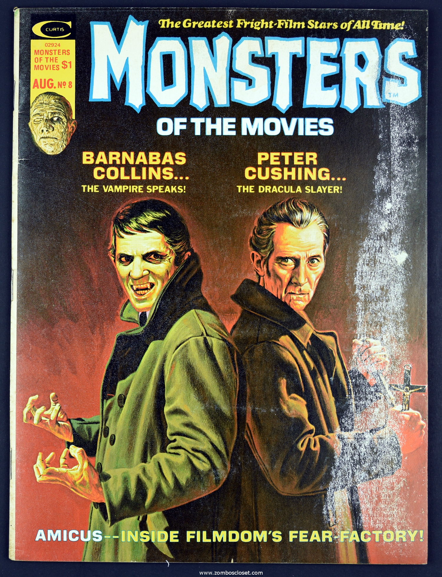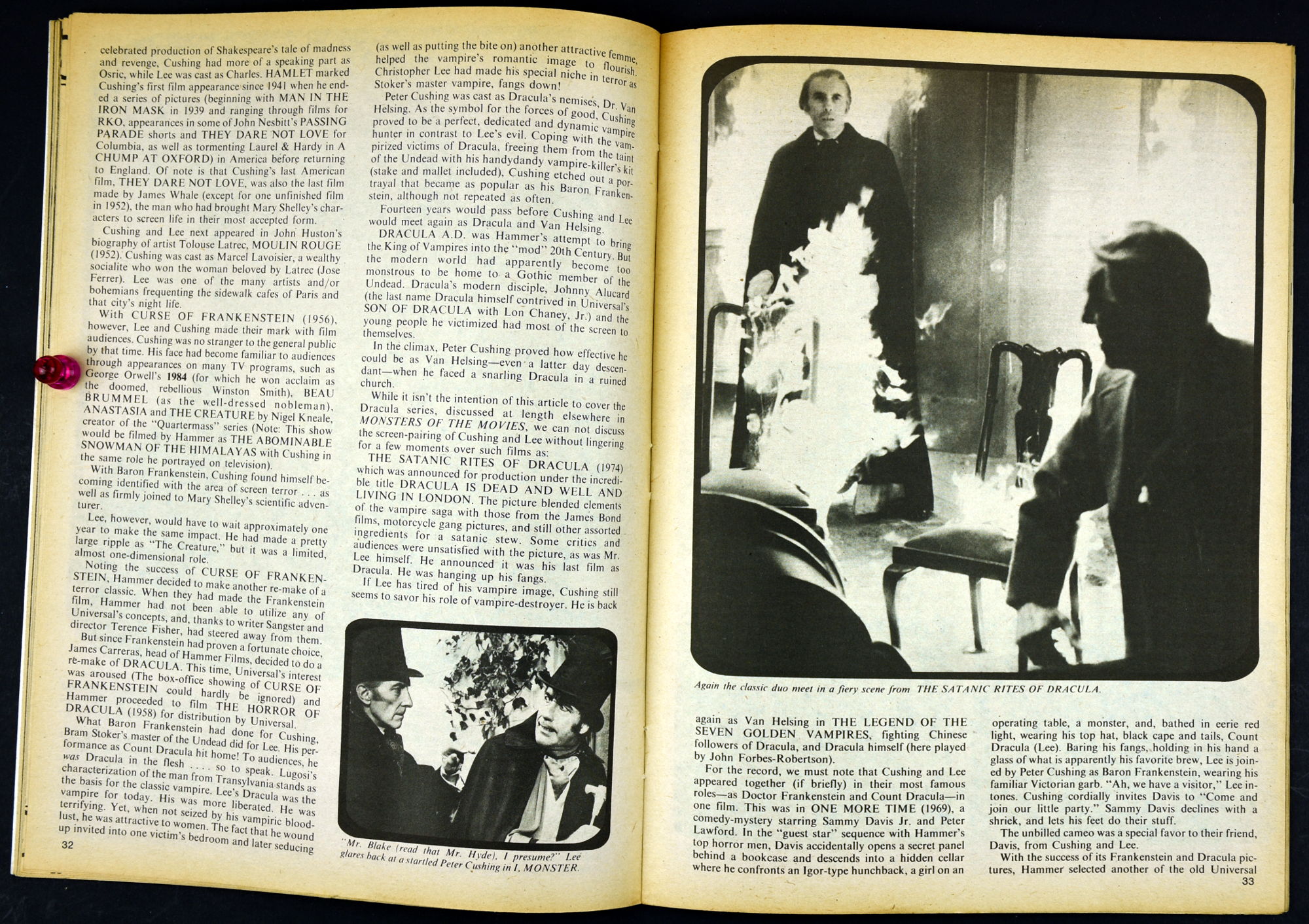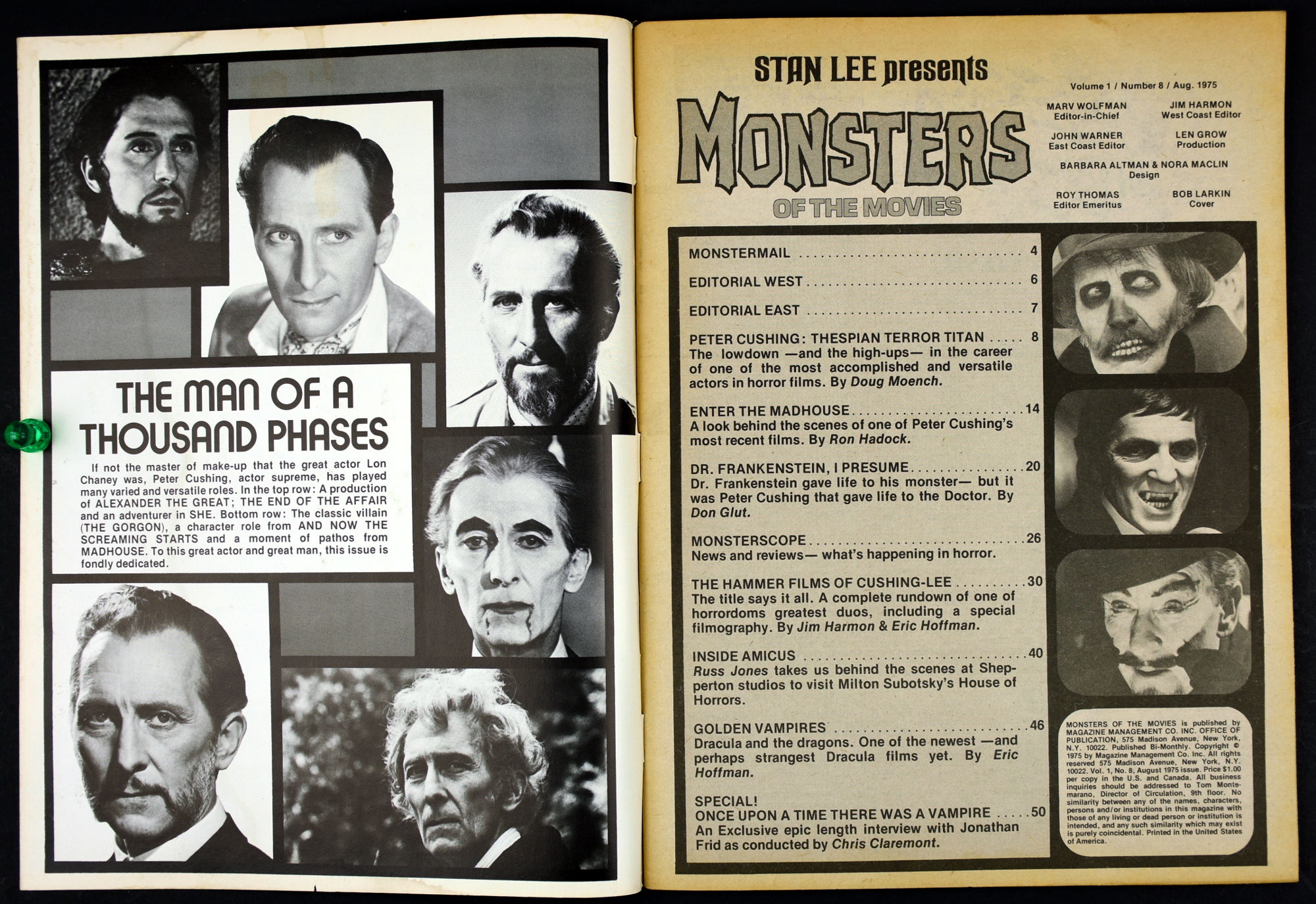Here's my slightly waterlogged copy of Monsters of the Movies issue 8. Gives it a nice monsterkid patina, don't you think? Peter Cushing, Hammer, Amicus, Jonathan Frid, and the Seven Golden Vampires light up this issue. So jump in, the water is fine.