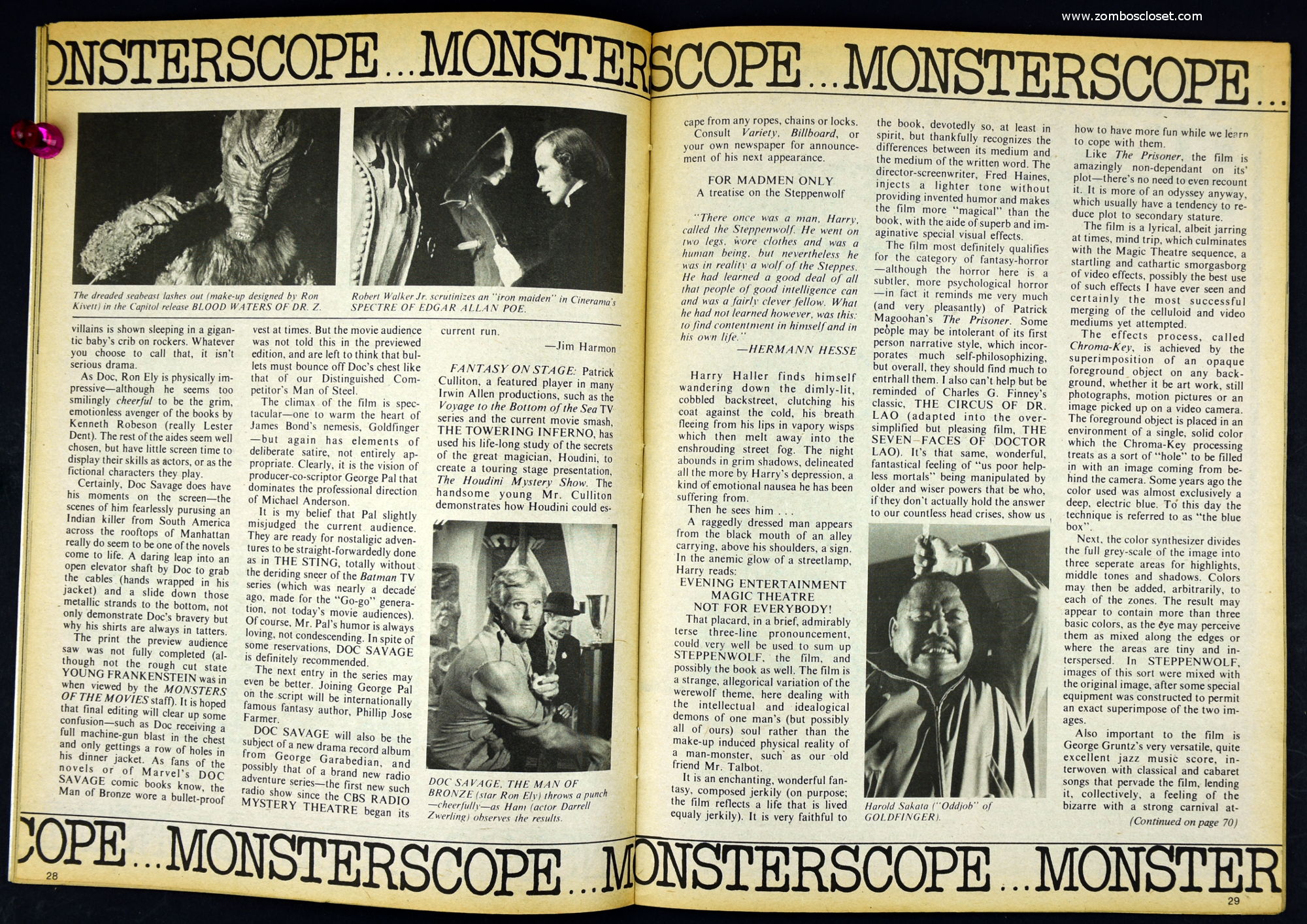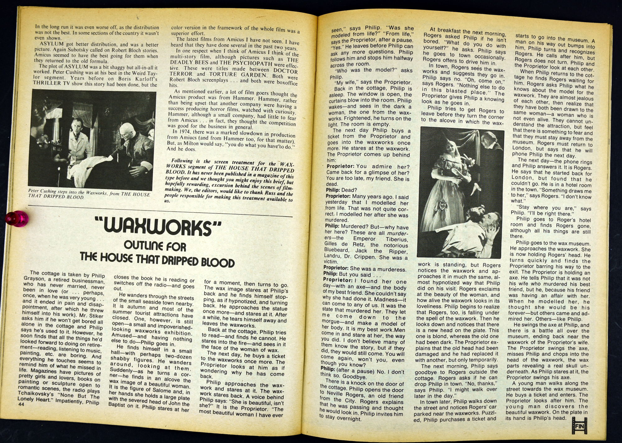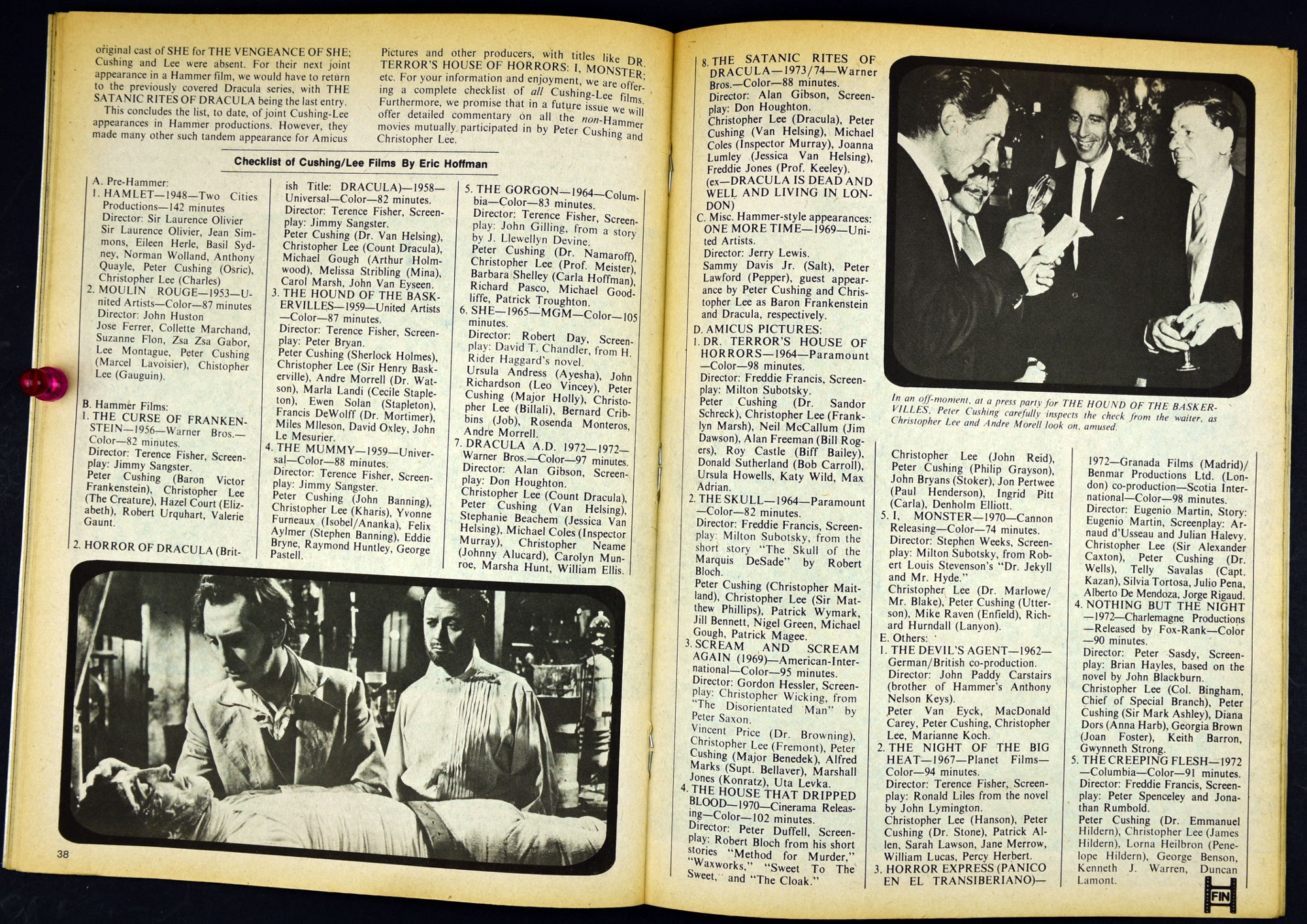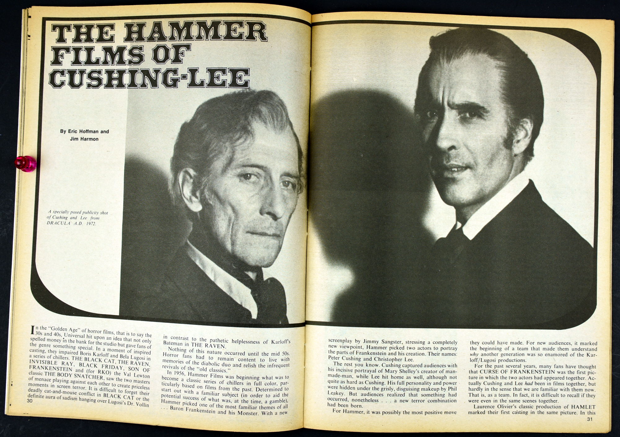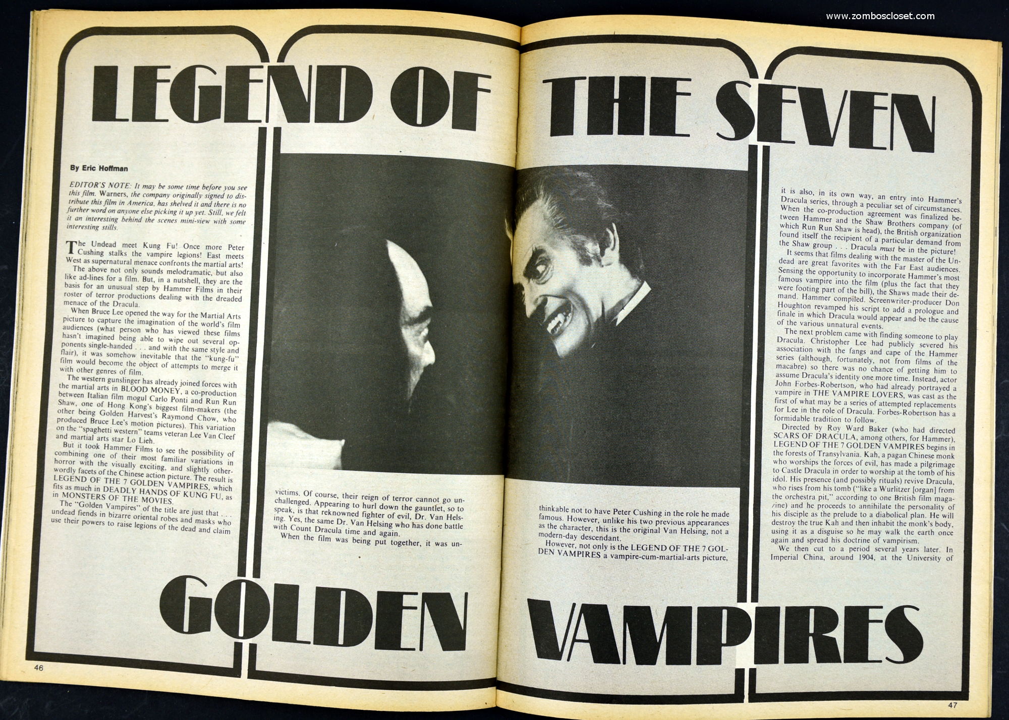 Here's my slightly waterlogged copy of Monsters of the Movies issue 8. Gives it a nice monsterkid patina, don't you think? Peter Cushing, Hammer, Amicus, Jonathan Frid, and the Seven Golden Vampires light up this issue. So jump in, the water is fine.